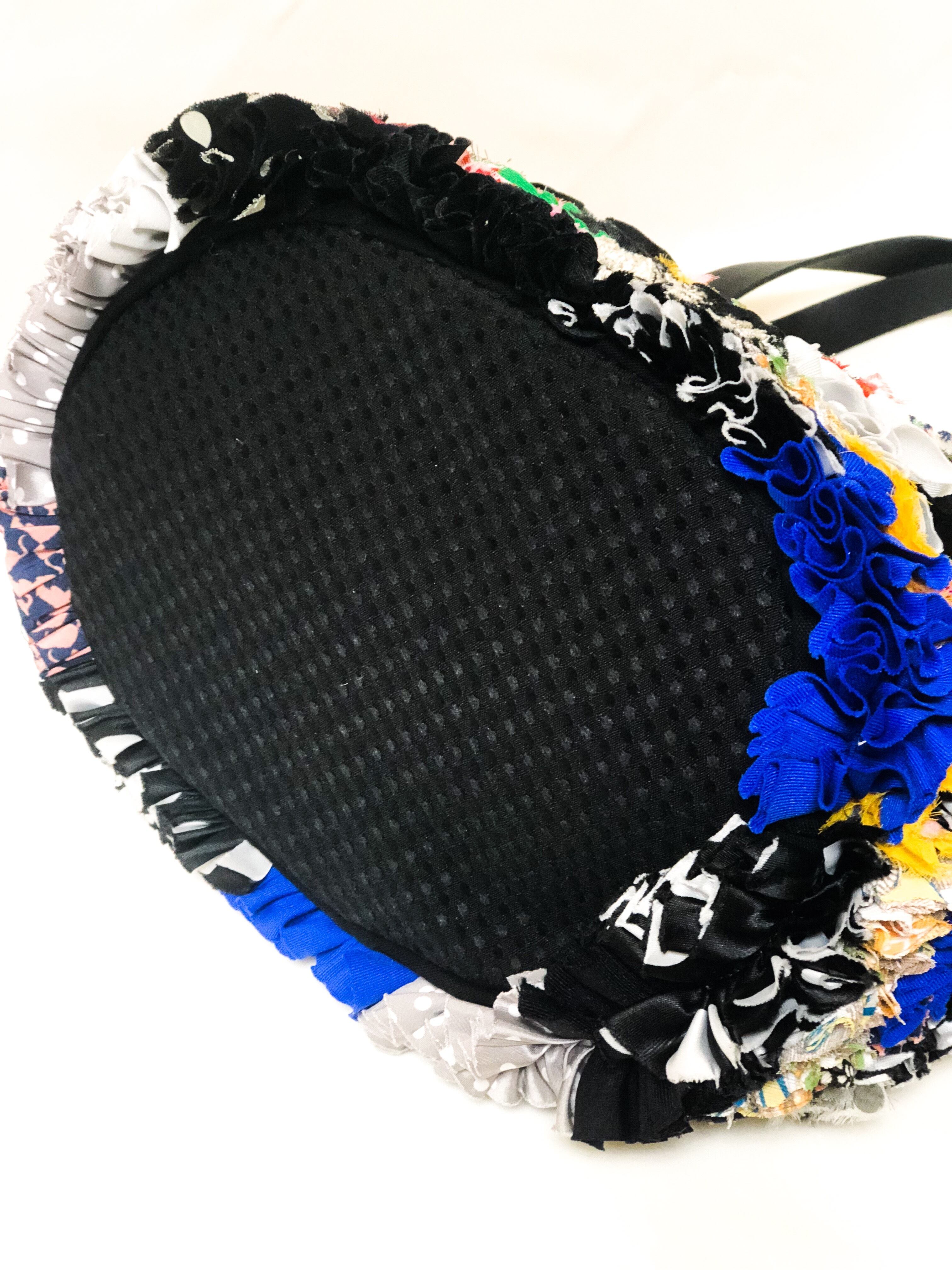 様々な素材をフリルにしてギューっと施したシンプルとは真逆のデコラティブなデザインに仕上がりました。