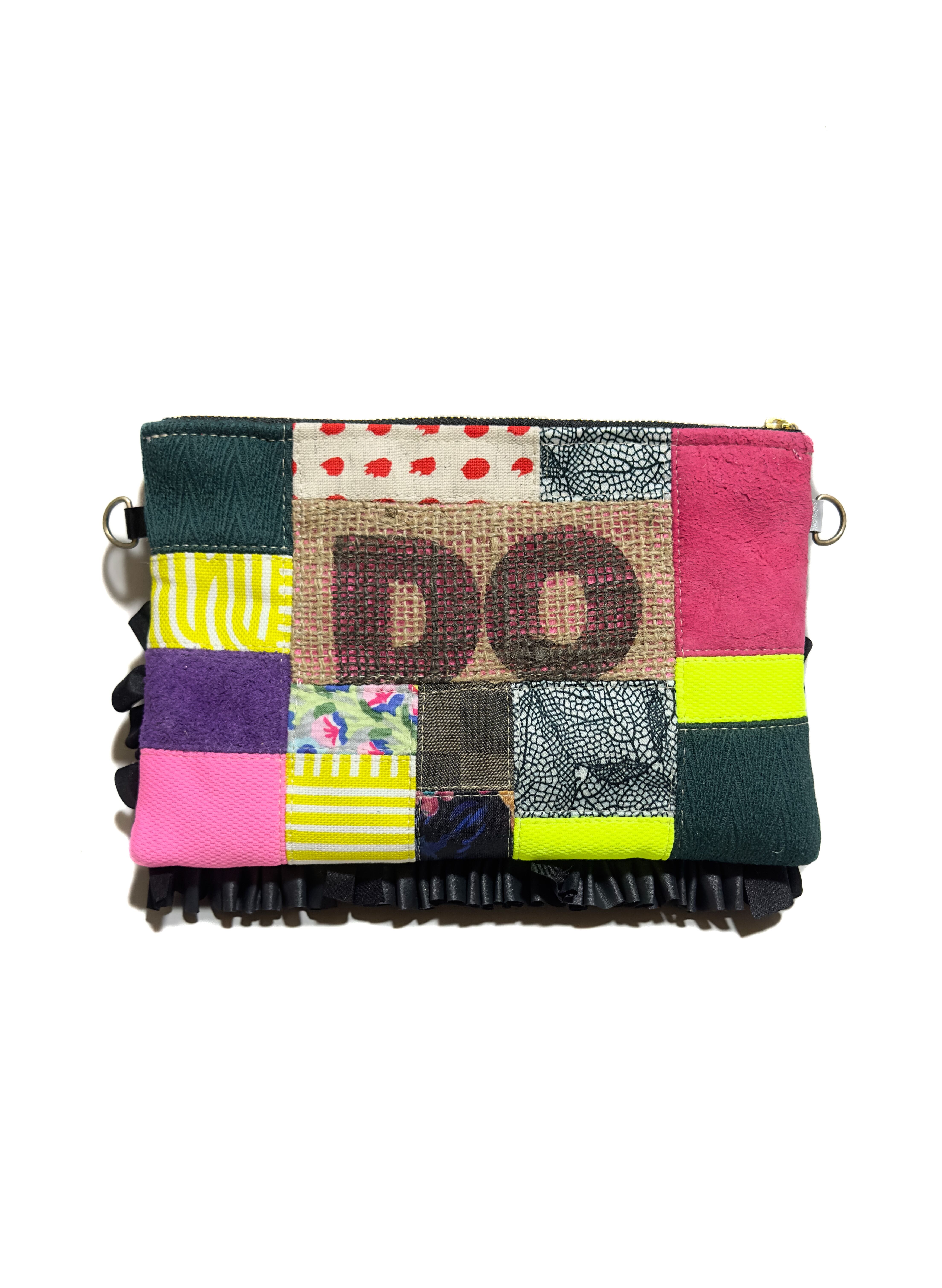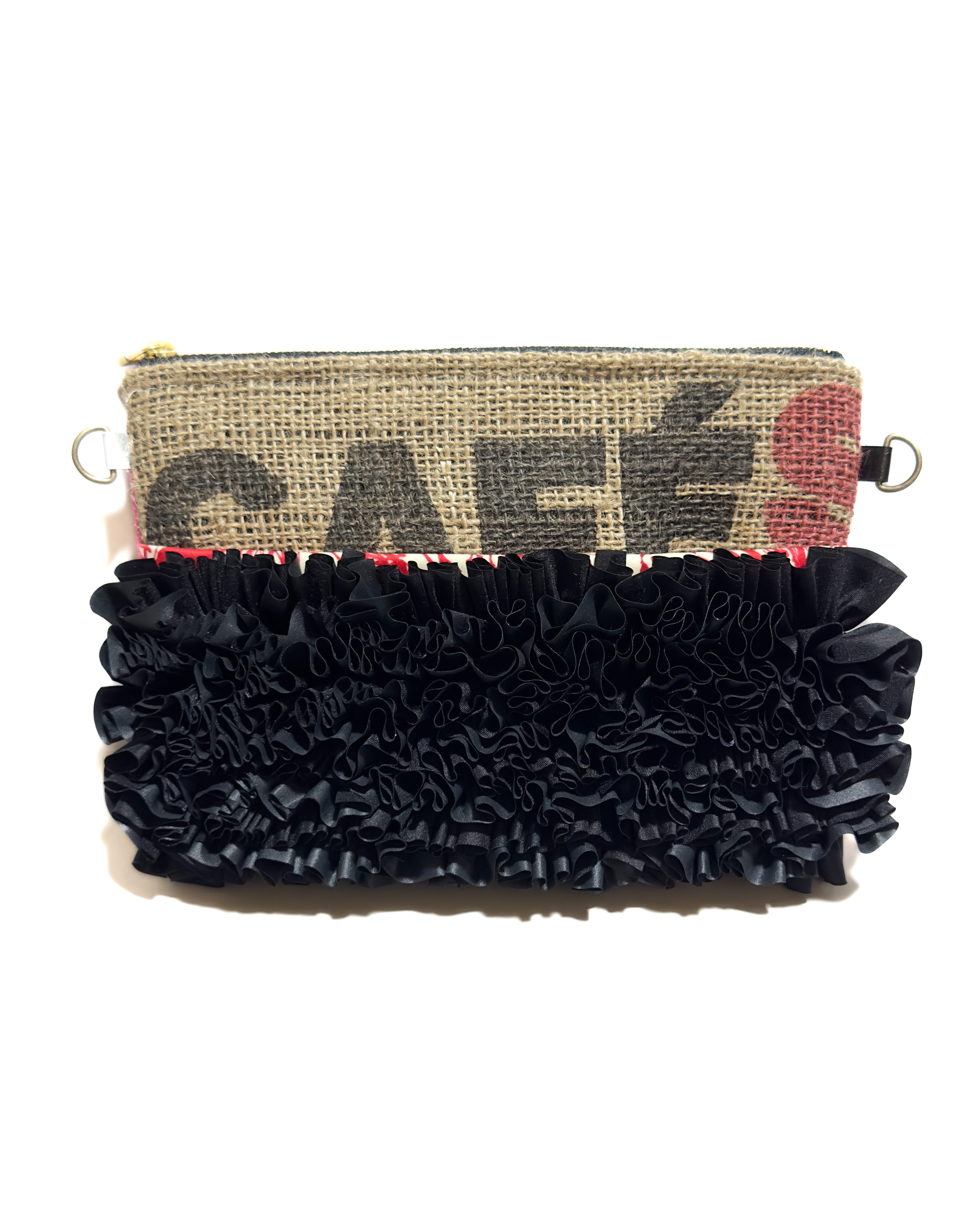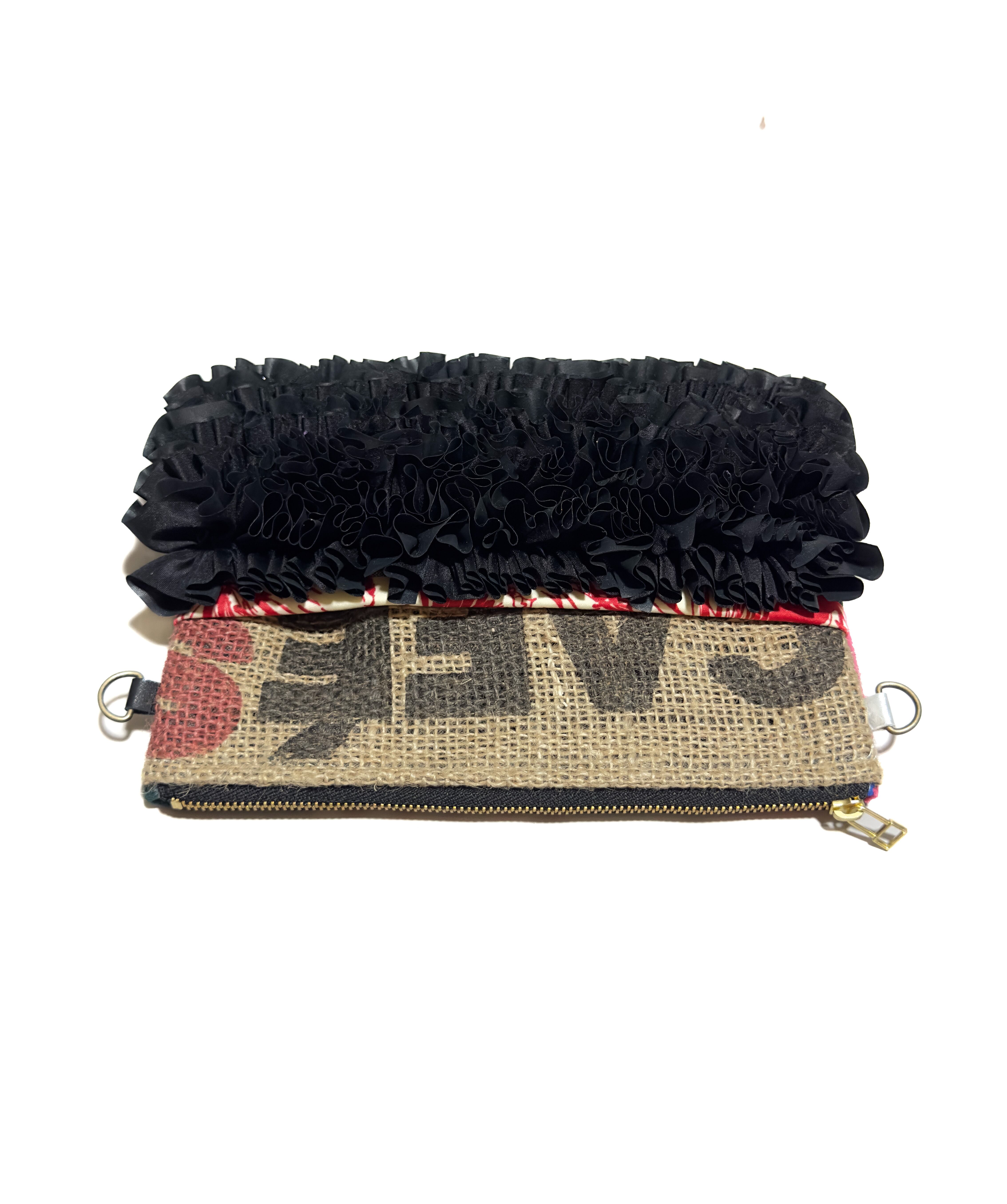 1枚の布地の様に仕上げたフリフリとコーヒーの麻袋、本来は廃棄されてしまう革の端材や新しい素材などを組み合わせてパッチワークし新しいカタチに仕立てました。