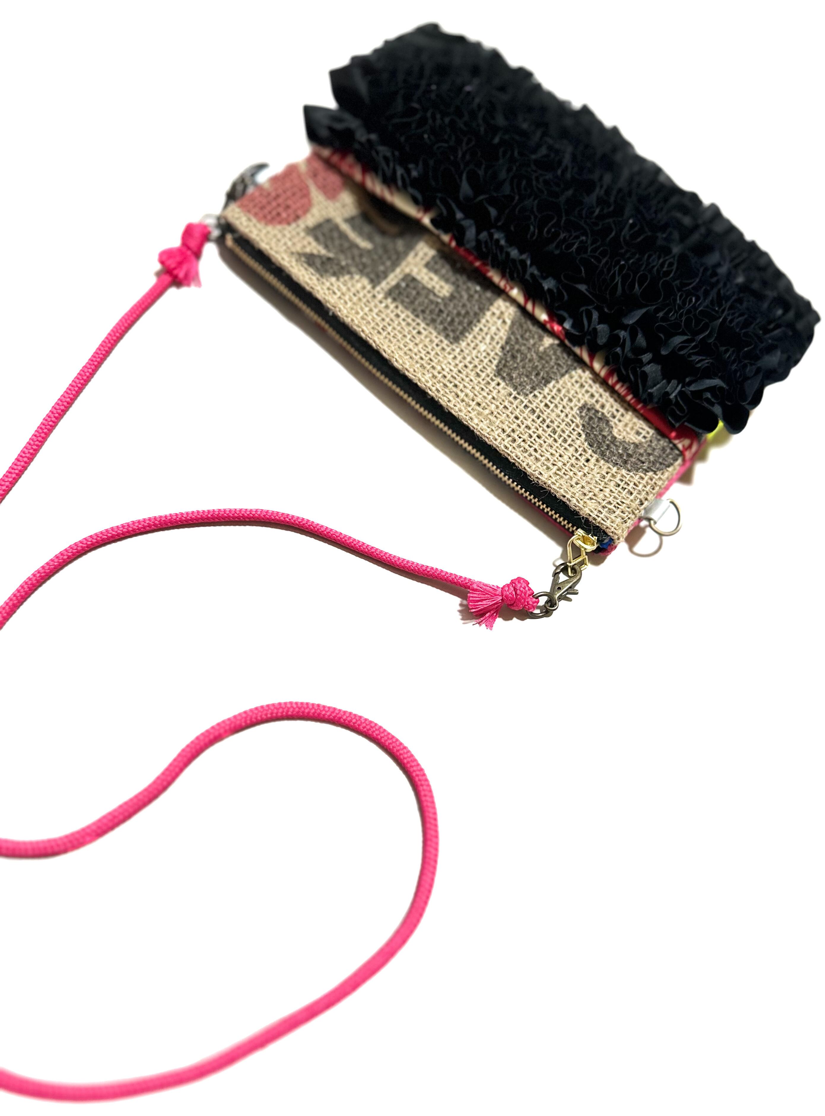 a Linden:tree オリジナルのサスティナブルアイテムで取り外し可能なピンクのショルダーが付いた黒のフリフリポーチです。