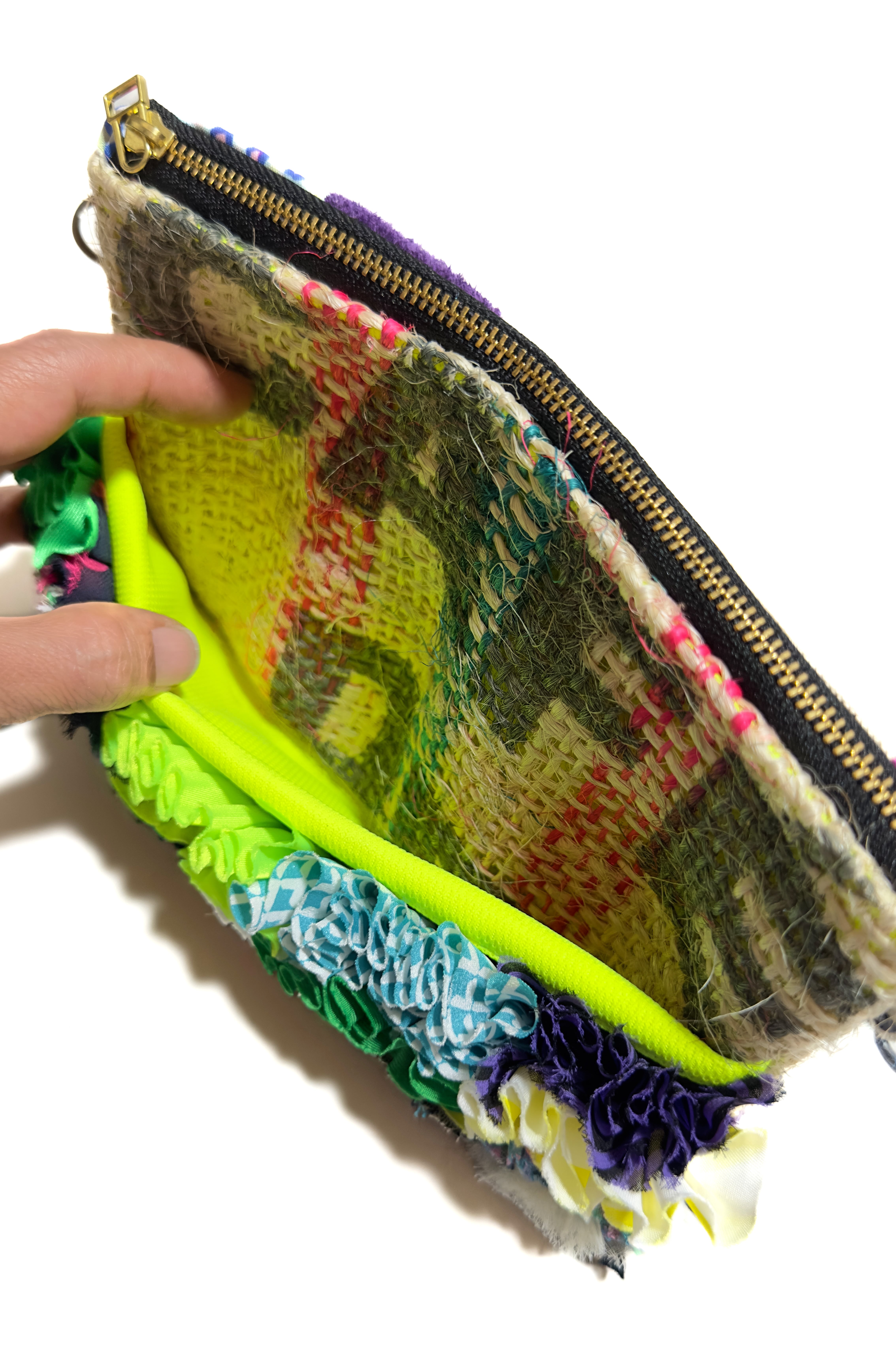 1枚の布地の様に仕上げたカラフルなフリフリとコーヒーの麻袋、本来は廃棄されてしまう革の端材や新しい素材などを組み合わせてパッチワークし新しいカタチに仕立てました。