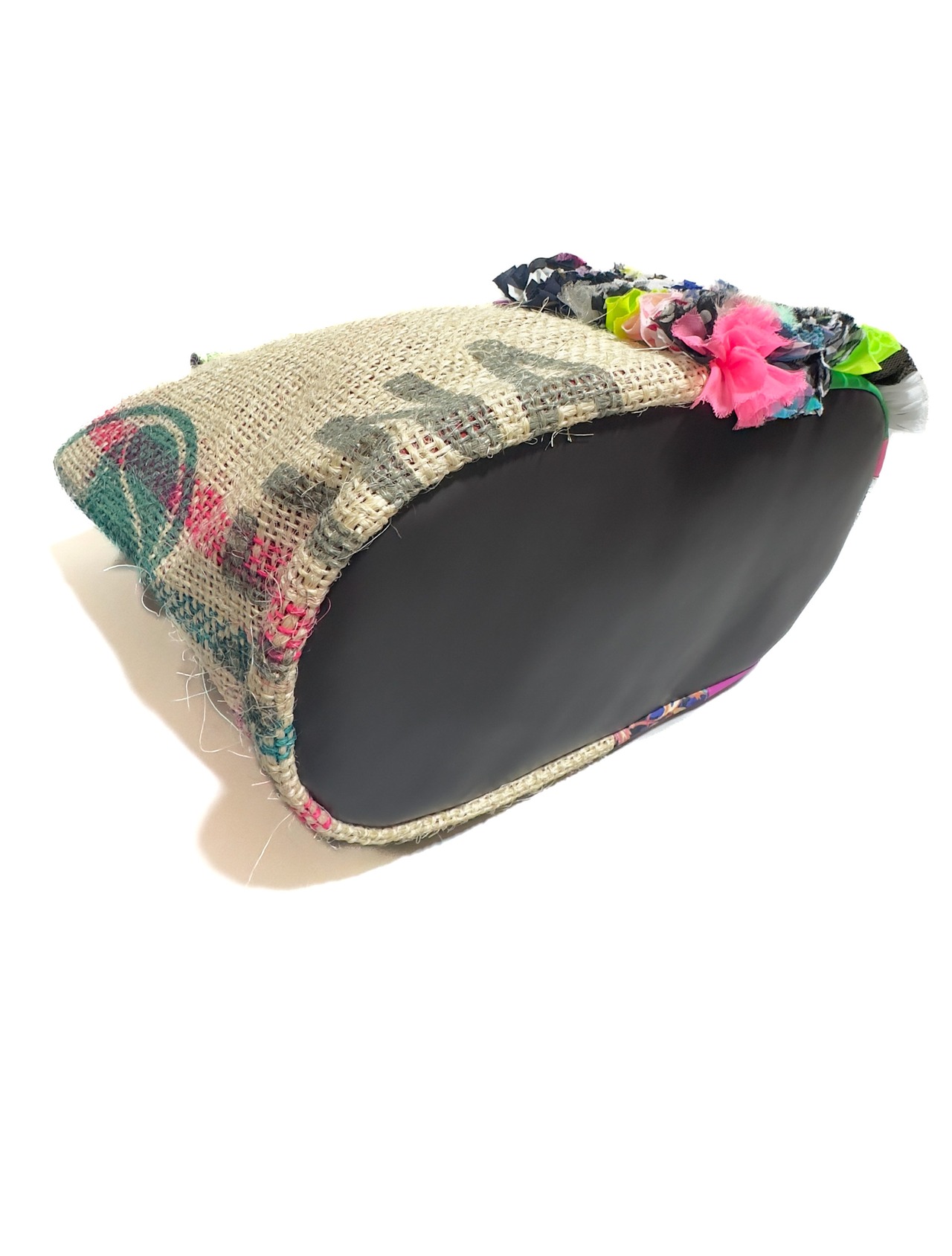 様々な布地をフリルにし、ひとつの布に仕上げてから本来は廃棄されてしまう端材の革や新しい素材などをコーヒーの麻袋と組み合わせて新しいカタチに仕上げた他にはないa Linden:tree オリジナルデザインのカラフルでデコラティブでサスティナブルな大きめトートバッグです。