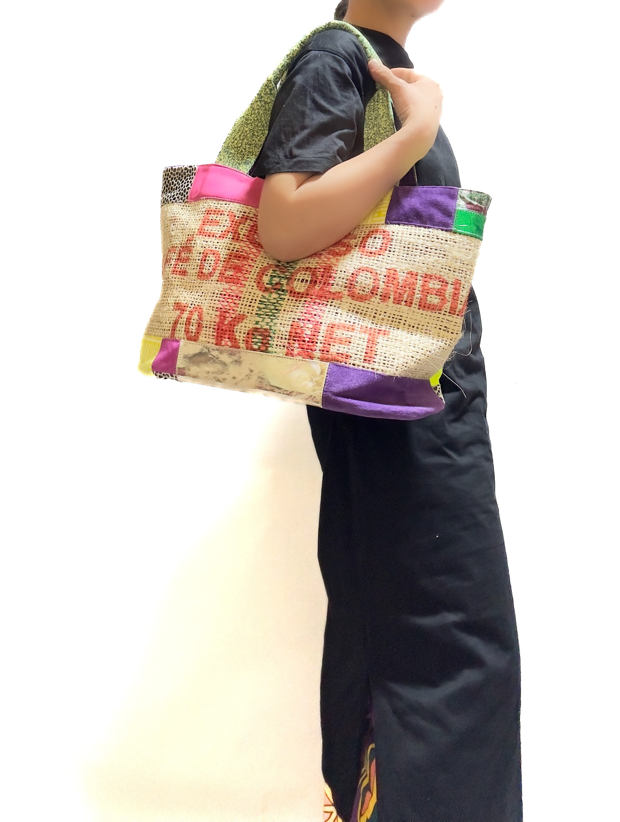 本来でしたら廃棄されてしまう端材の革や新しい素材などをコーヒーの麻袋と組み合わせて新しいカタチに仕上げた他にはないa Linden:tree オリジナルデザインのカラフルでサスティナブルなハンドメイドのトートバッグです。