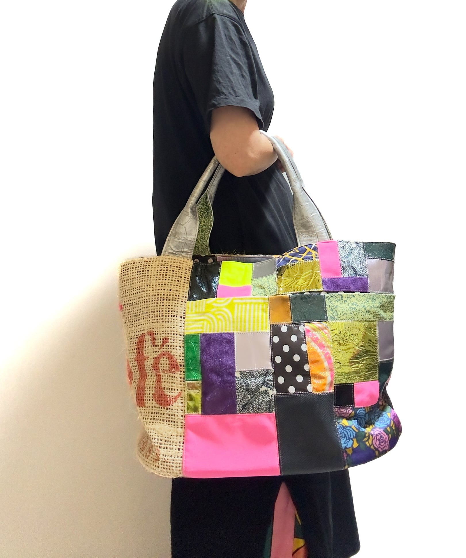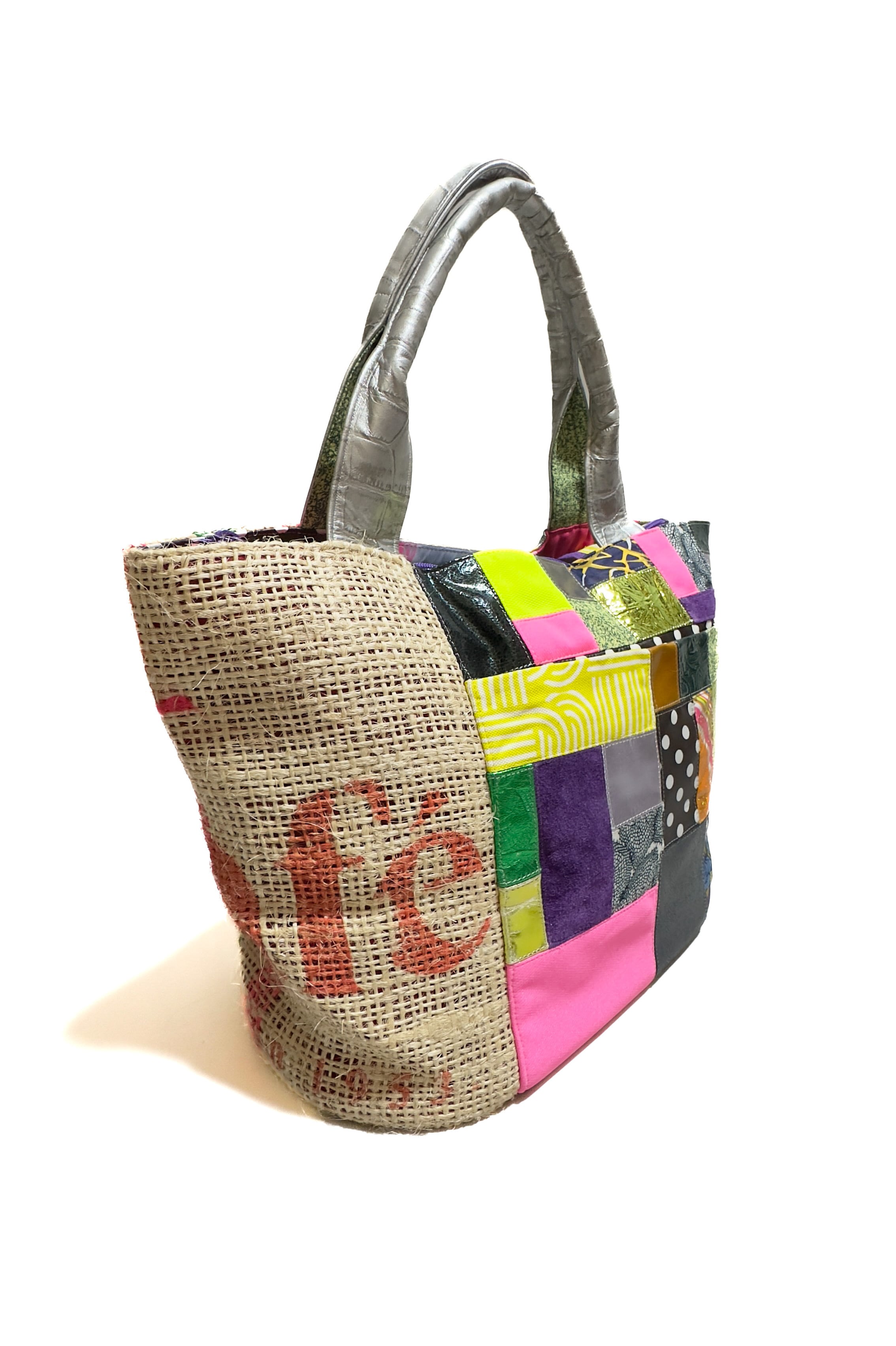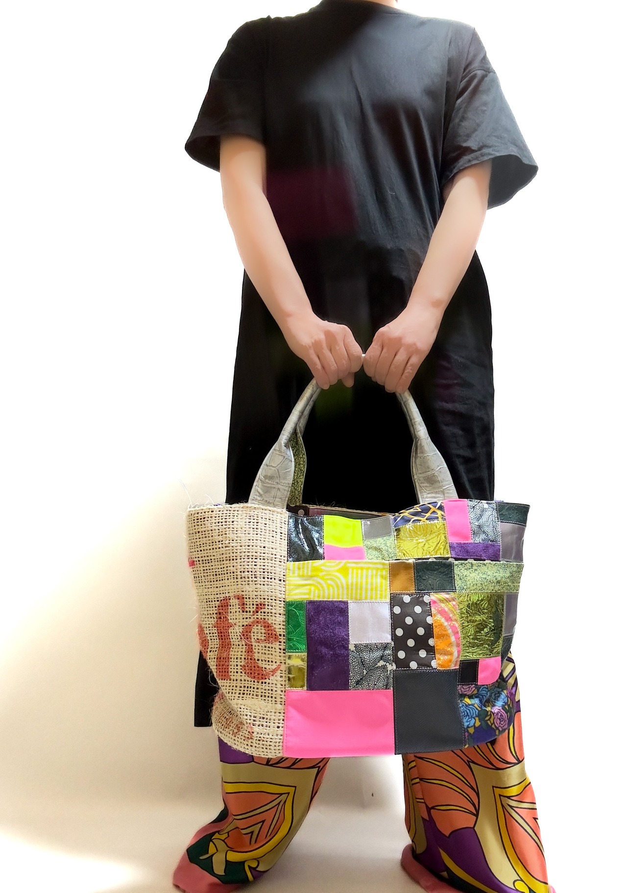 本来でしたら廃棄されてしまう端材の革や新しい素材などをコーヒーの麻袋と組み合わせて新しいカタチに仕上げた他にはないa Linden:tree オリジナルデザインのカラフルでサスティナブルなハンドメイドのトートバッグです。