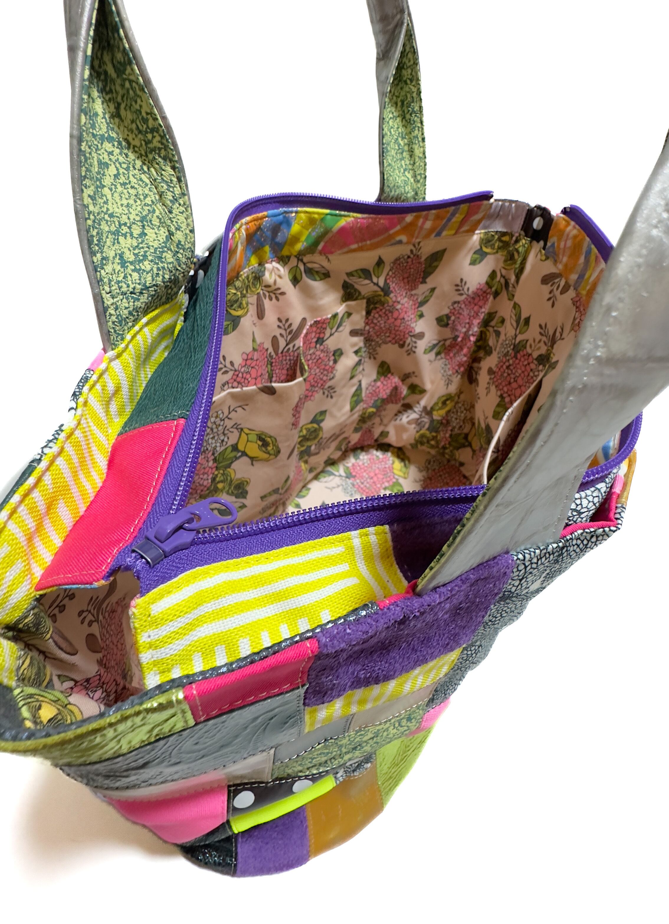 裏側の縁部分やファスナー部分もパッチワークにしたり、裏地にお花柄を使ってみたりと見えないけれど、さりげないお洒落を満載に仕上げましたのでチラリズムもお楽しみくださいね◎