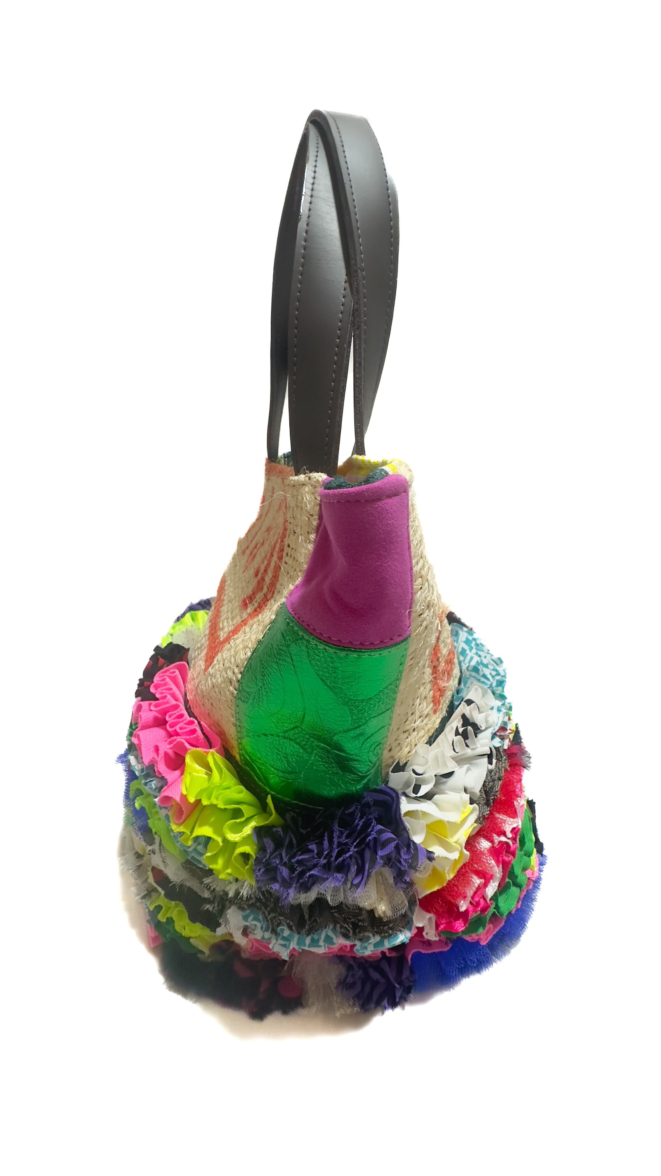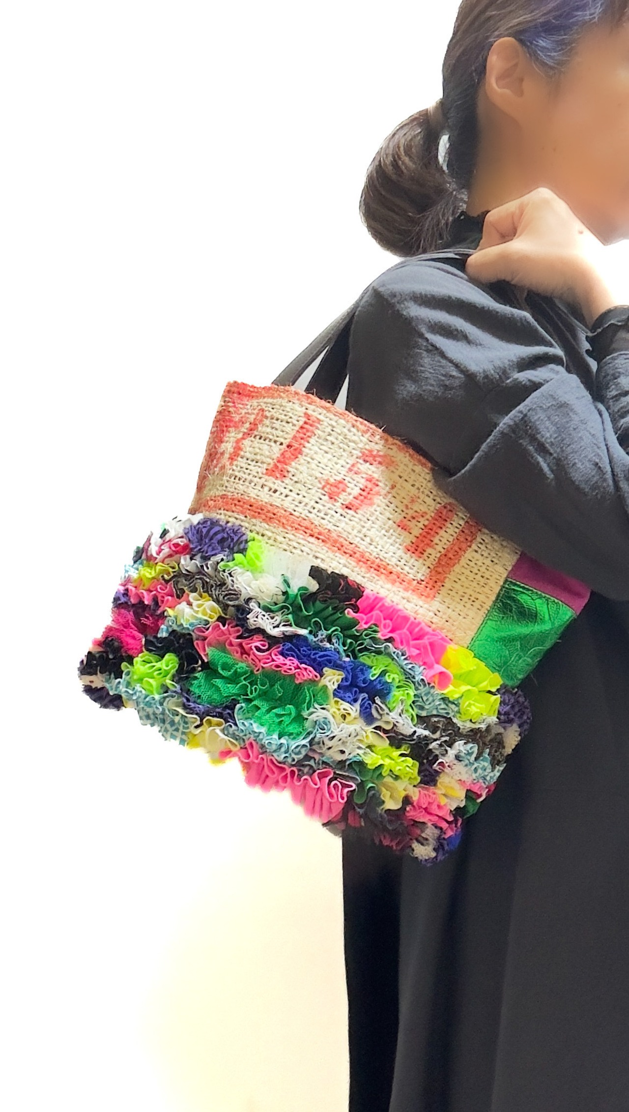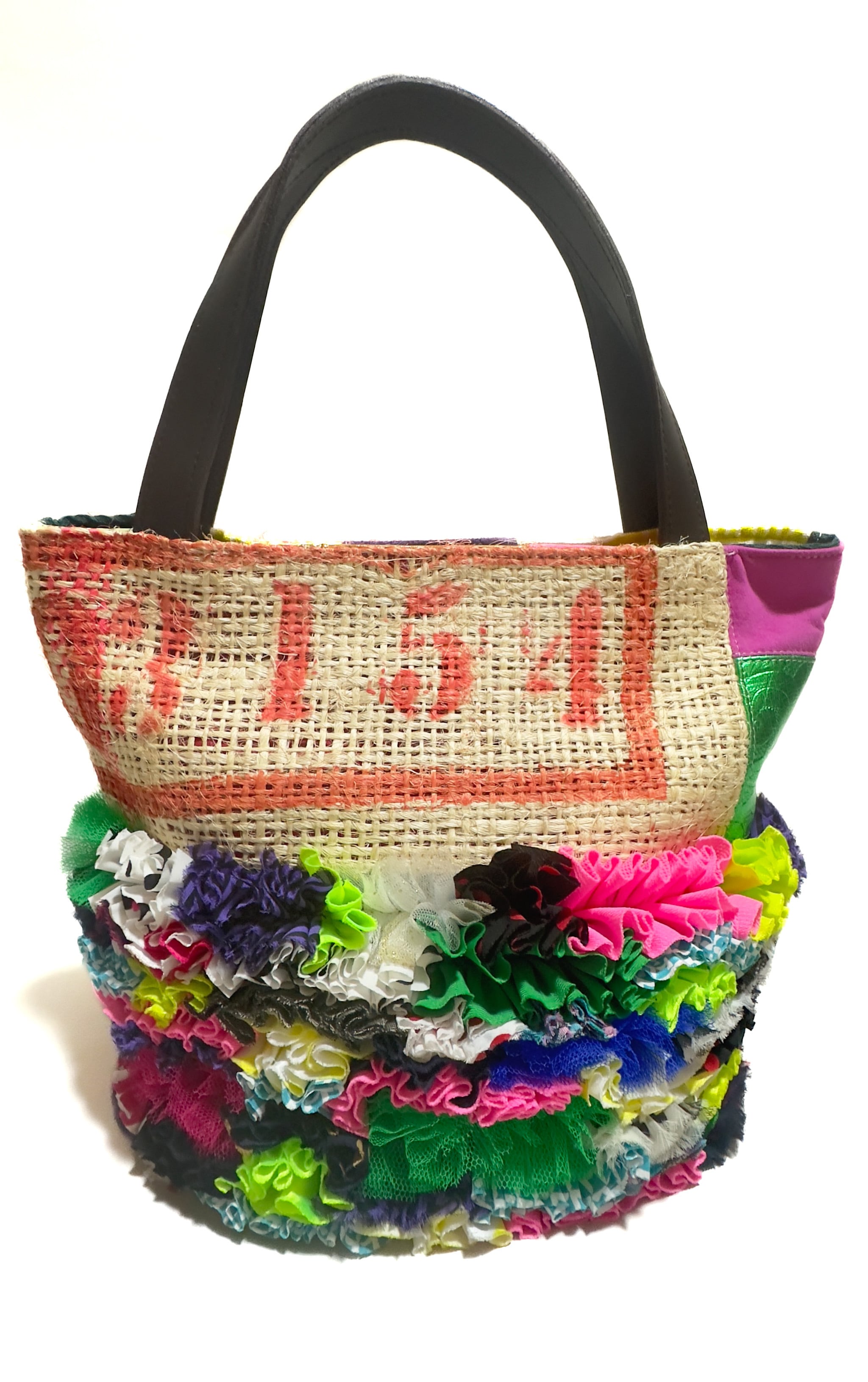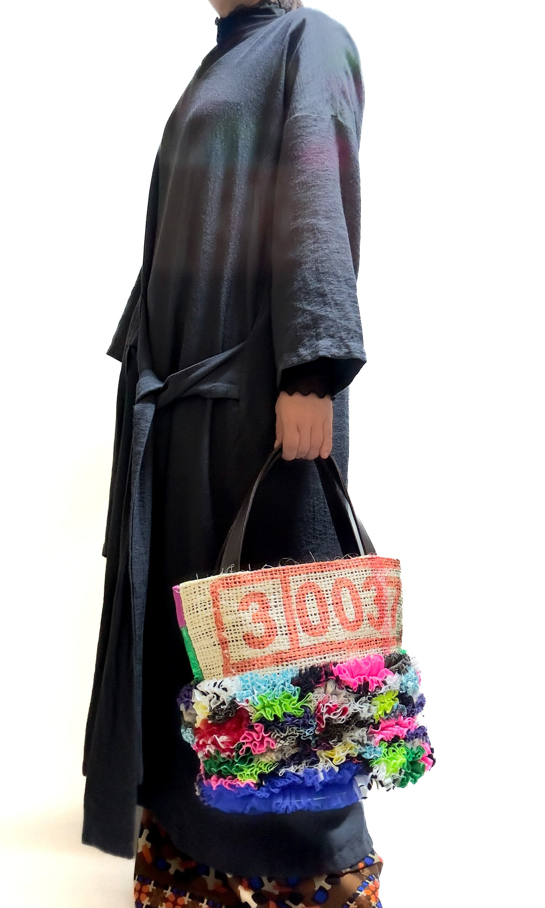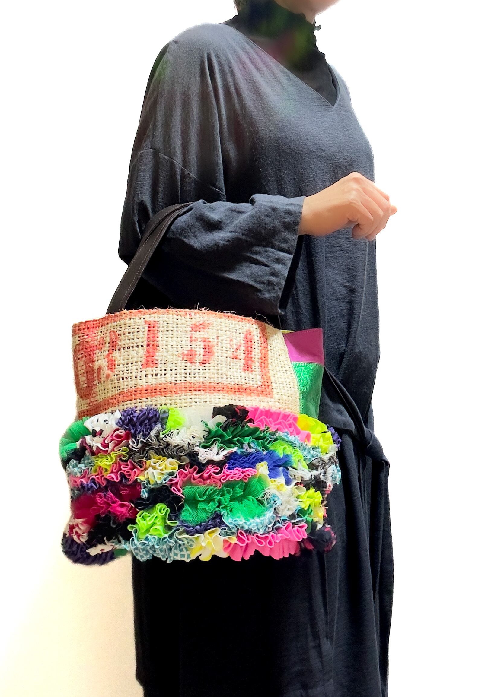 様々な布地をフリルにし、ひとつの布のように仕立てて本来なら廃棄されてしまう端材の革と新しい素材、コーヒーの麻袋をコラージュして新しいカタチに仕上げたa Linden:tree オリジナルデザインのサスティナブルなトートバッグです。