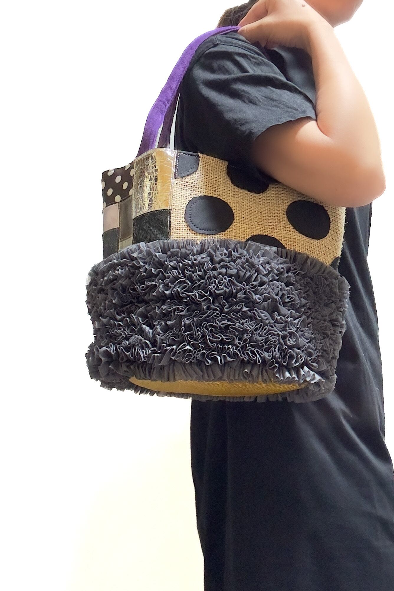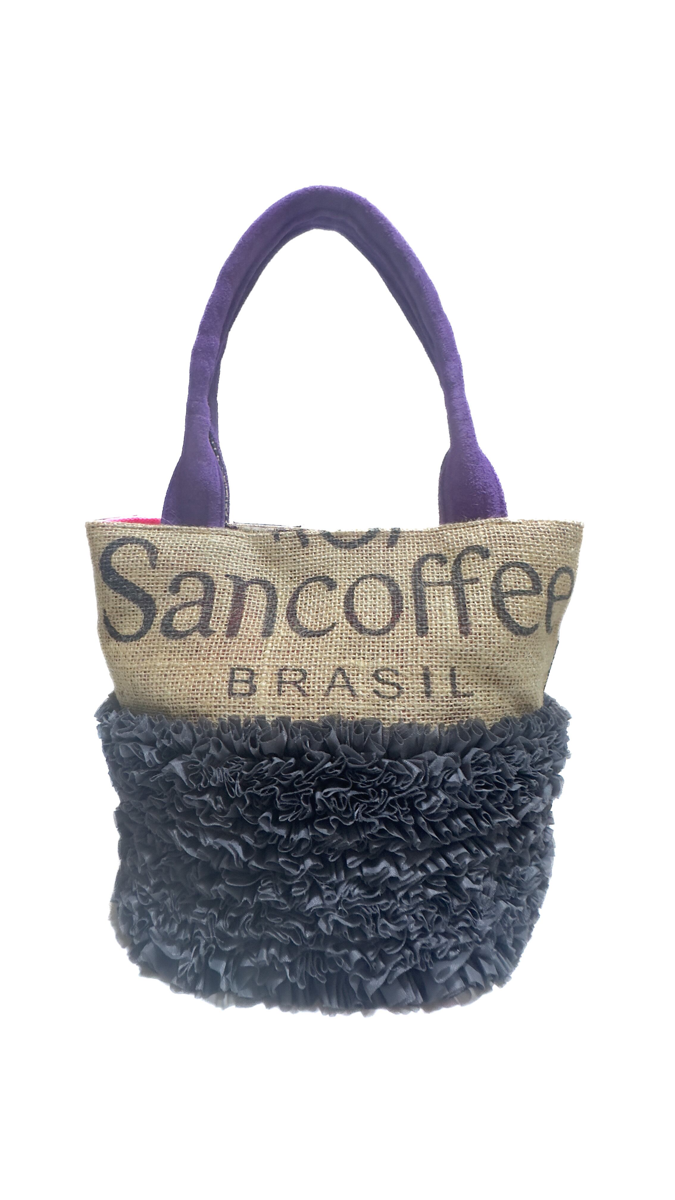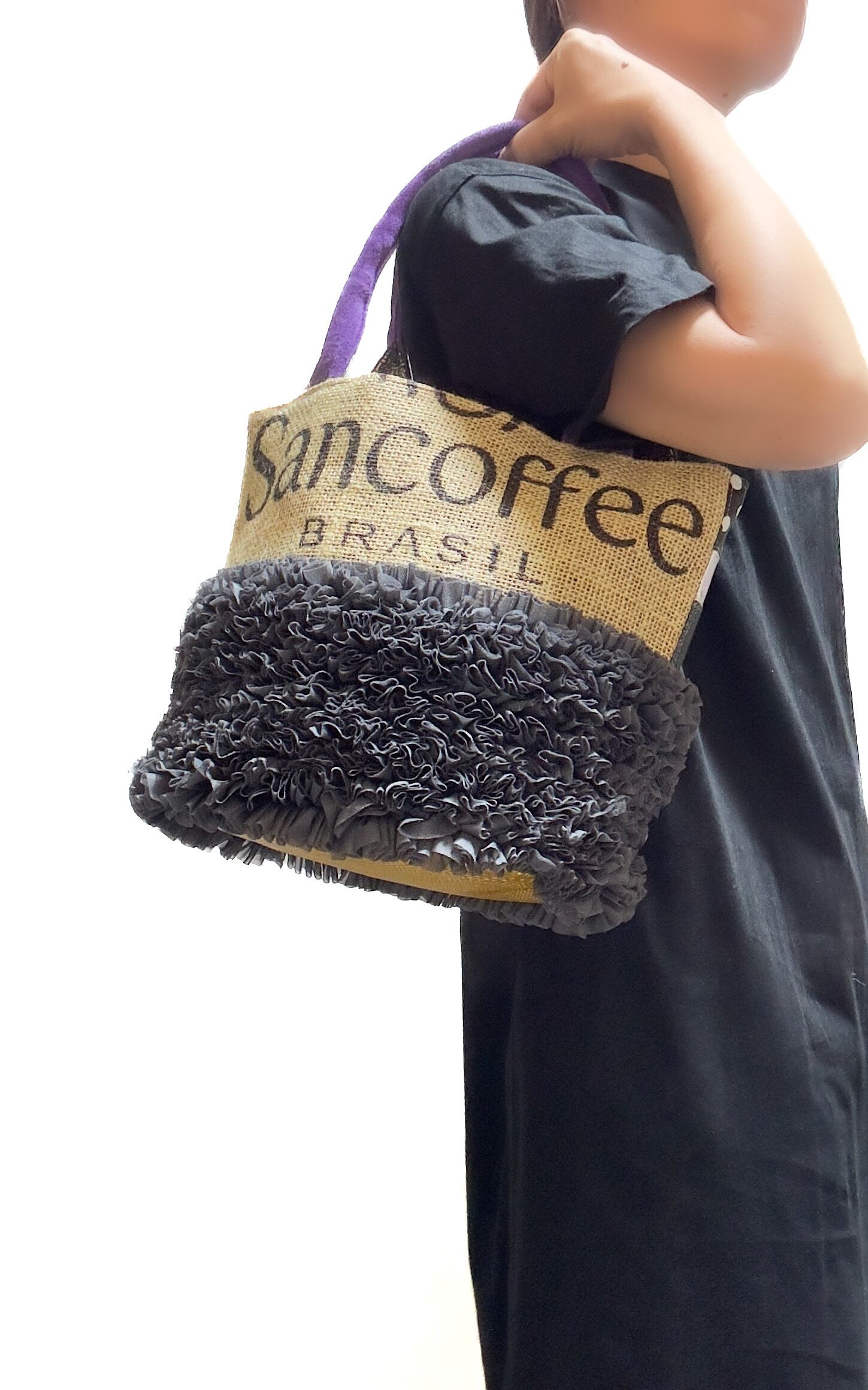 グレーの柔らかい布地をフリルにし、ひとつの布のように仕立てて本来なら廃棄されてしまう端材の革と新しい素材、コーヒーの麻袋をコラージュして新しいカタチに仕上げたa Linden:tree オリジナルデザインのサスティナブルなトートバッグです。