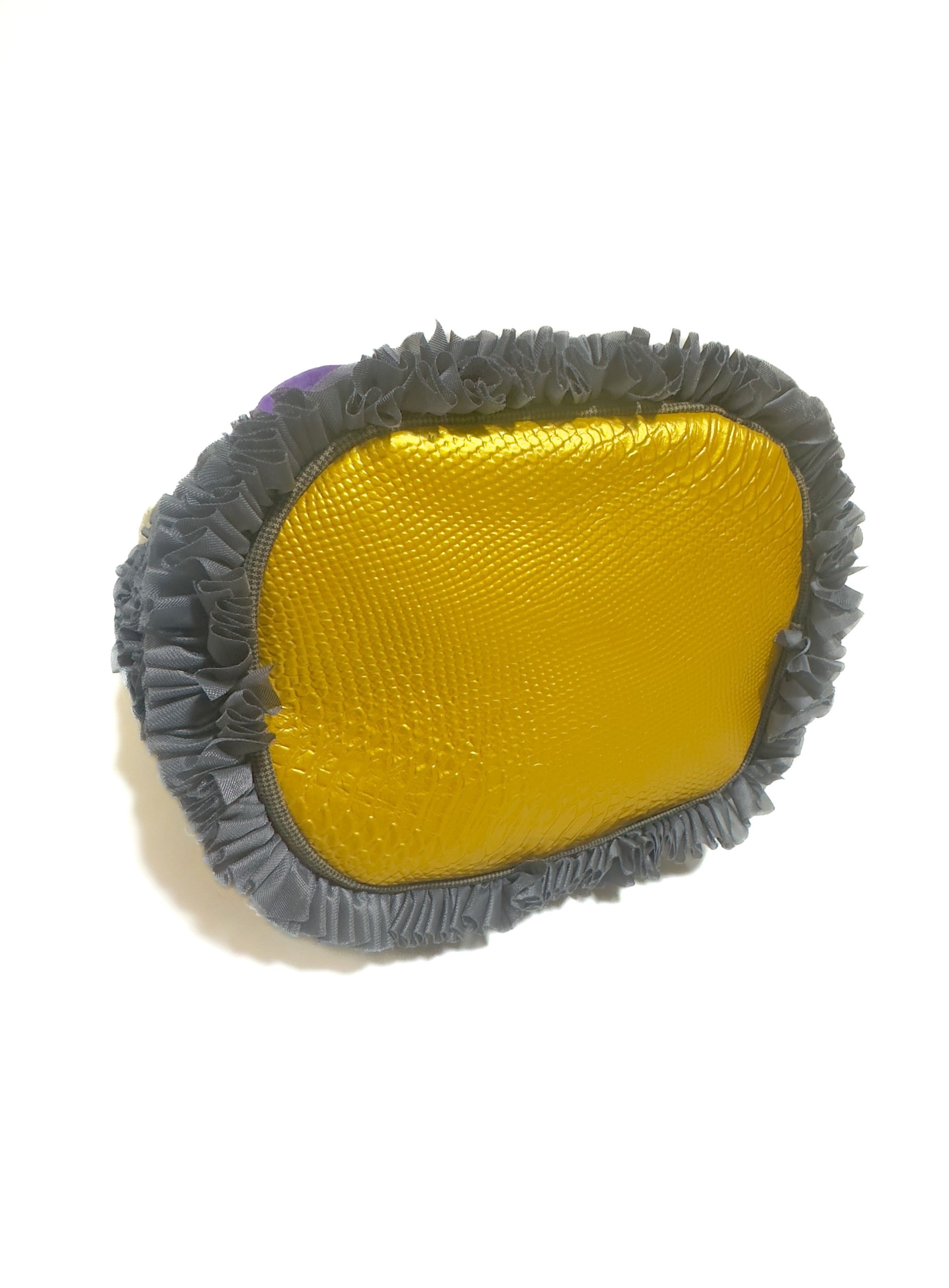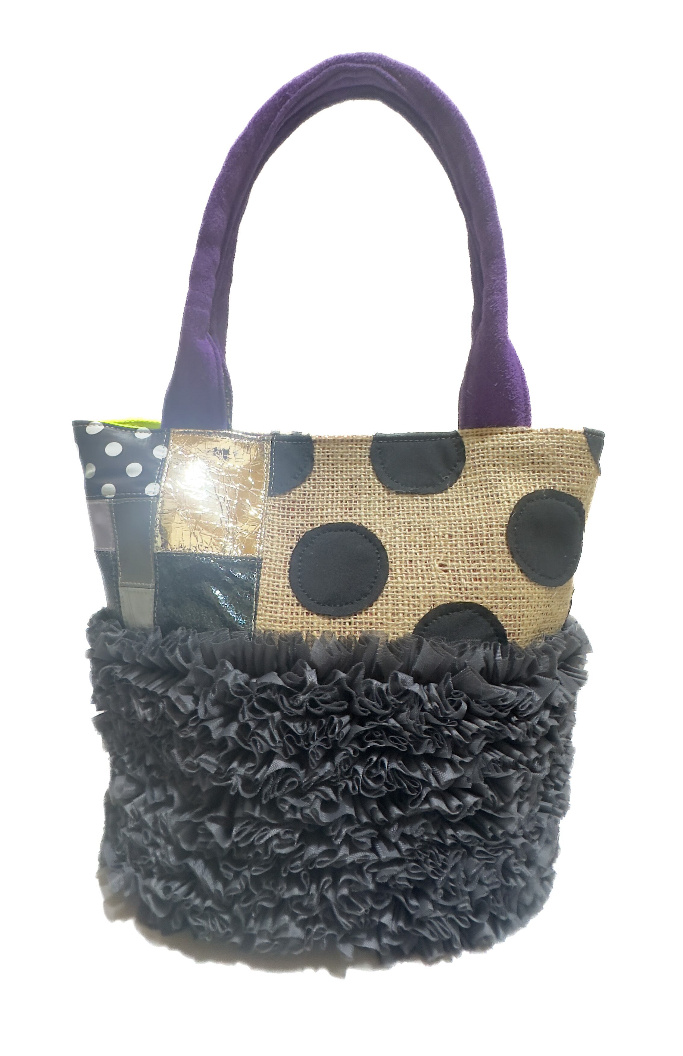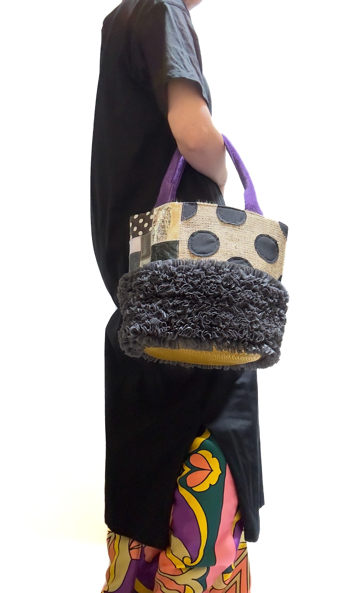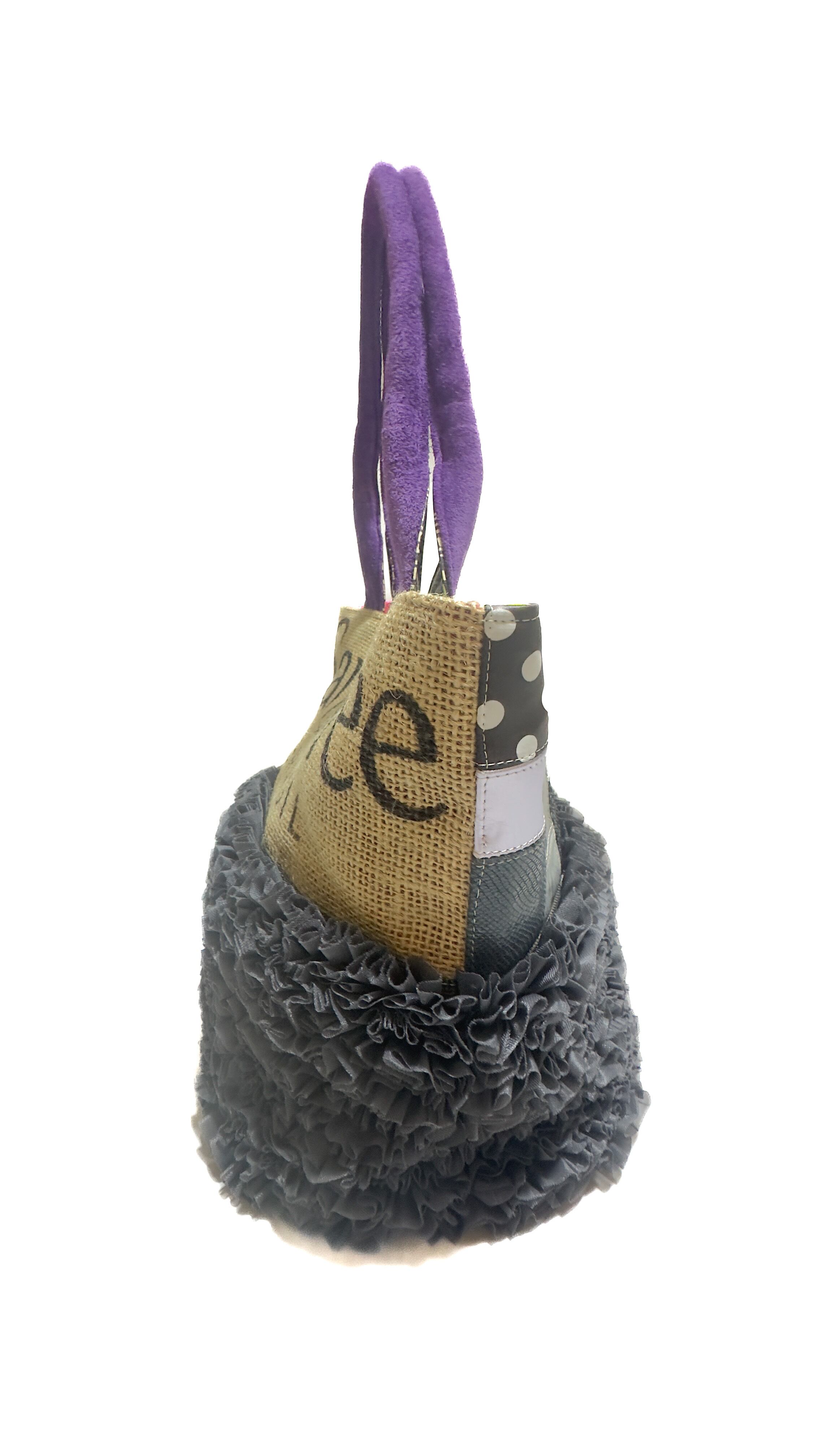 グレーの柔らかい布地をフリルにし、ひとつの布のように仕立てて本来なら廃棄されてしまう端材の革と新しい素材、コーヒーの麻袋をコラージュして新しいカタチに仕上げたa Linden:tree オリジナルデザインのサスティナブルなトートバッグです。