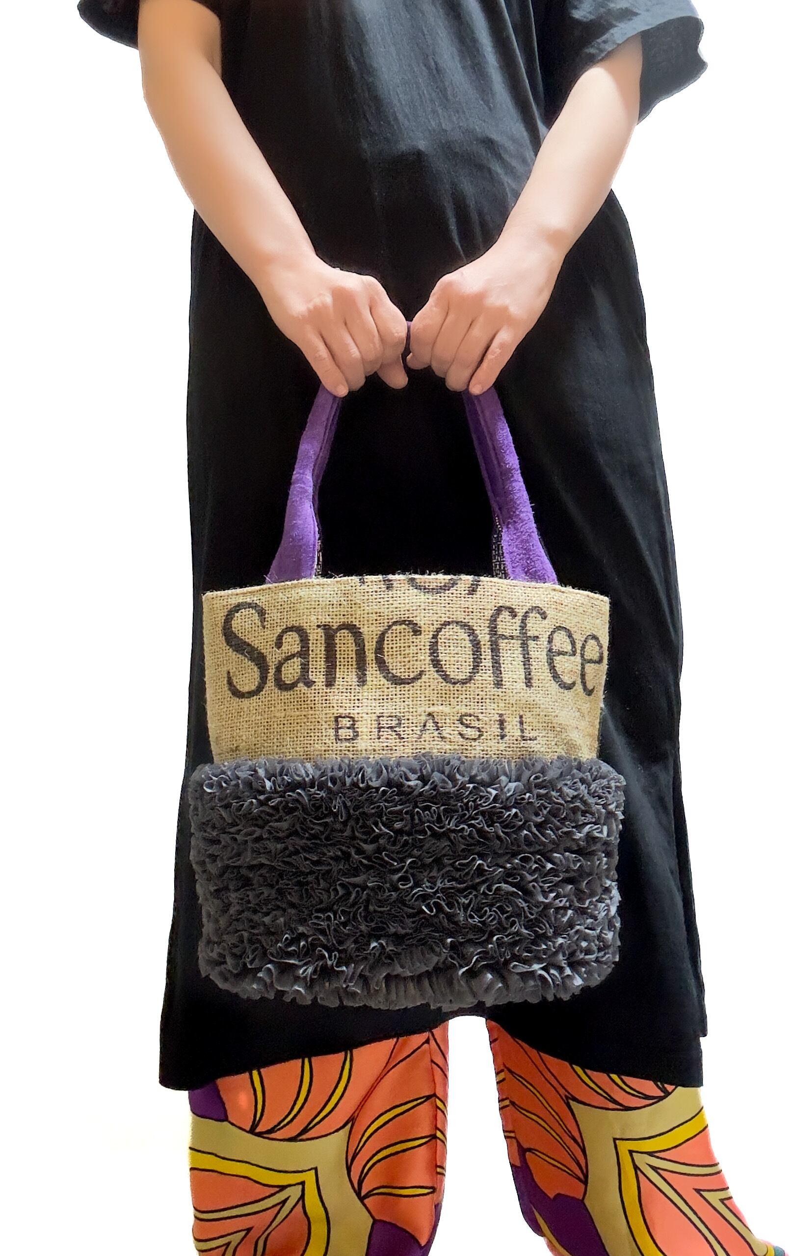 更にコーヒーの麻袋の無地の部分は端材の布地でドット柄に変化させた前面と文字部分を使用した裏面で表情も変わるのも特徴ですので、いつものお出かけのお供にとっておきのアイテムとしてコーディネートを楽しんでくださいね◎