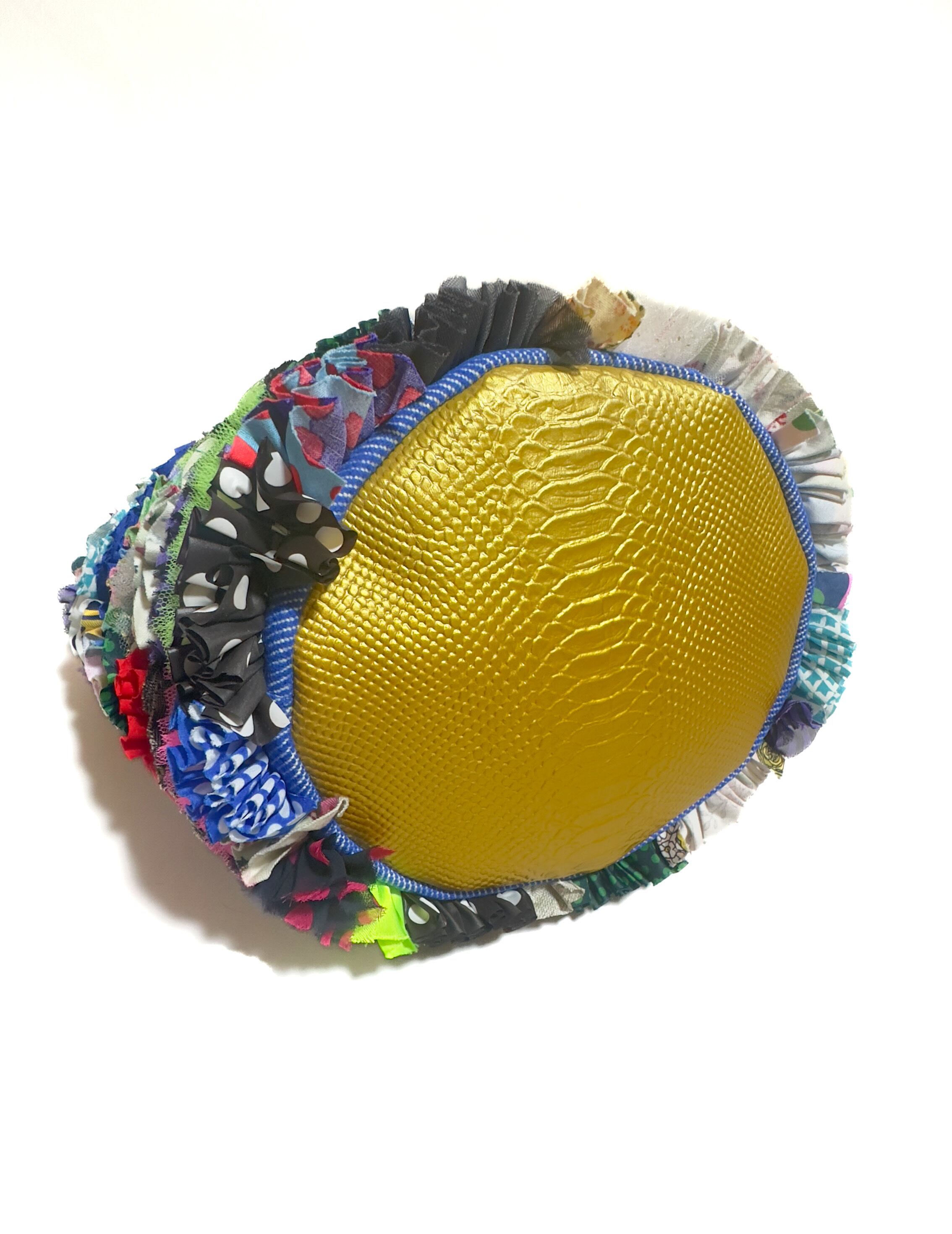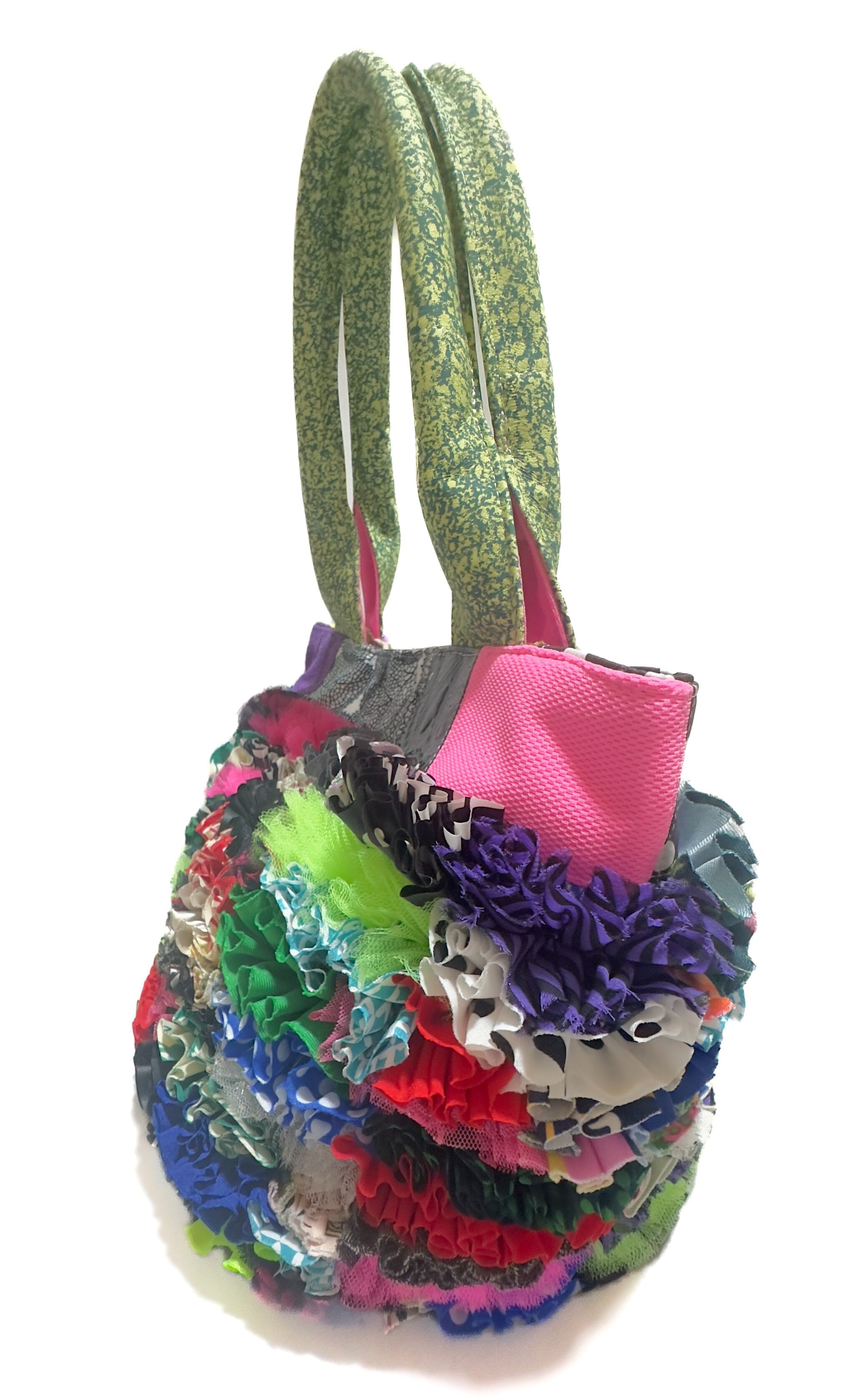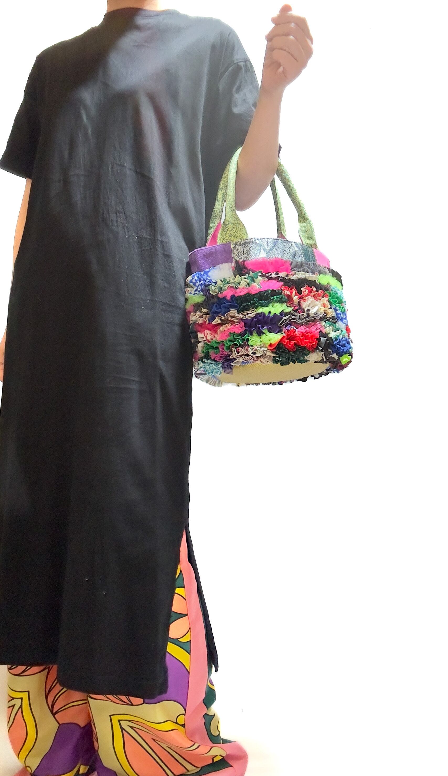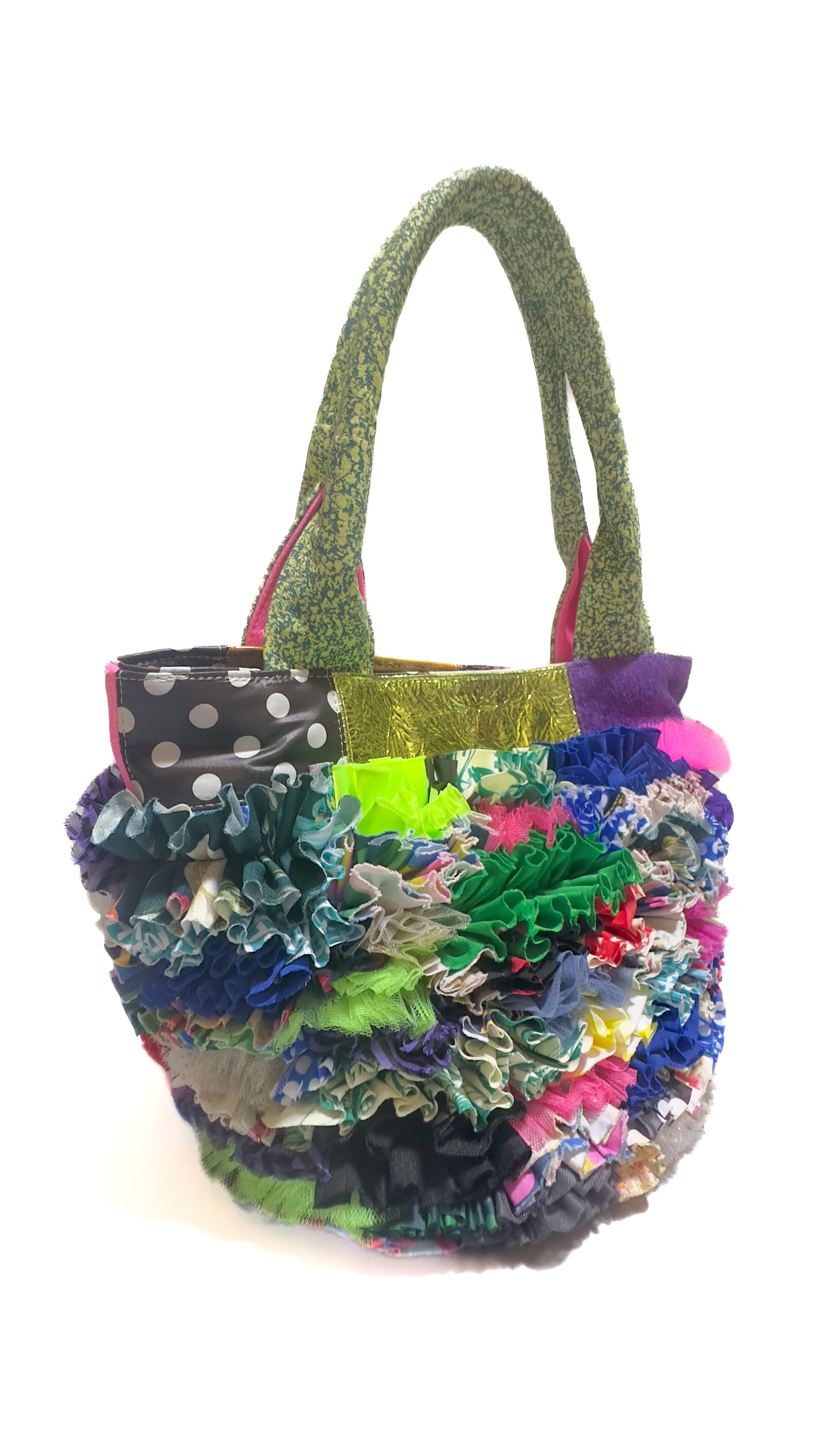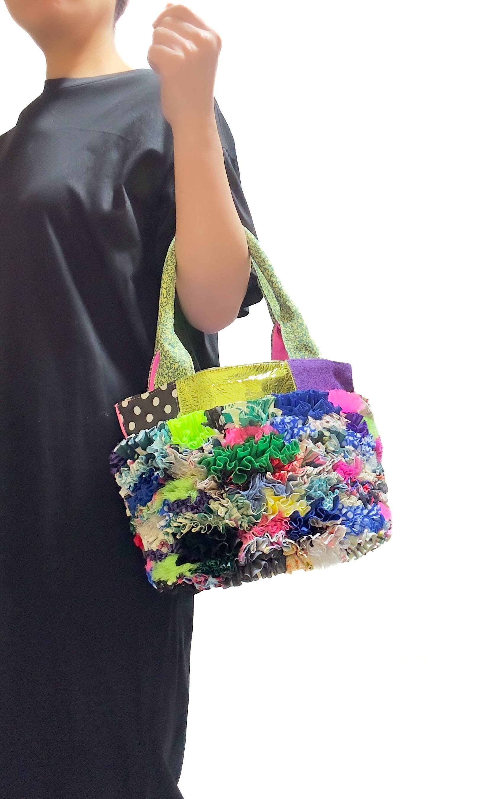 様々な布地をバイアスカットしてからフリルにし、ひとつの布のように仕立て本来なら廃棄されてしまう端材の革と新しい素材をコラージュし新しいカタチに仕上げたa Linden:tree オリジナルデザインのサスティナブルな少し小さめなトートバッグです。