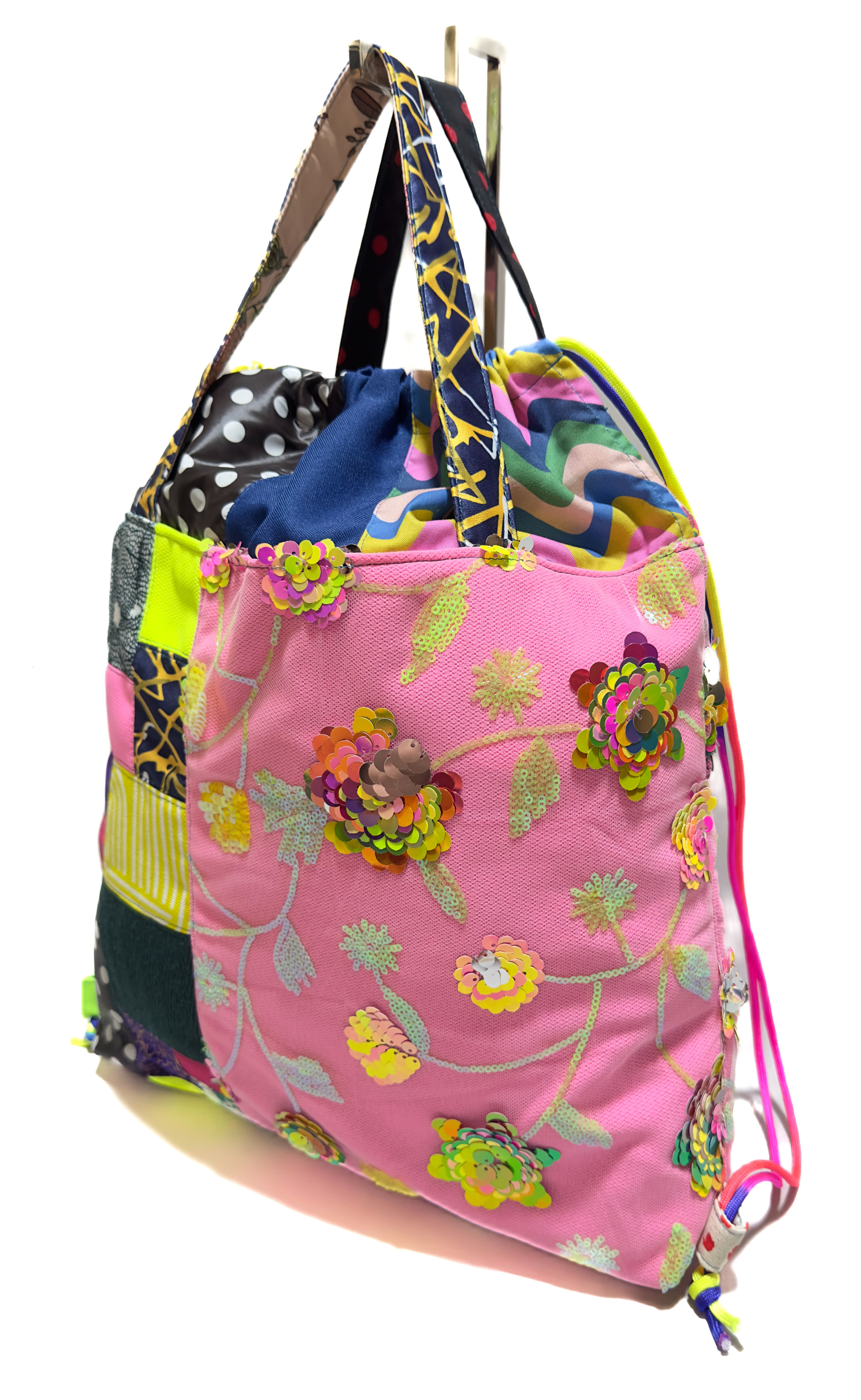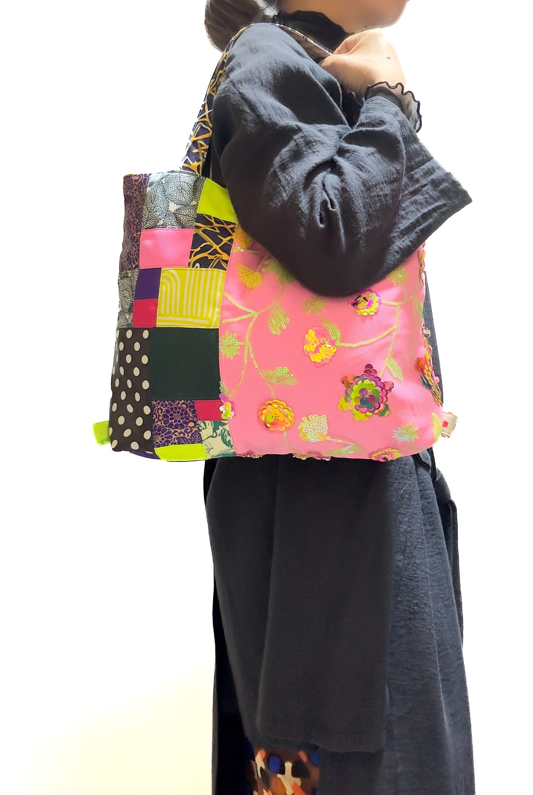 スパンコールのお花が付いたチュールレースにピンクの布地を組み合わせて様々なお花柄、個性的な素材をいろいろとミックスしエコバッグとして製作しましたがメインで使用していただいても可愛いデザインです。
