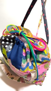 本来なら廃棄されてしまう端材を新しい素材と組み合わせてパッチワークし、新しい型に仕上げた a Linden:tree オリジナルのサスティナブルな巾着タイプのエコトートバッグです。