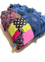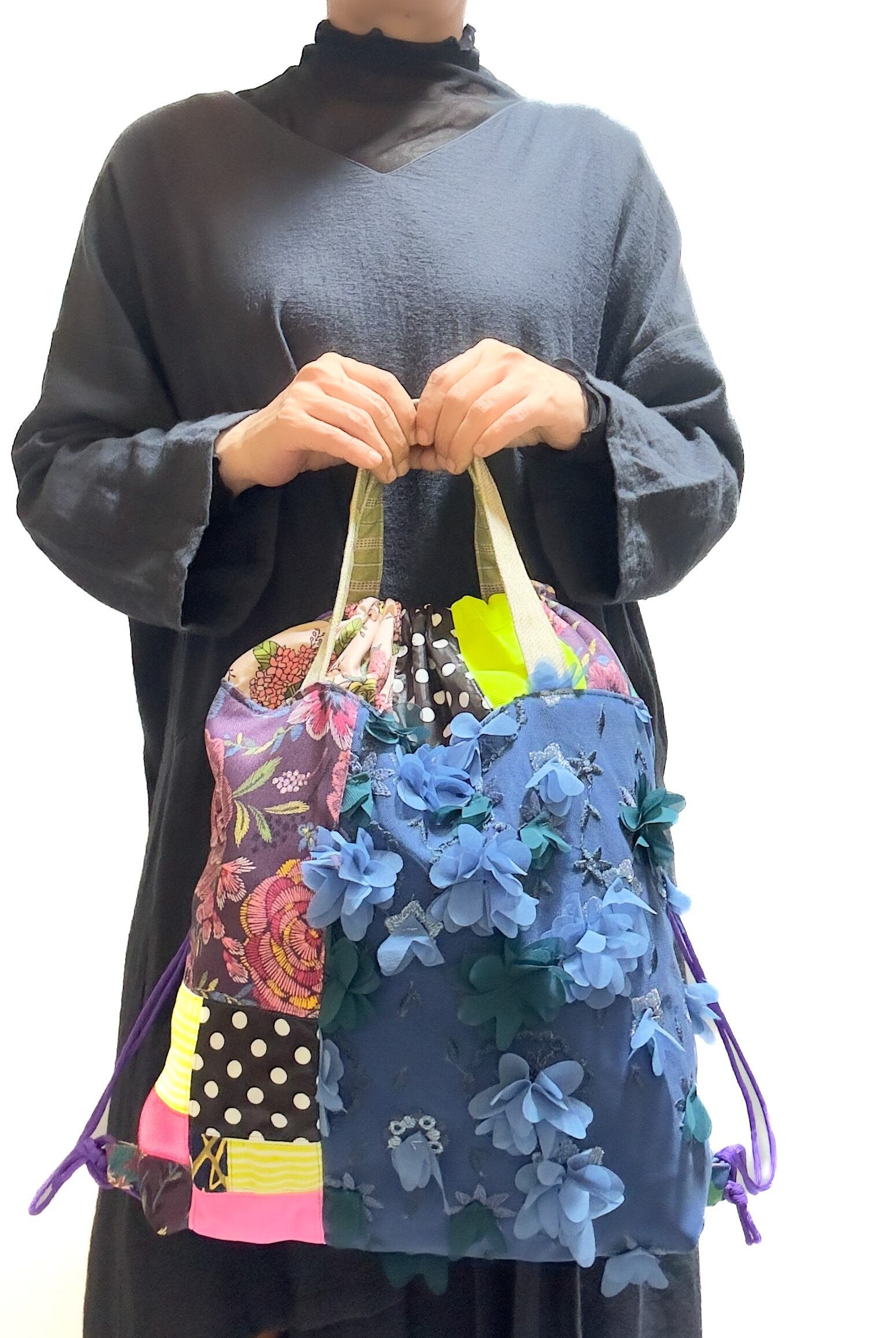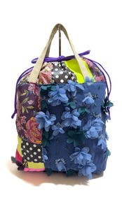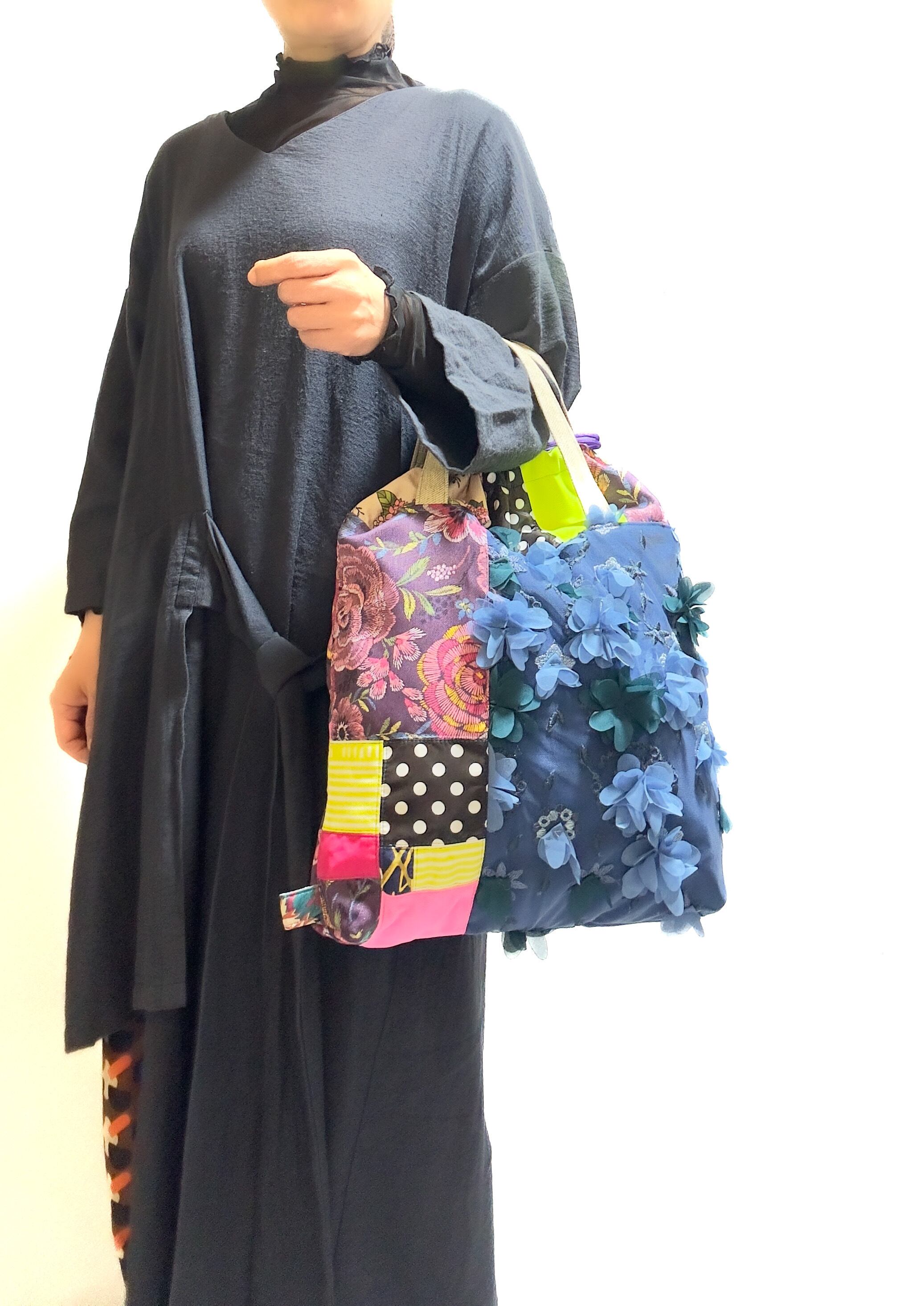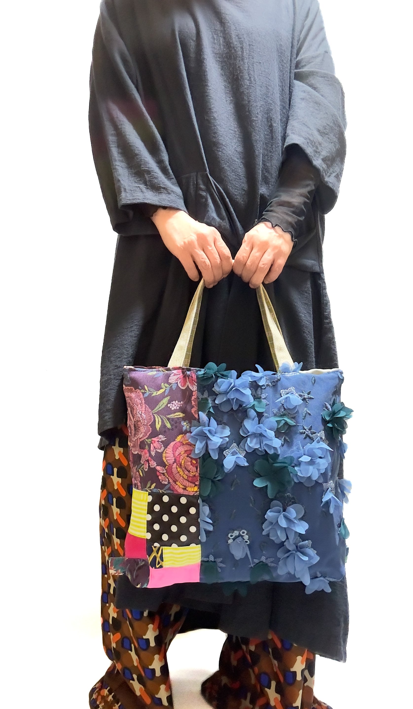 ふわっふわのお花が付いたチュールレースにブルーの布地を組み合わせて様々なお花柄、個性的な素材をいろいろとミックスしエコバッグとして製作しましたがメインで使用していただいても可愛いデザインです。
