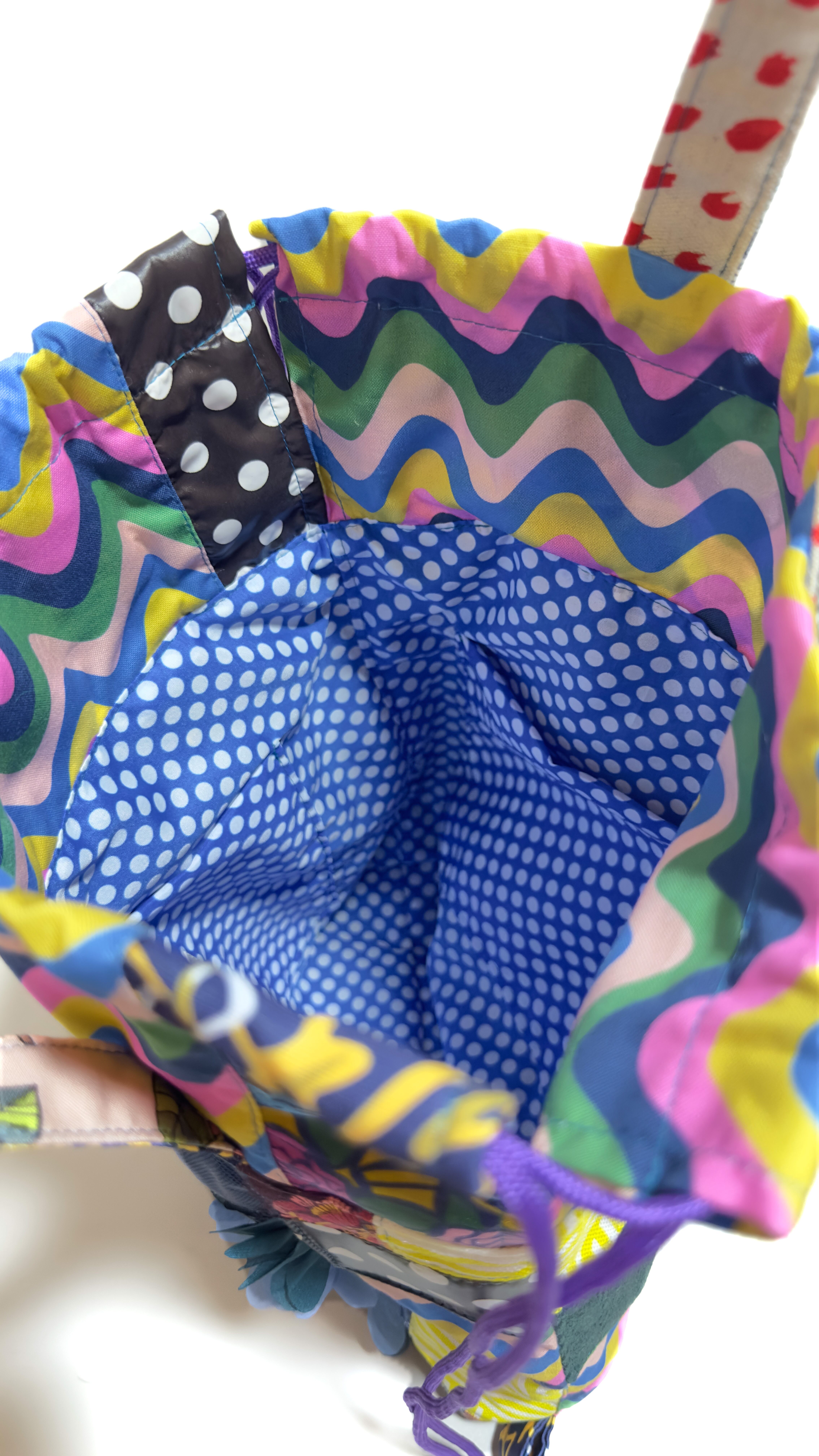 本来なら廃棄されてしまう端材を新しい素材と組み合わせてパッチワークし、新しい型に仕上げた a Linden:tree オリジナルのサスティナブルな巾着タイプのエコトートバッグです。