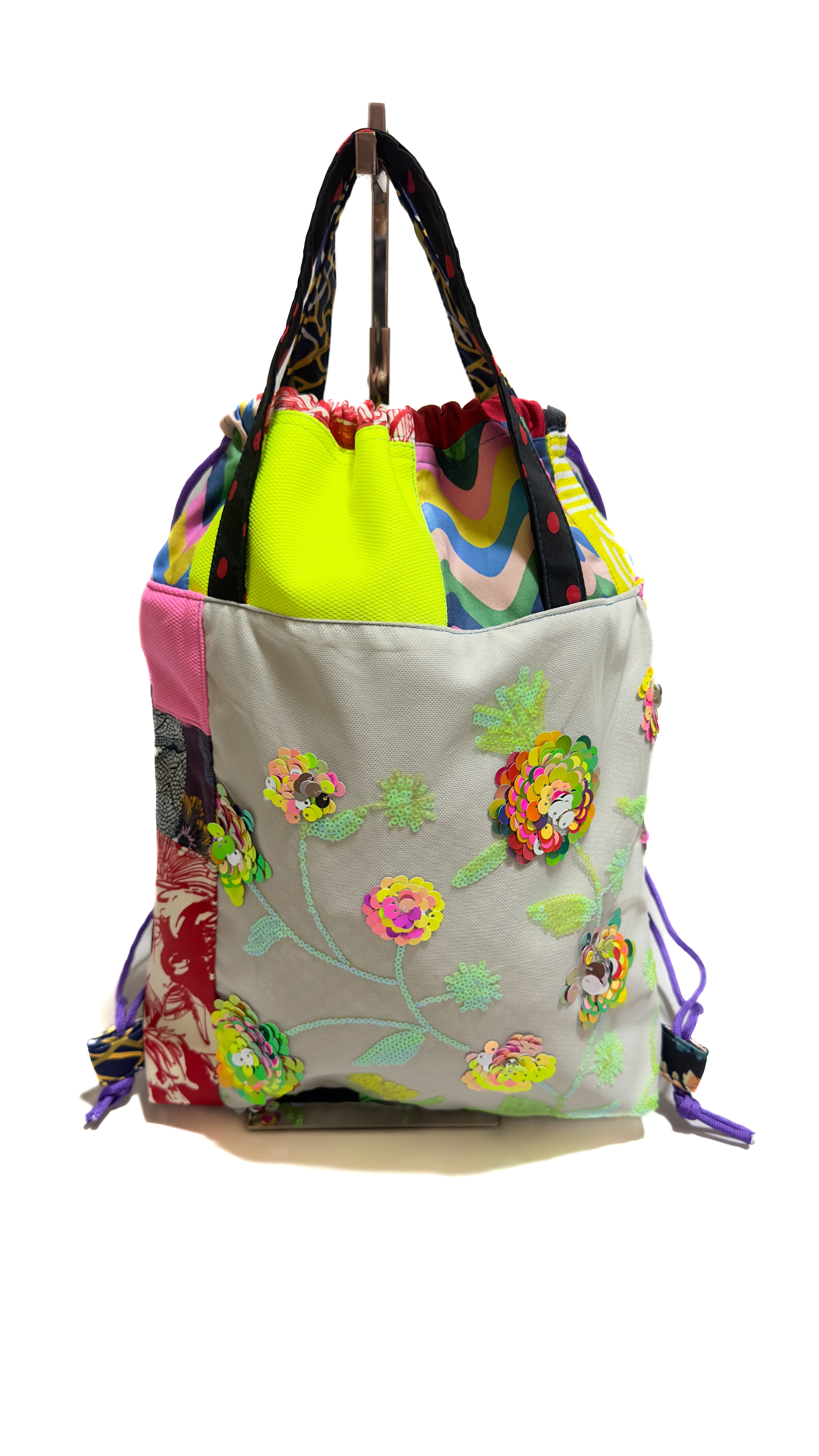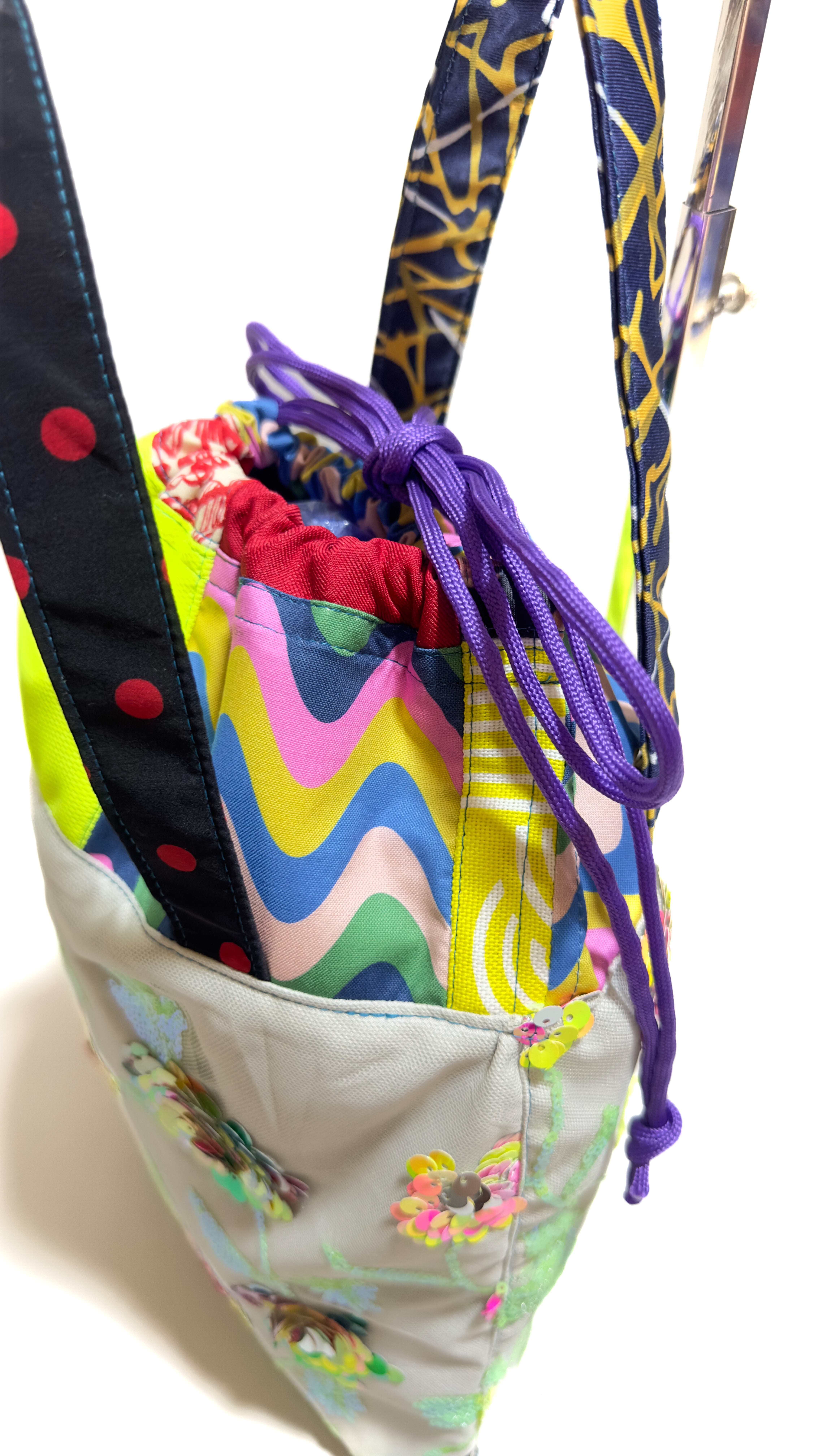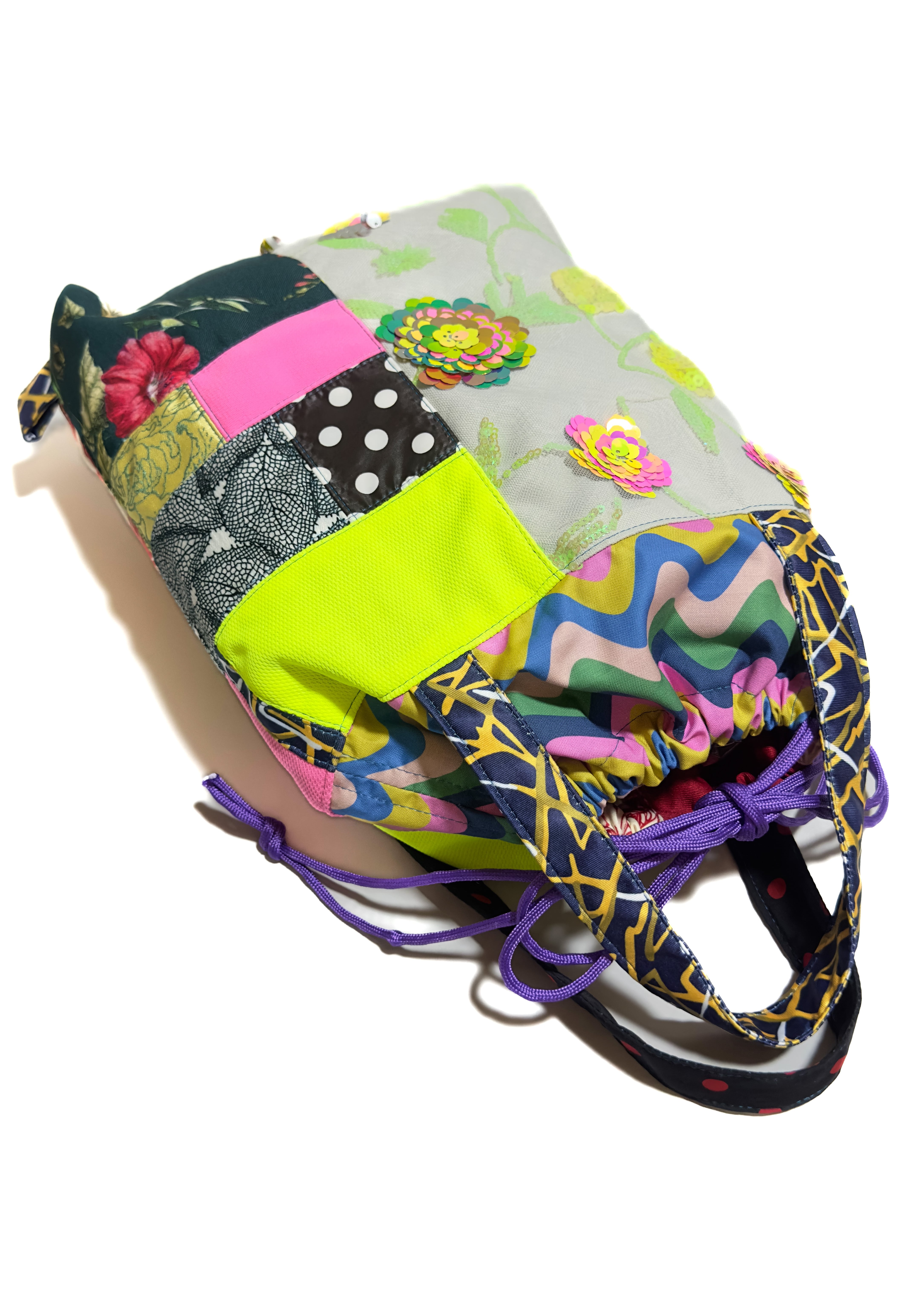 本来なら廃棄されてしまう端材を新しい素材と組み合わせてパッチワークし、新しい型に仕上げた a Linden:tree オリジナルのサスティナブルな巾着タイプのエコトートバッグです。