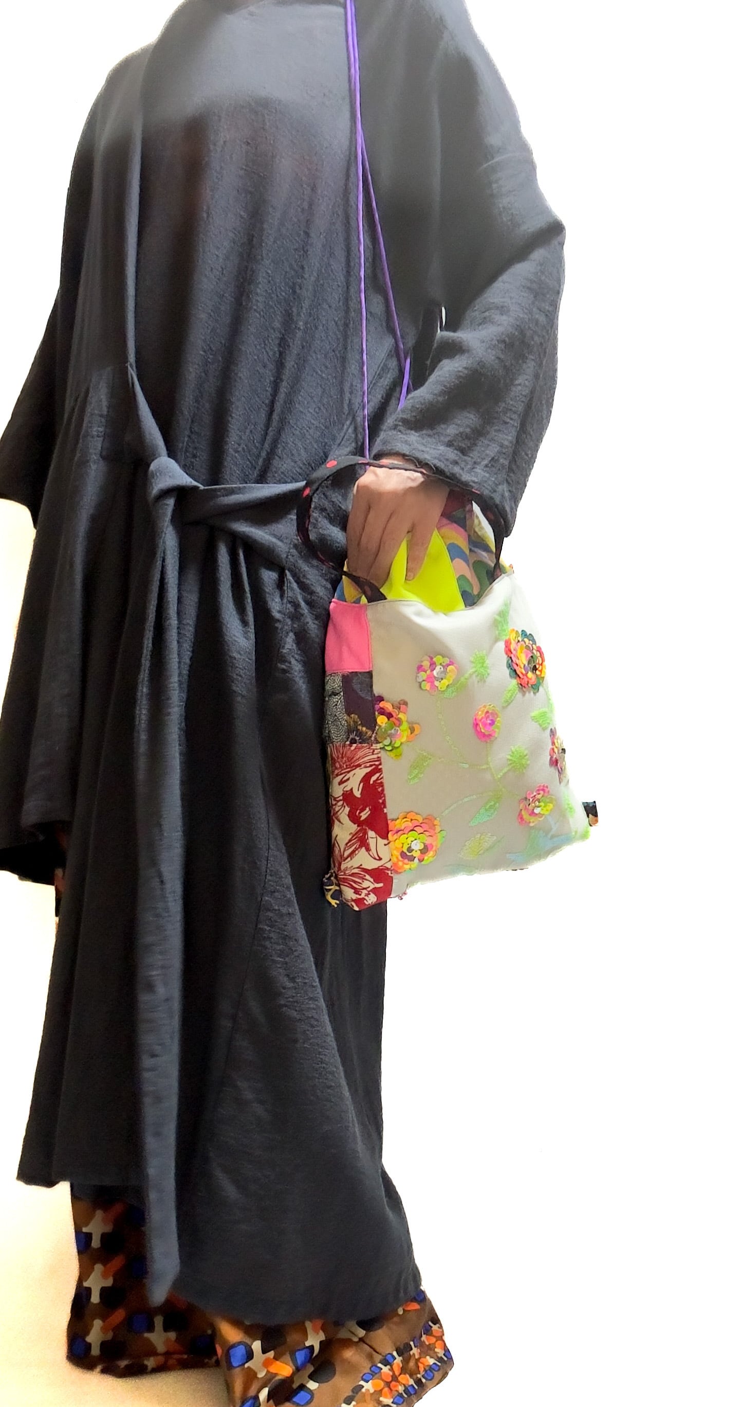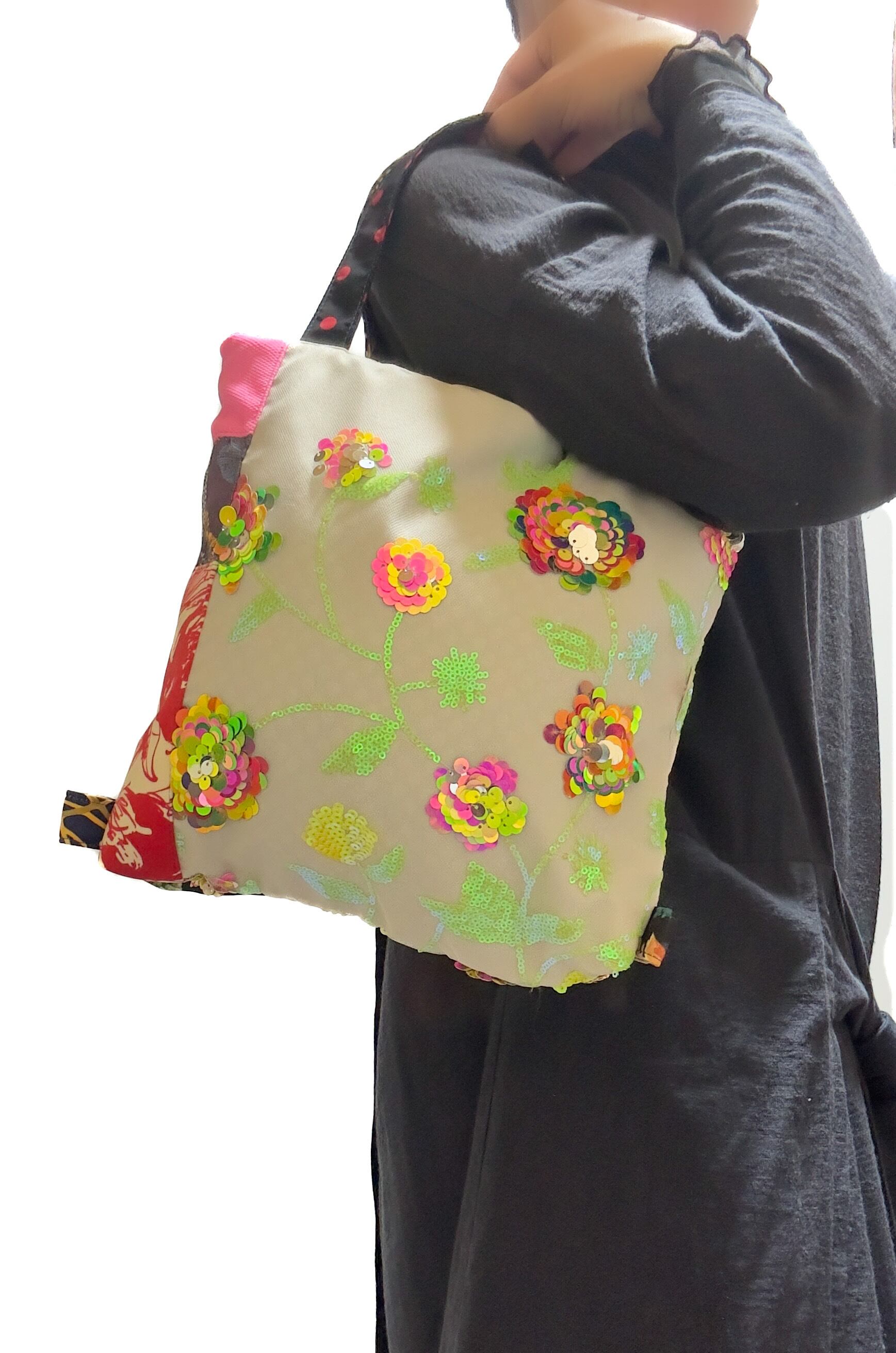 スパンコールのお花がついたチュールレースにパールグレーの布地をインして様々なお花柄、個性的な素材をいろいろとミックスしエコバッグとして製作しましたがメインで使用していただいても可愛いデザインです。