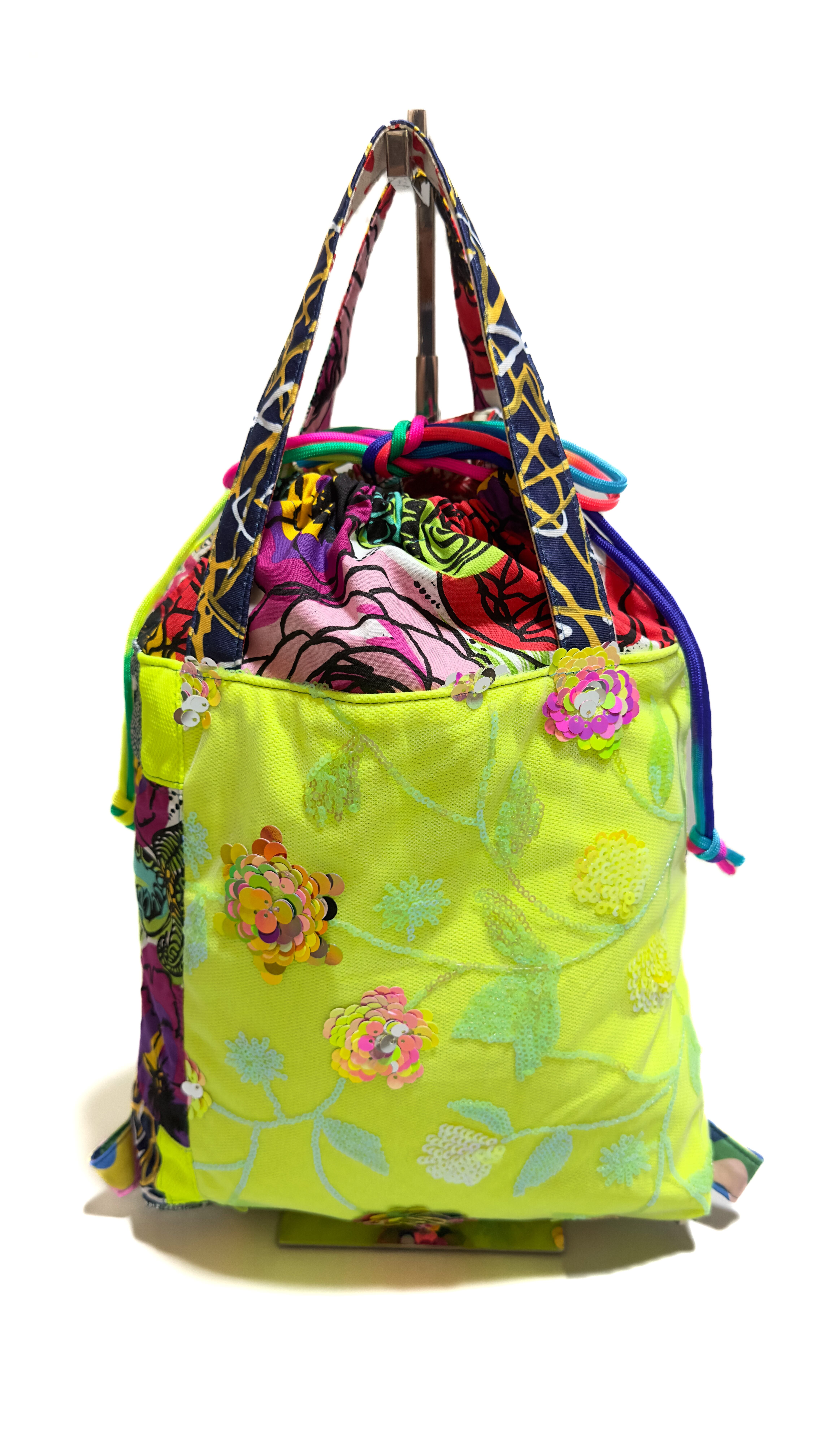 スパンコールのお花がついたチュールレースにキイロの布地をインして様々なお花柄、個性的な素材をいろいろとミックスしエコバッグとして製作しましたがメインで使用していただいても◎虹色の紐もかわいいんです。
