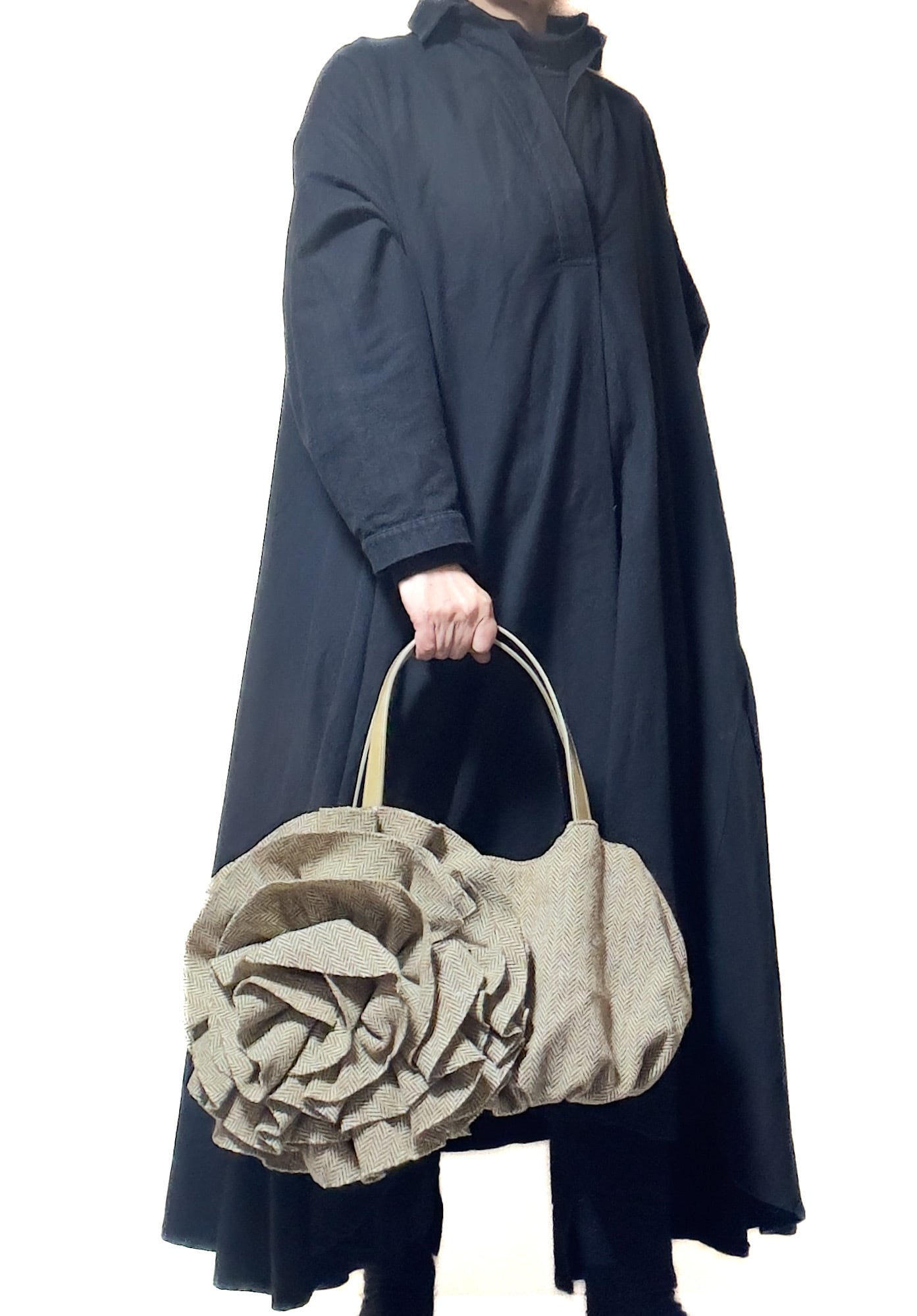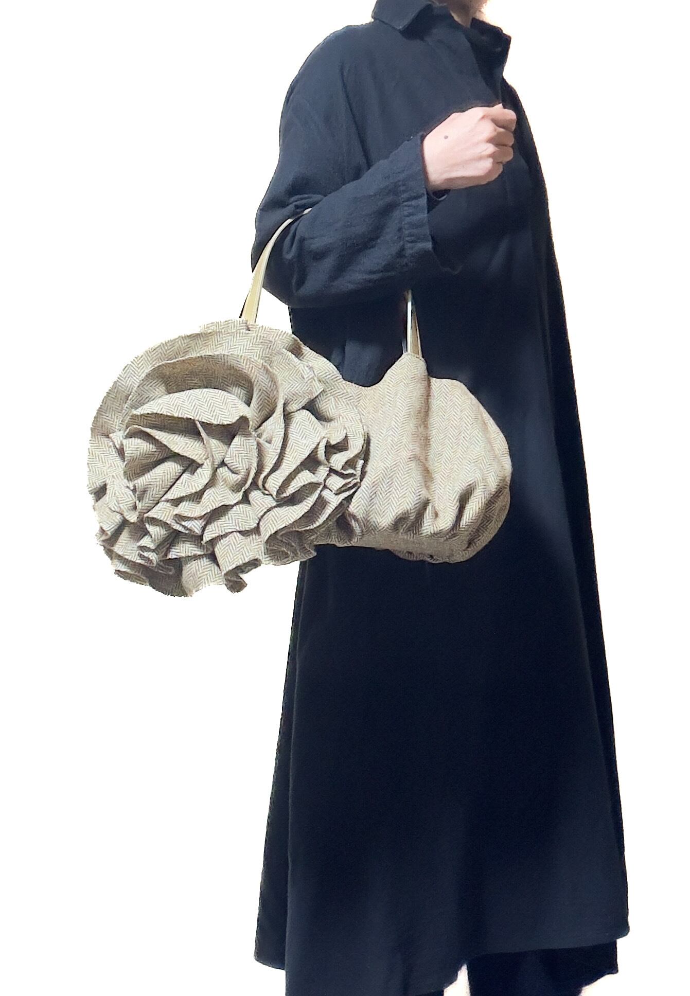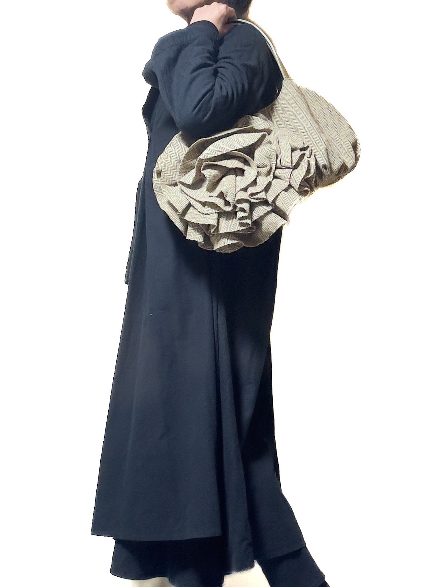 手作業で縫い付けた、ふわりとした大きなお花がアイコンのウールヘリンボーンを使用したカボチャ型バッグのです。