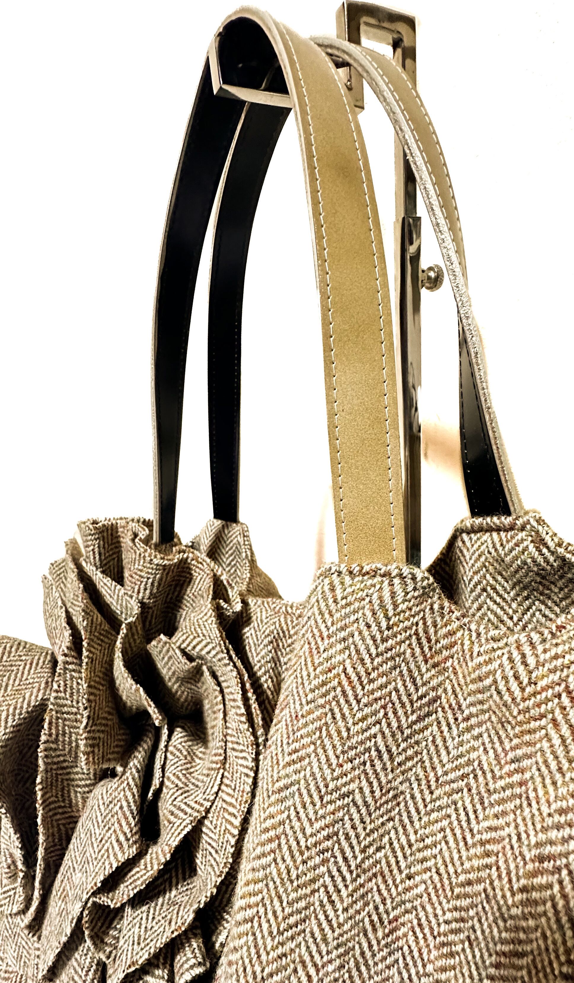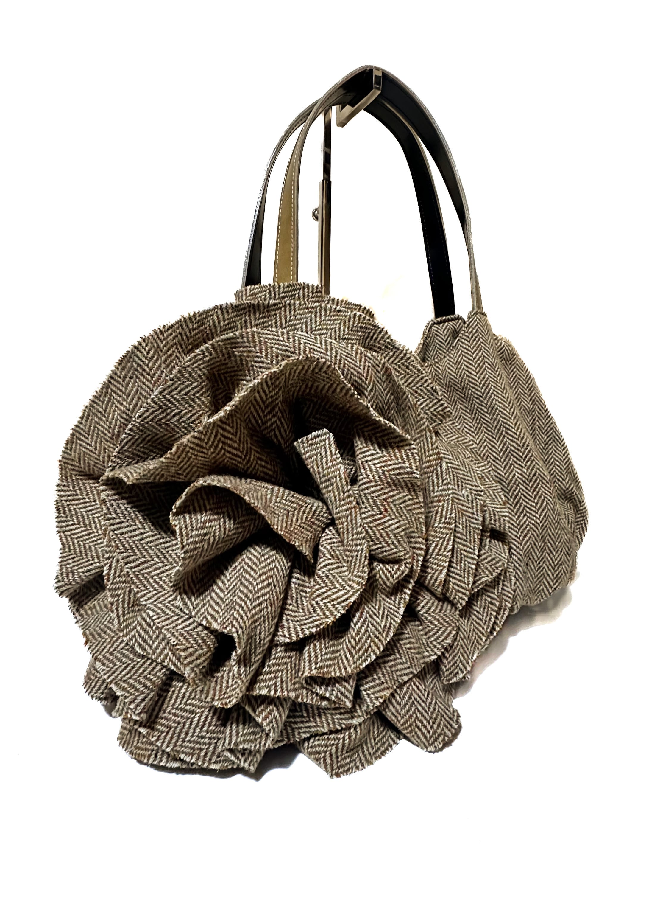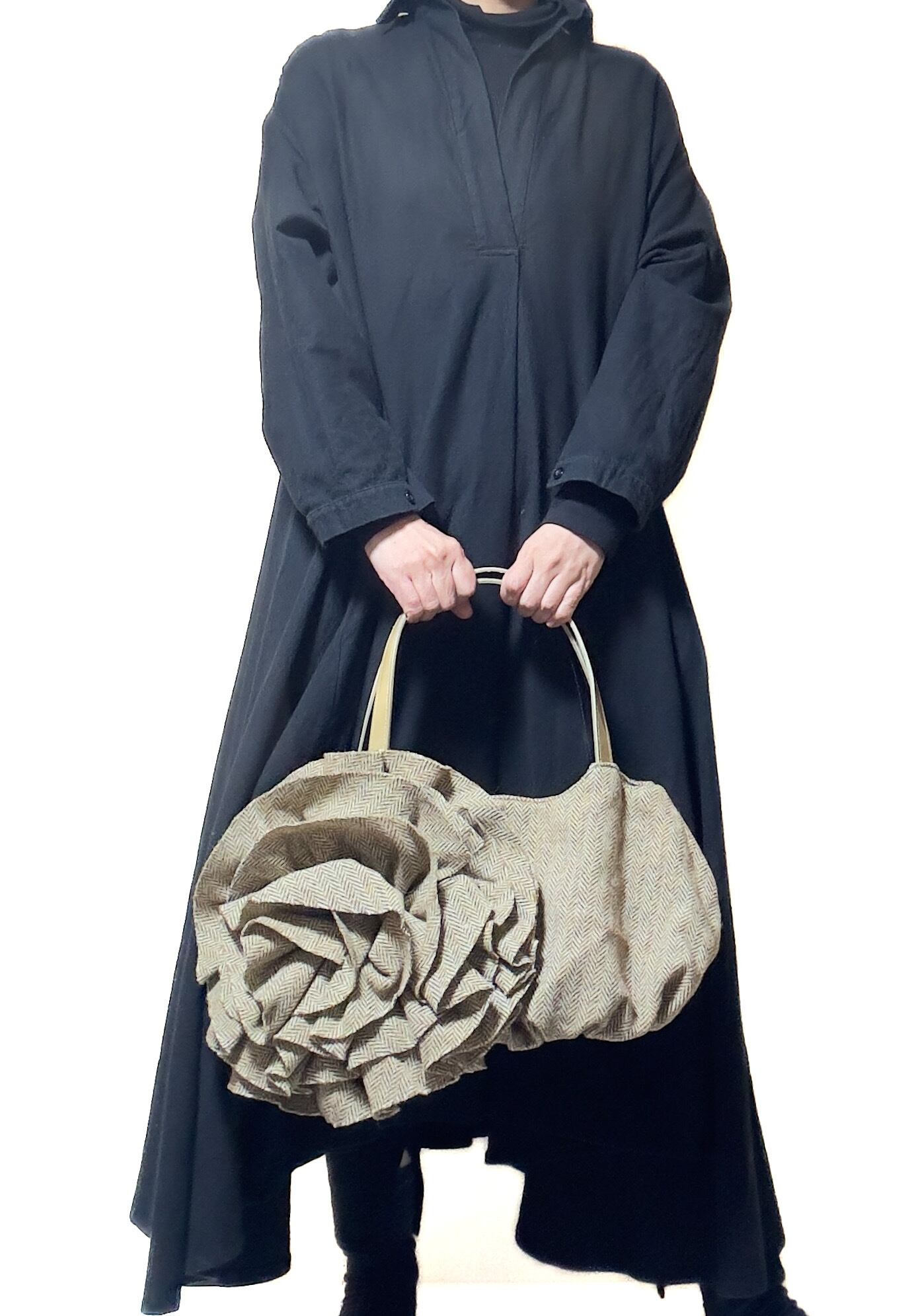 手作業で縫い付けた、ふわりとした大きなお花がアイコンのウールヘリンボーンを使用したカボチャ型バッグのです。