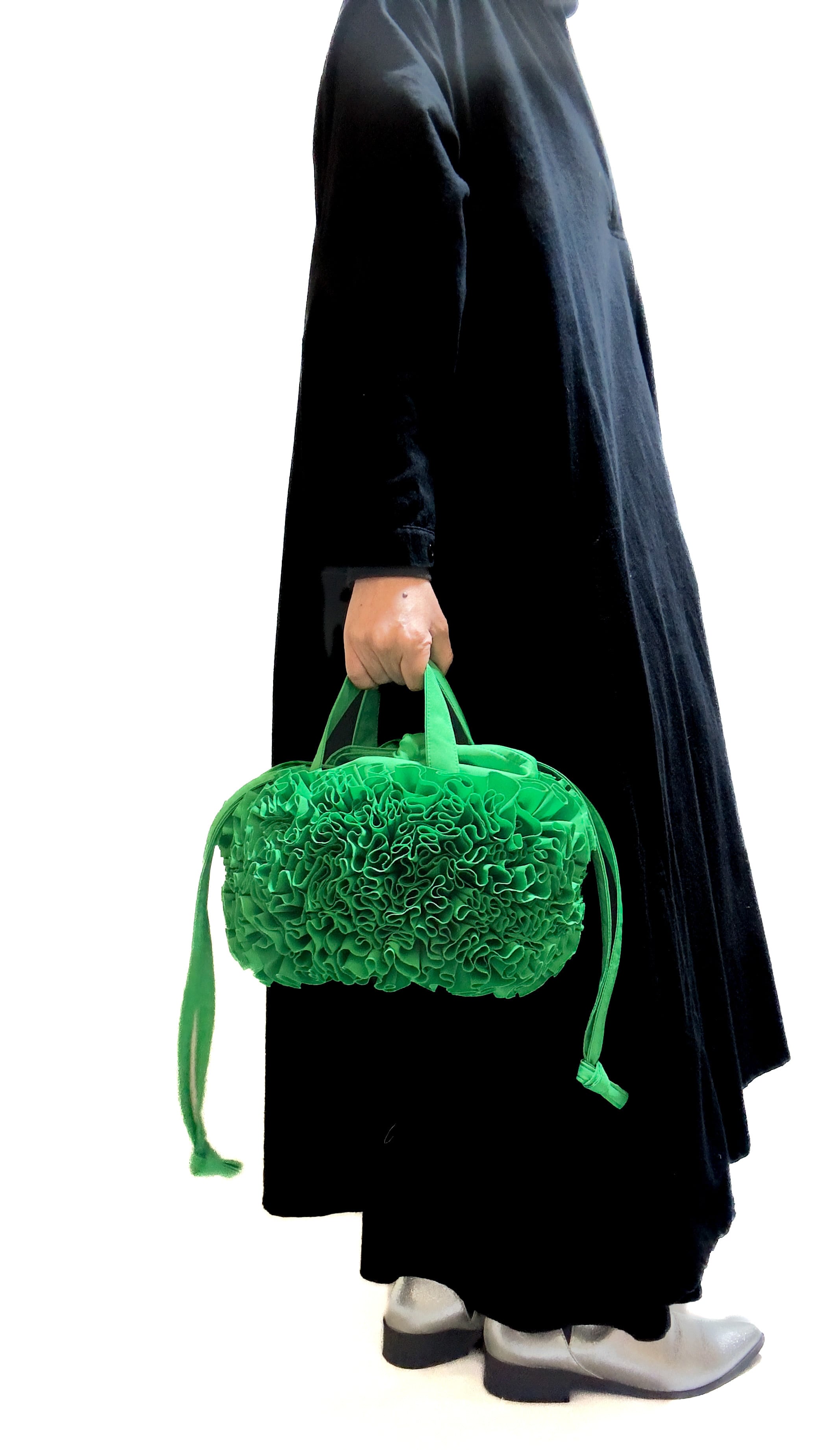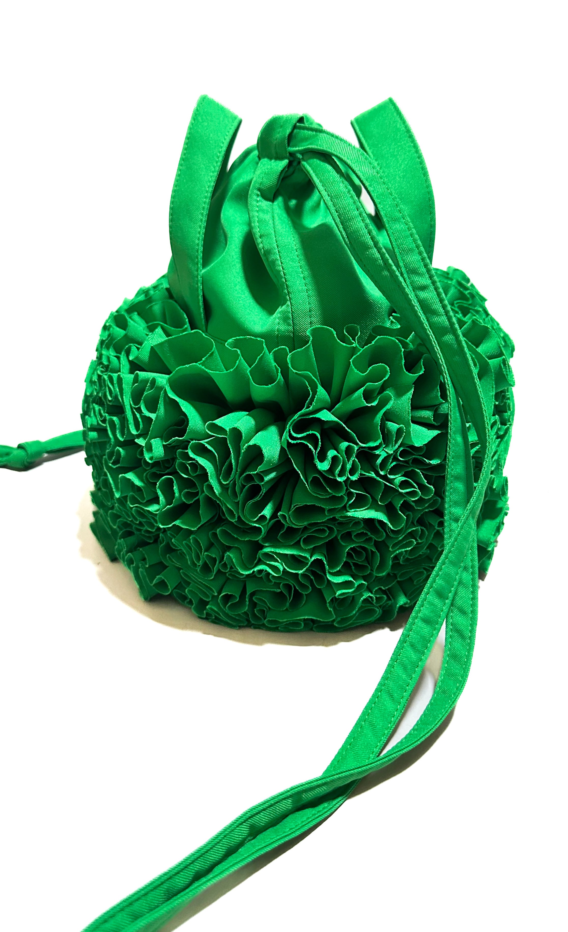 ブーケをイメージしフリルを一つ一つお花の形にしながら手作業でぐるりと縫い付けた特徴的な巾着バックです。
