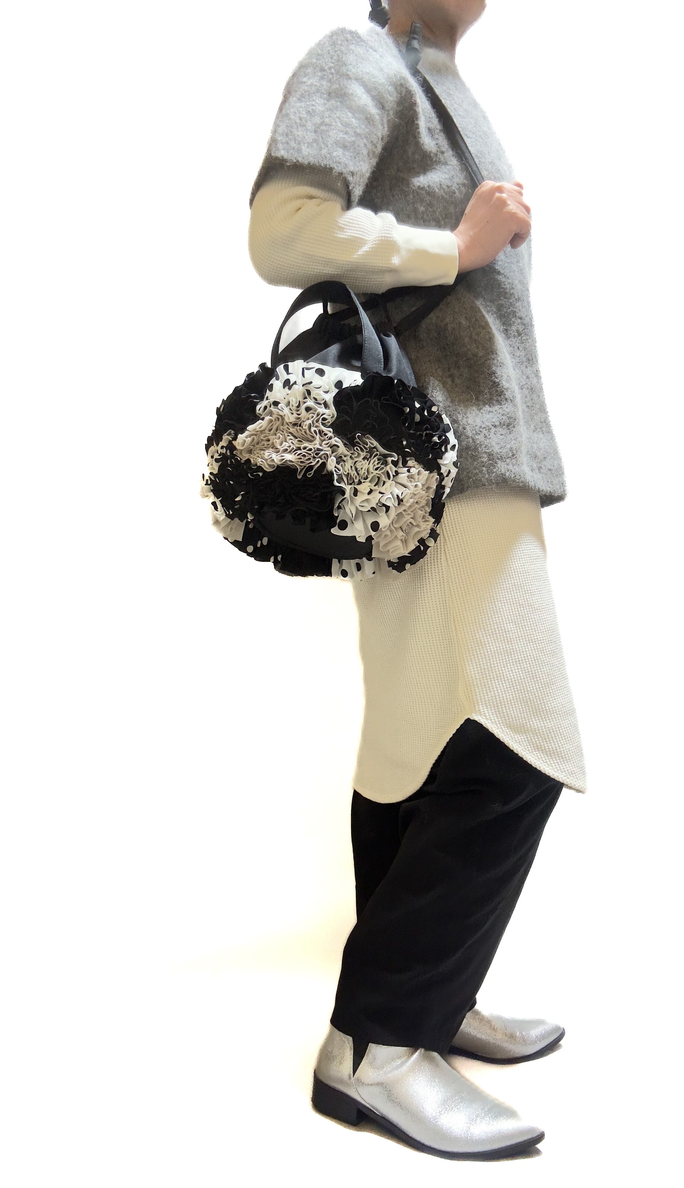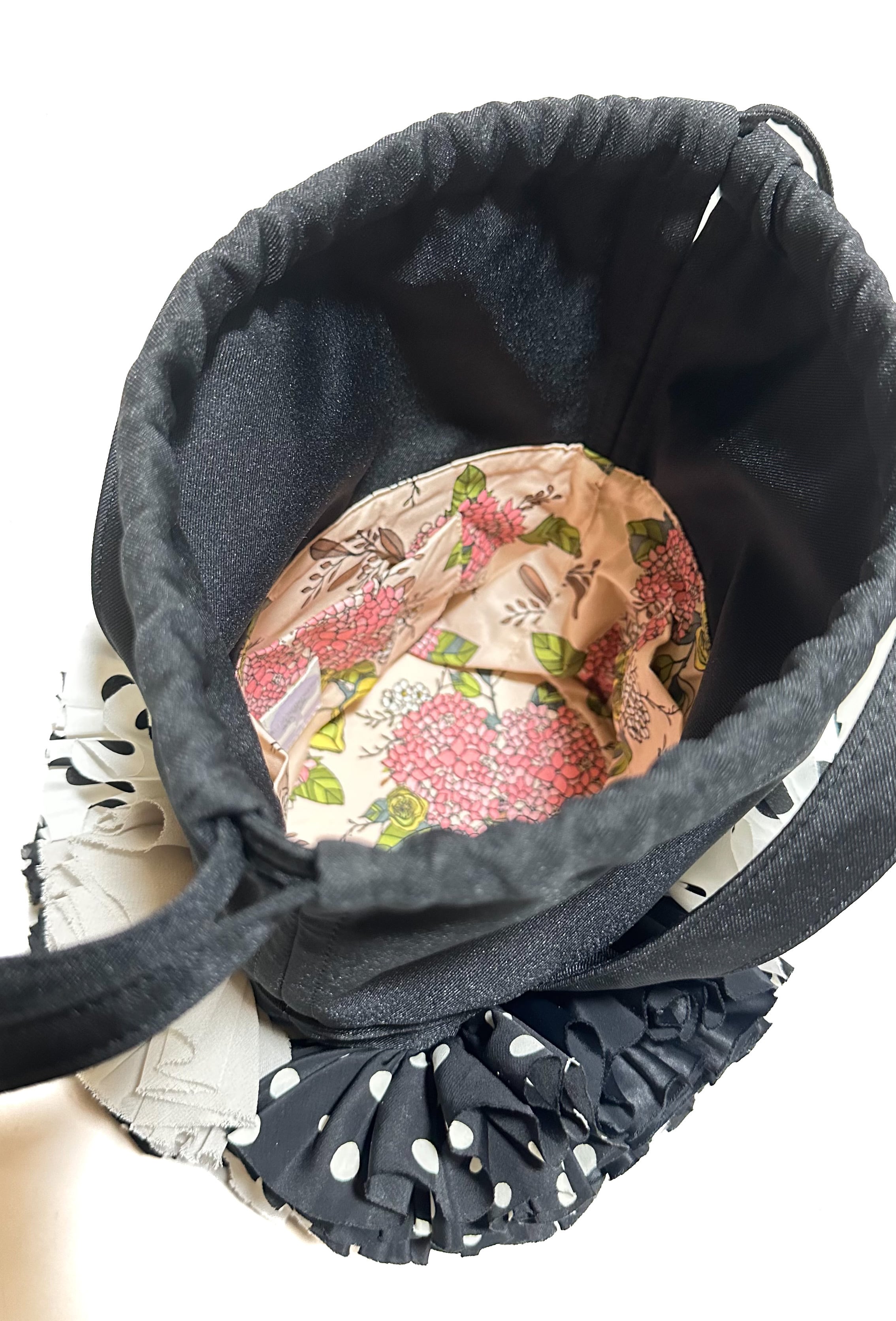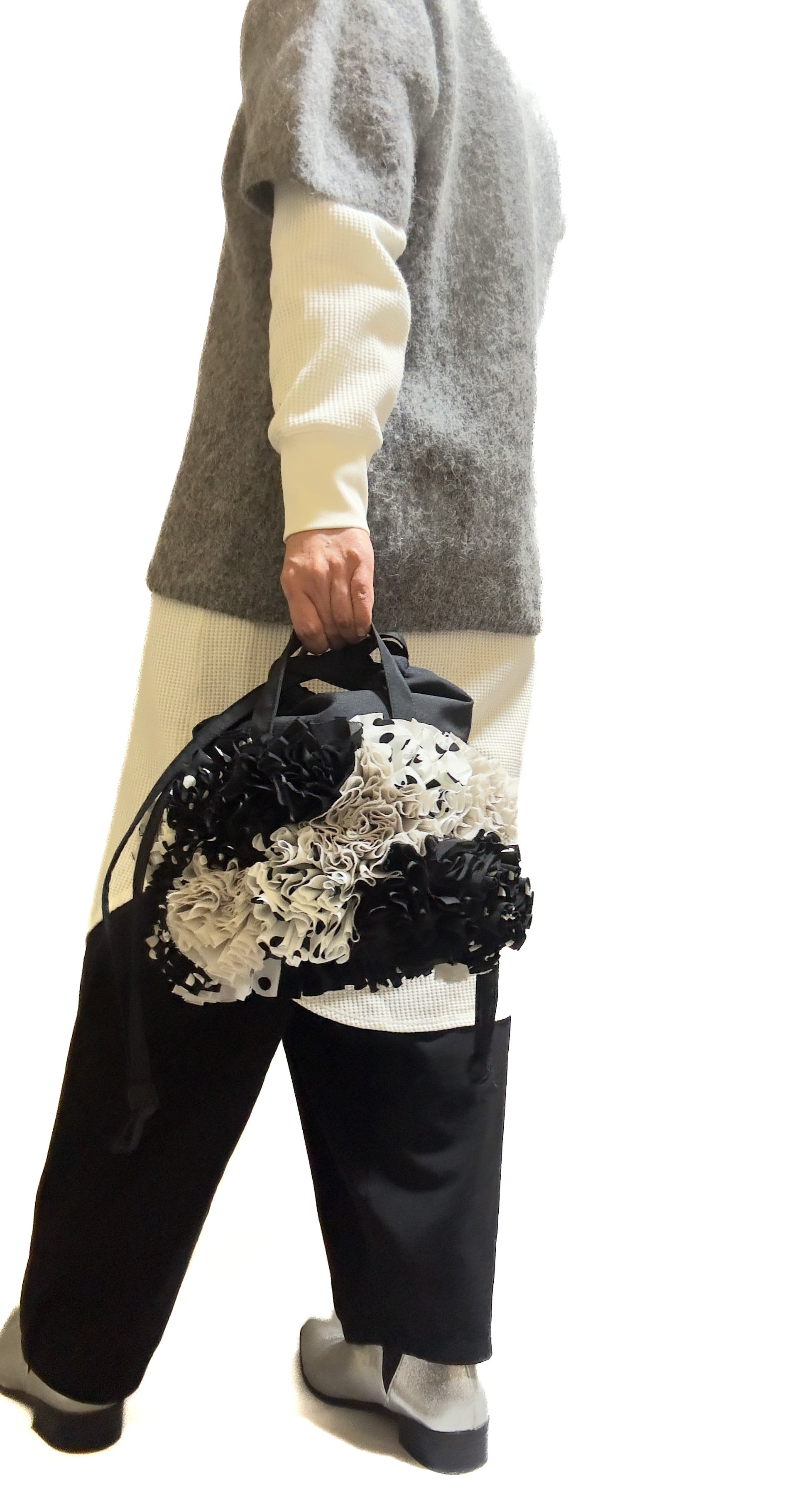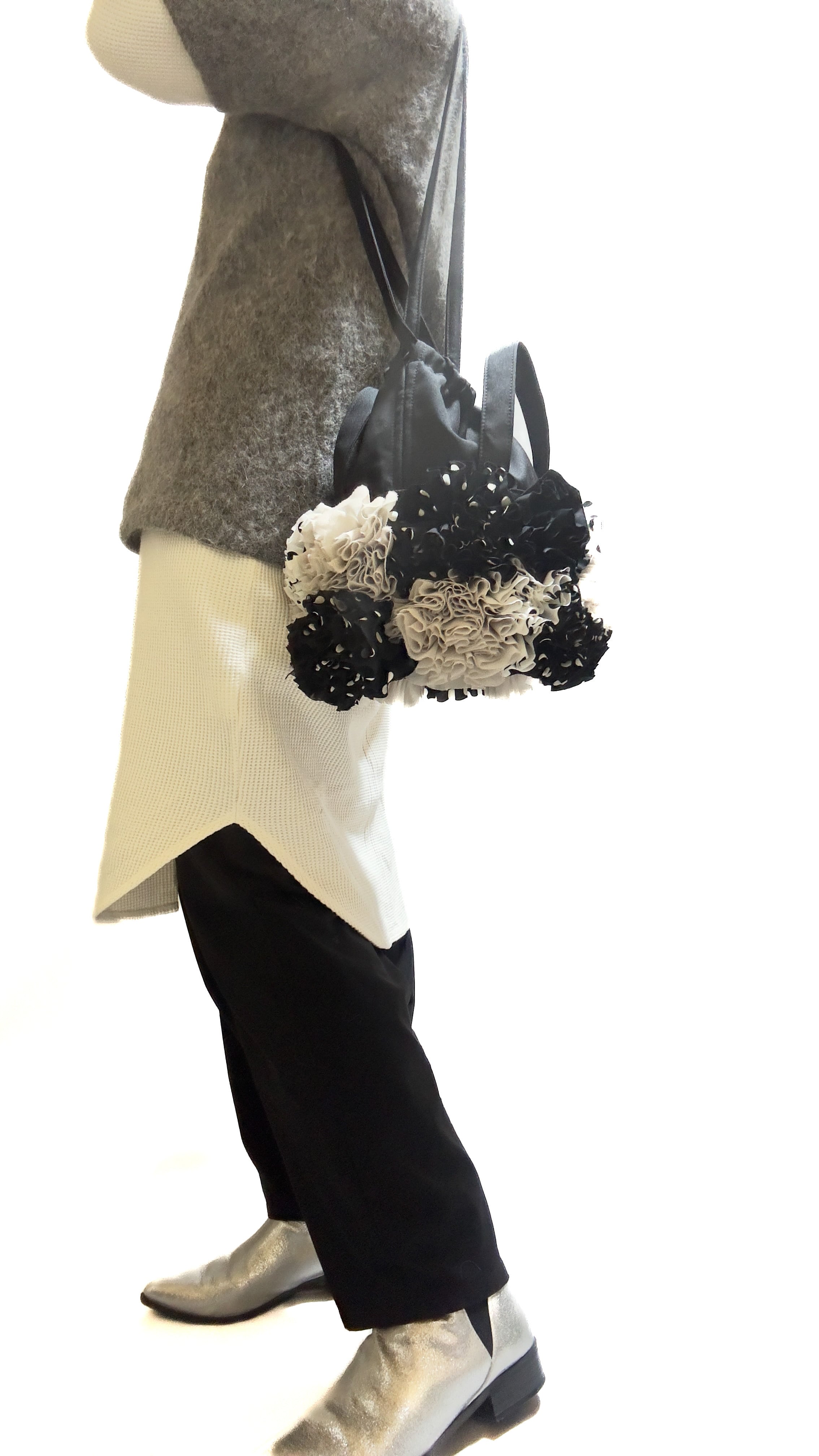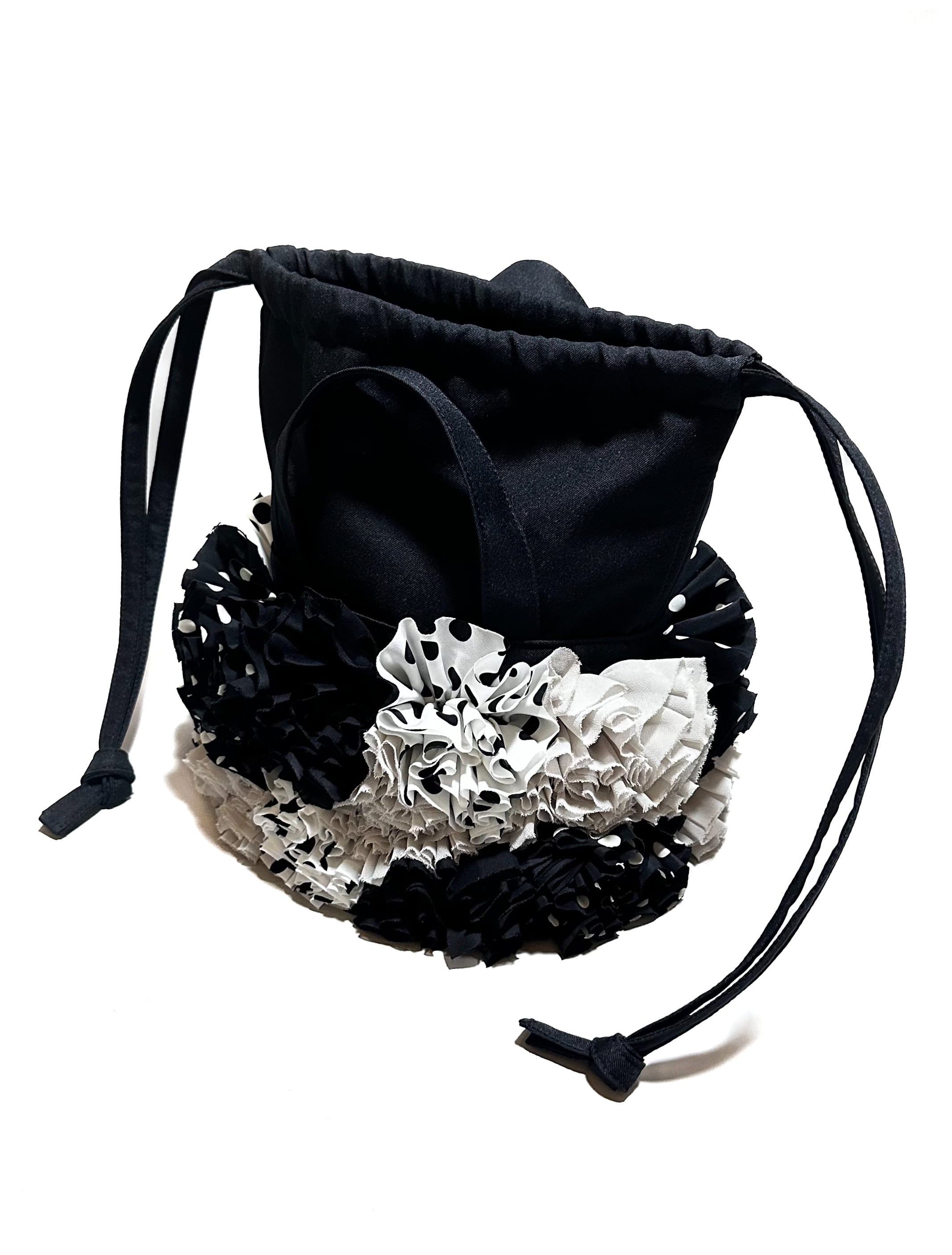 ブーケをイメージしフリルを一つ一つお花の形にしながら手作業でぐるりと縫い付けた特徴的な巾着バックです。