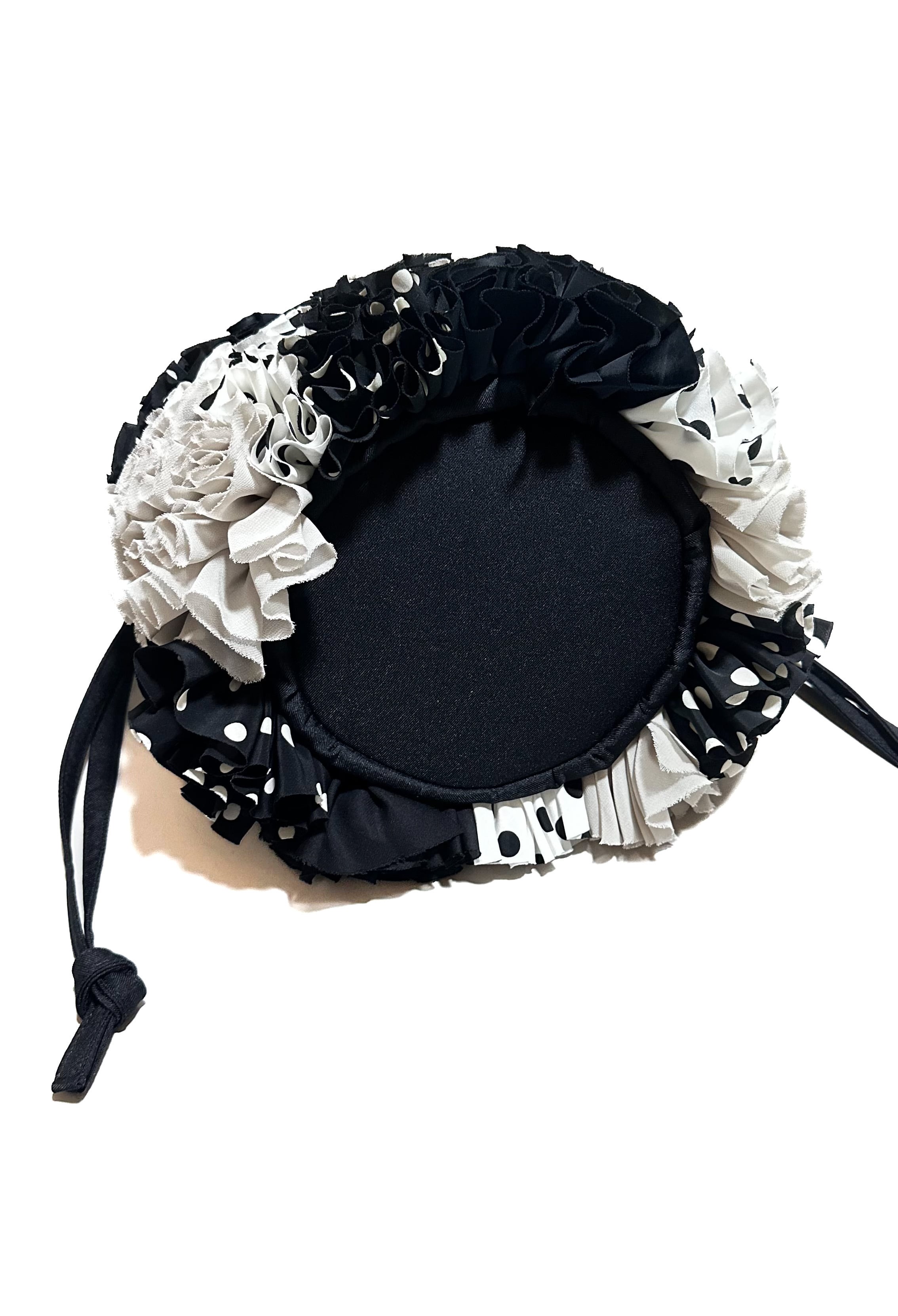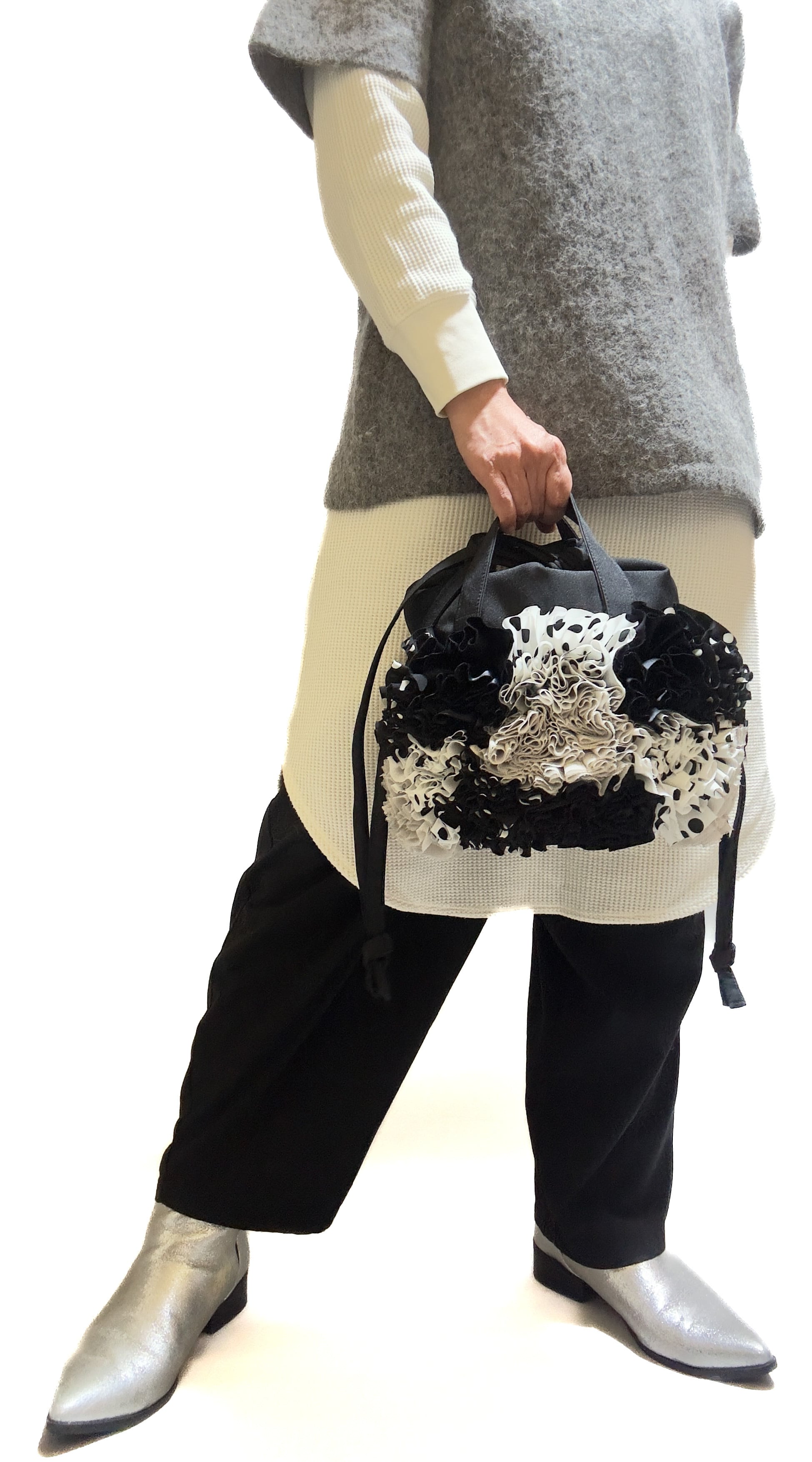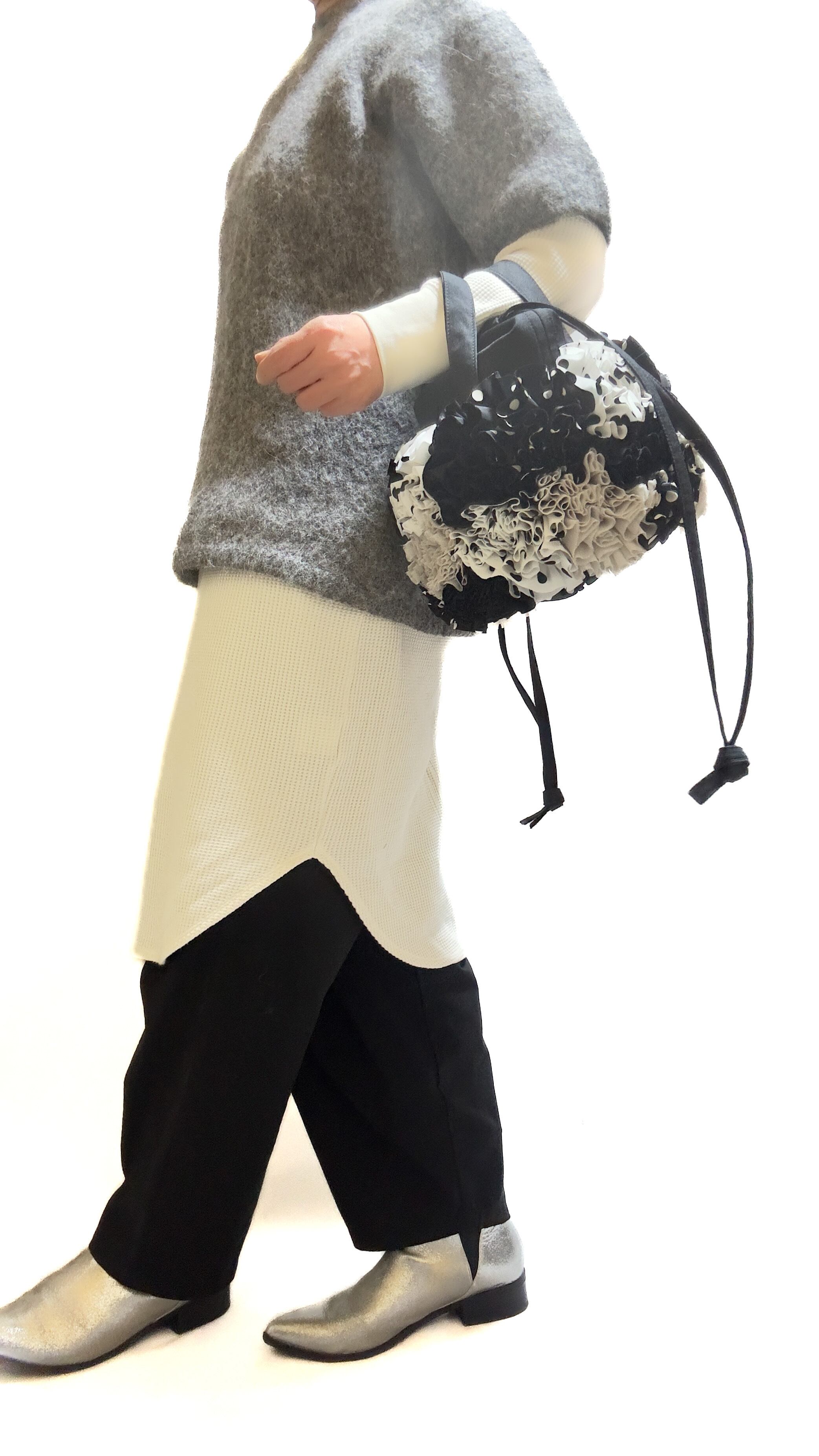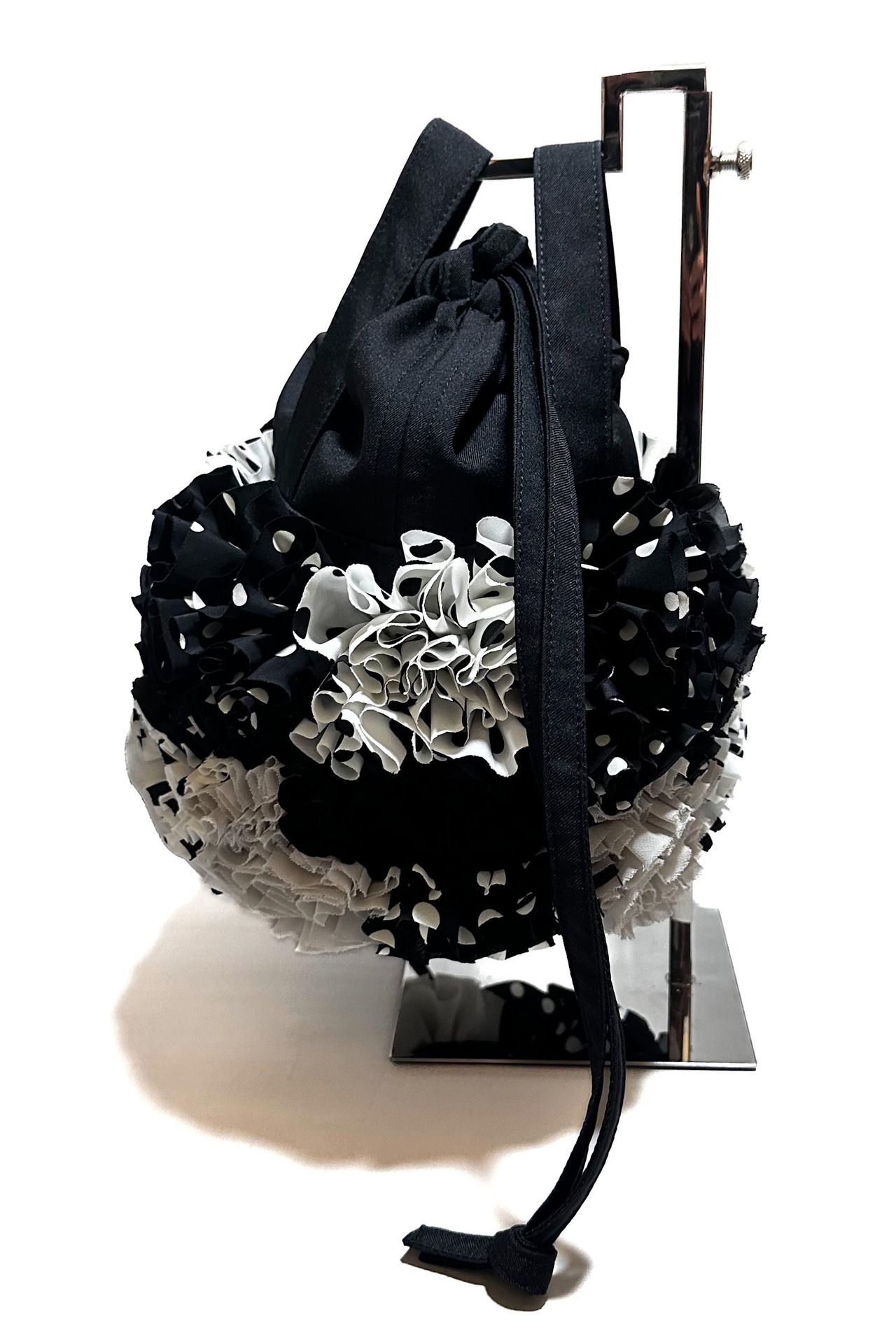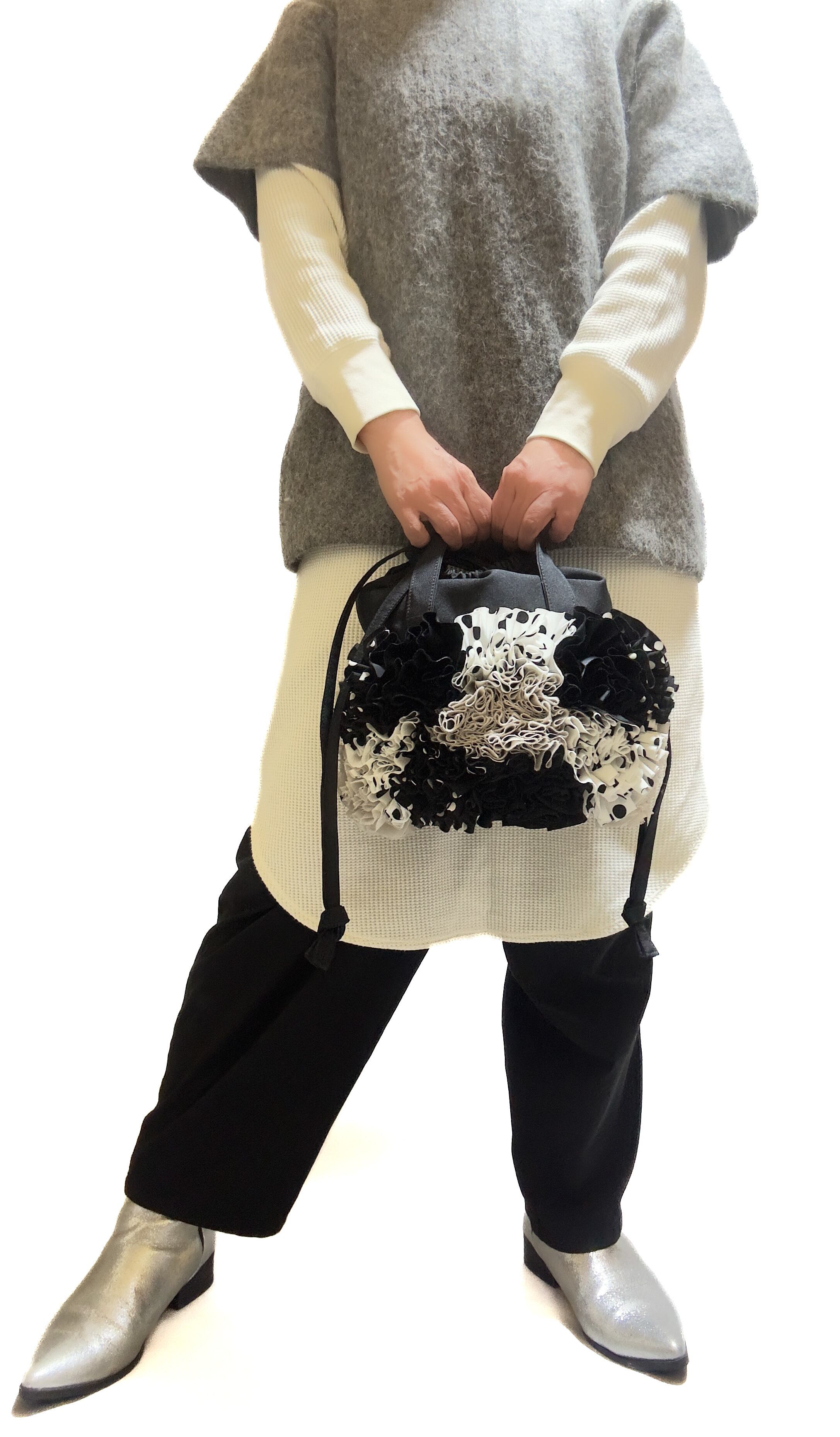 ブーケをイメージしフリルを一つ一つお花の形にしながら手作業でぐるりと縫い付けた特徴的な巾着バックです。