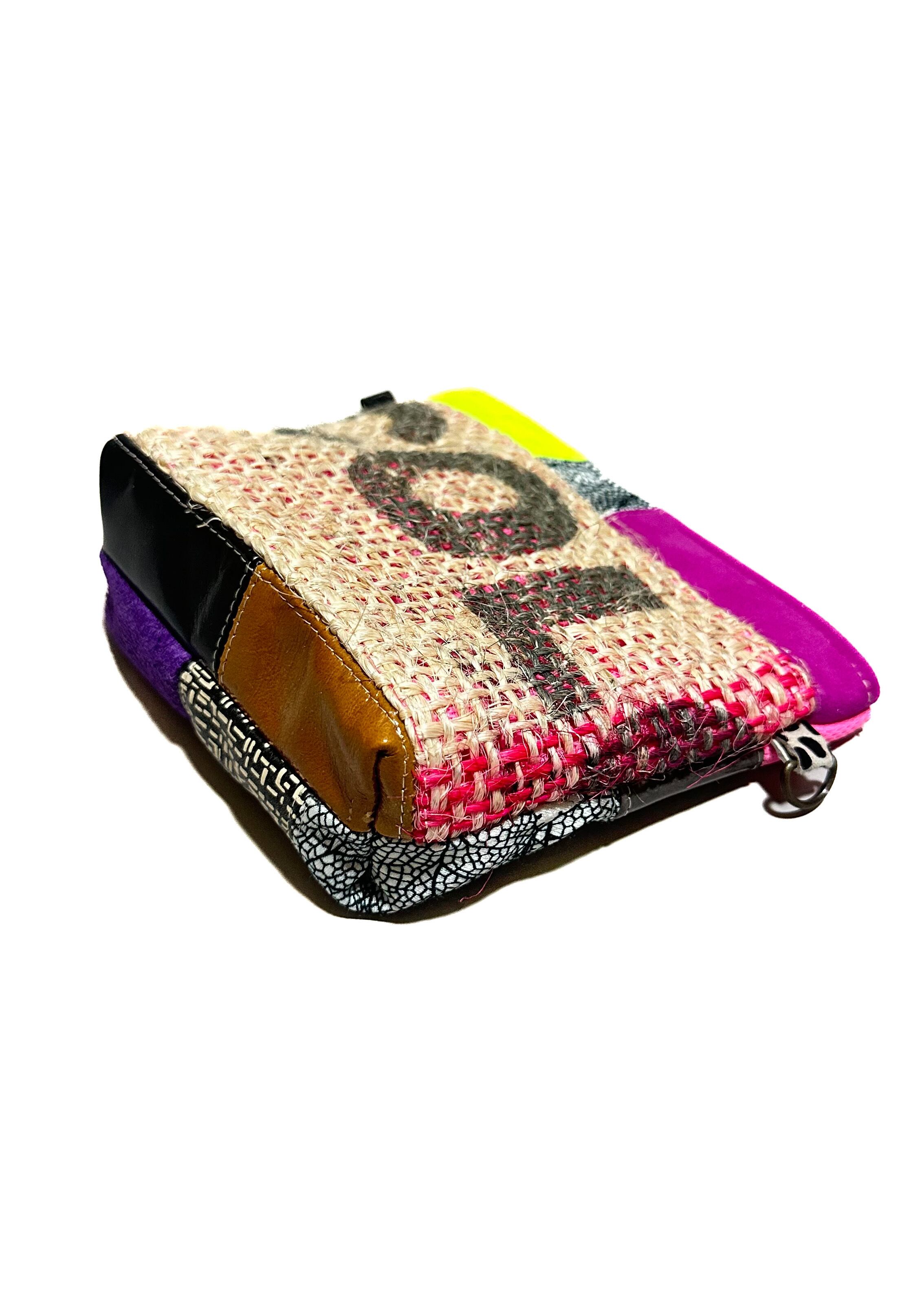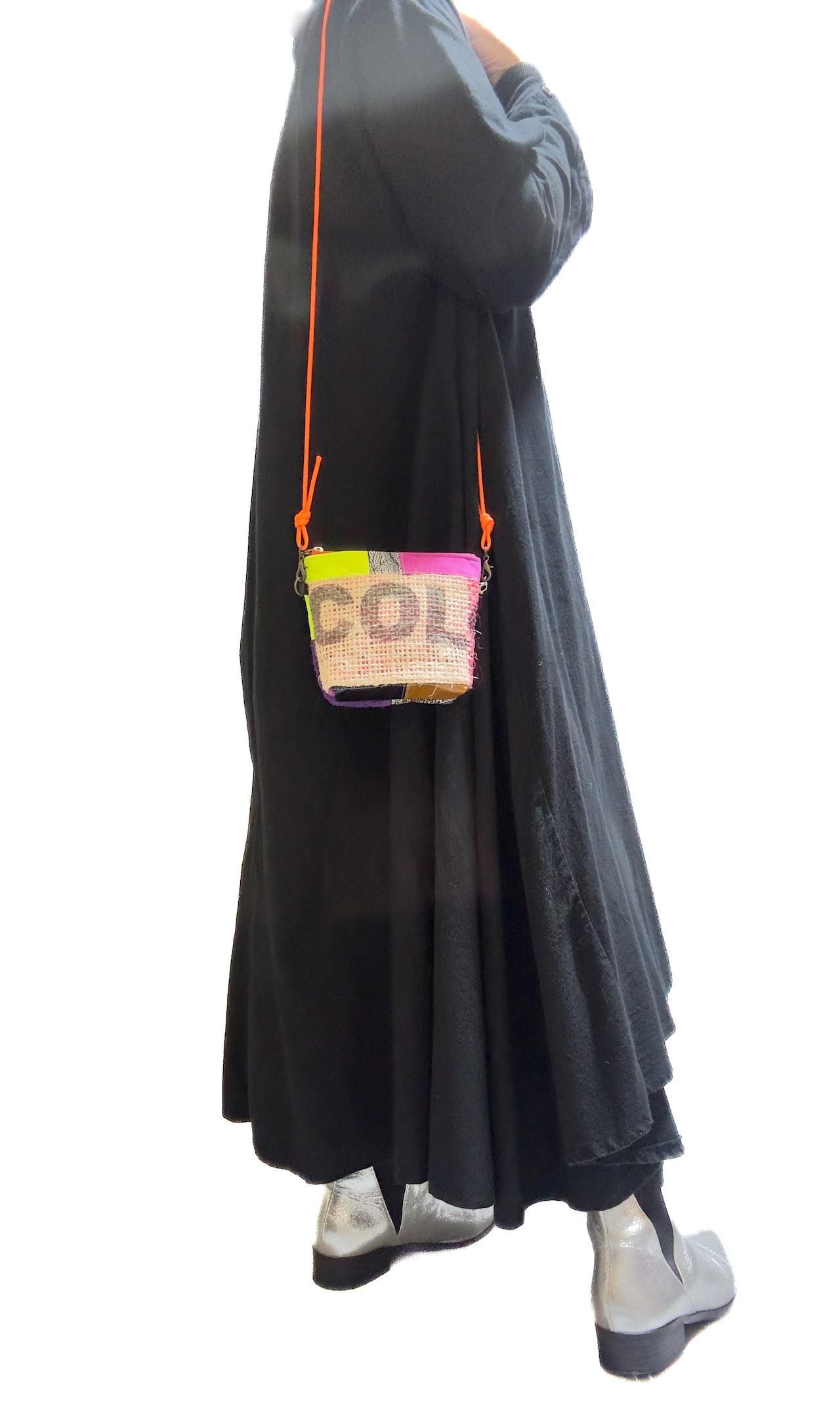 コーヒーの麻袋と本来は廃棄されてしまう端材や新しい素材などを組み合わせパッチワークし、新しいカタチに仕上げました。