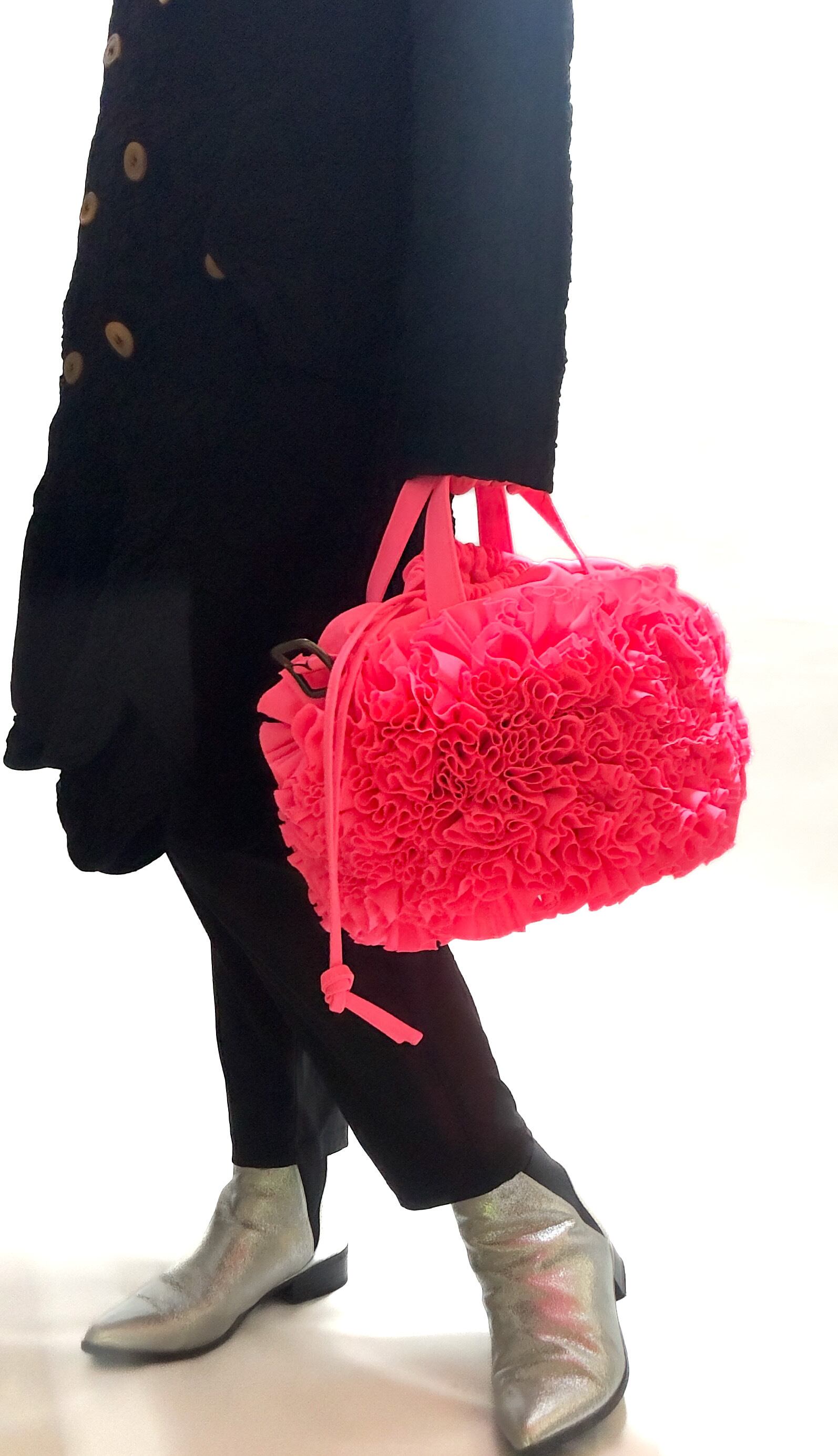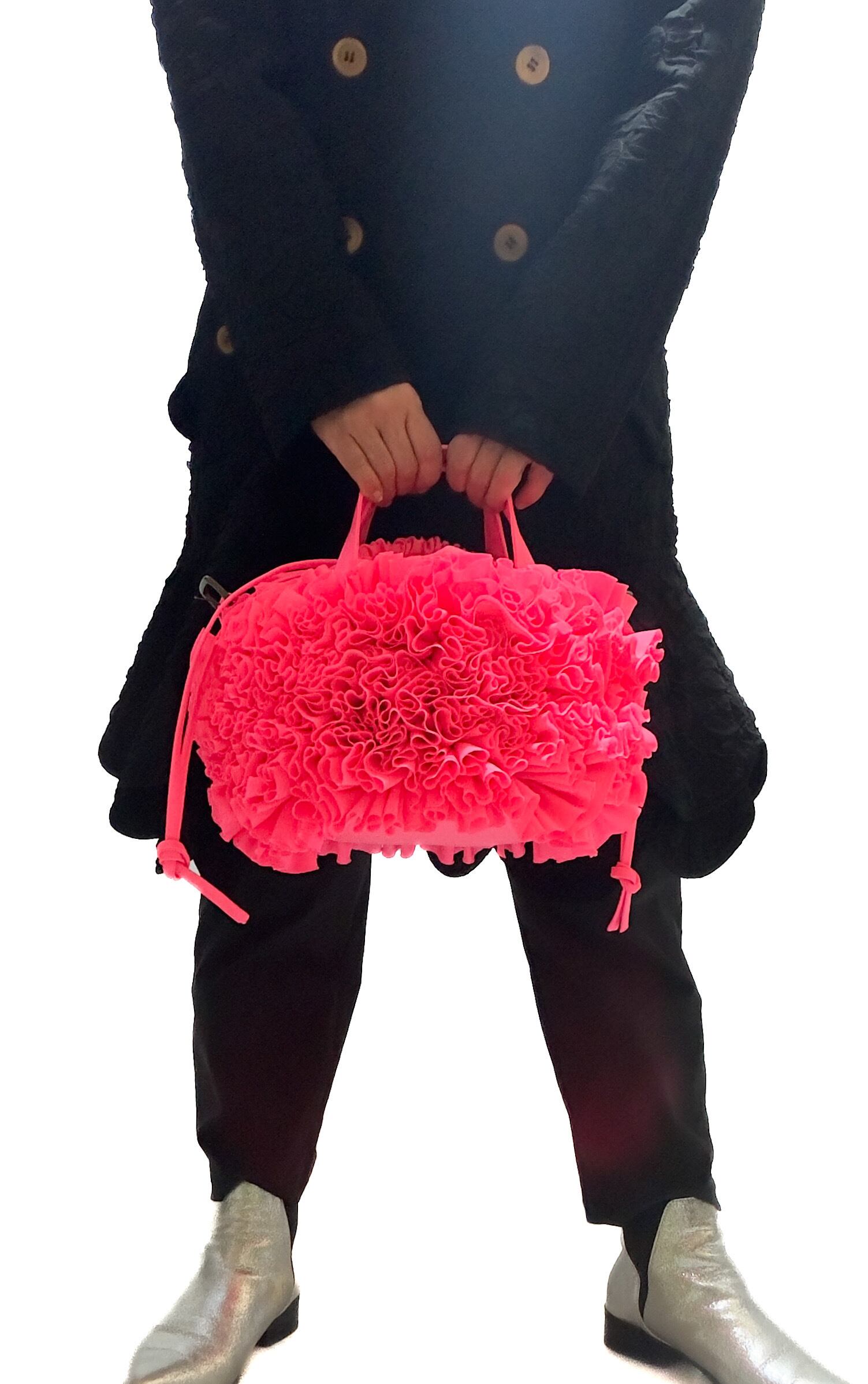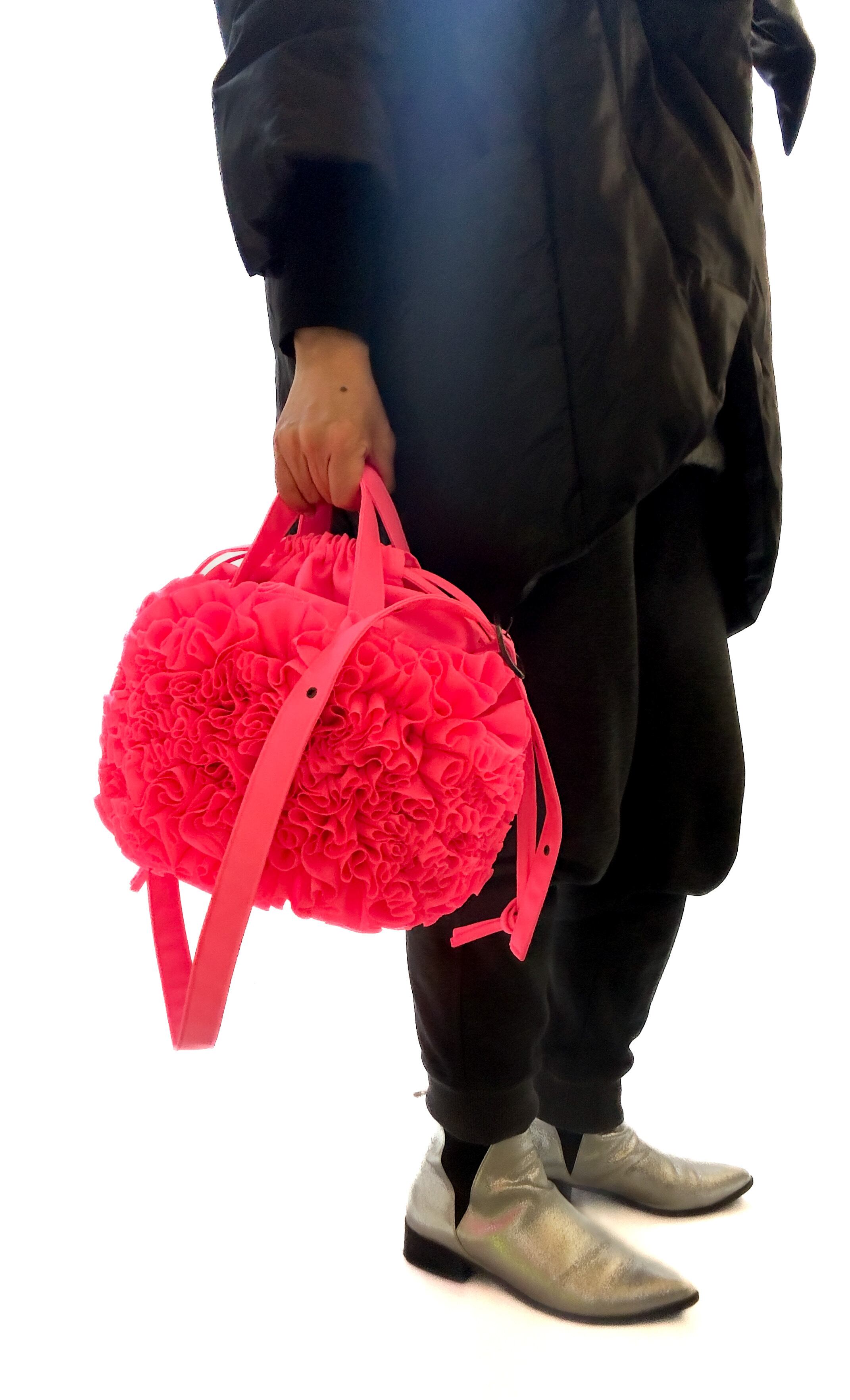 ブーケをイメージしフリルを一つ一つお花の形にしながら手作業でぐるりと縫い付けた特徴的なバケツ型の巾着バックです。