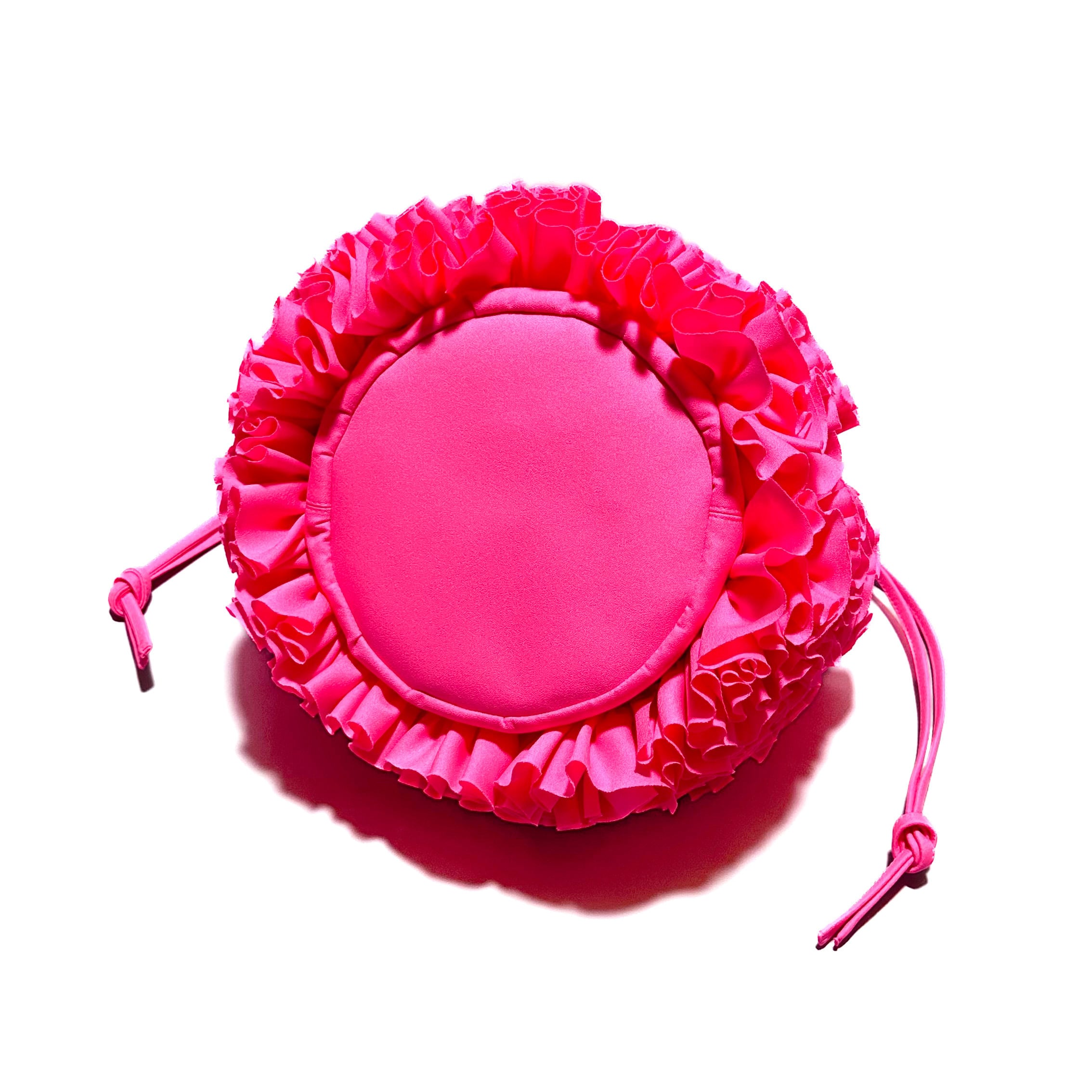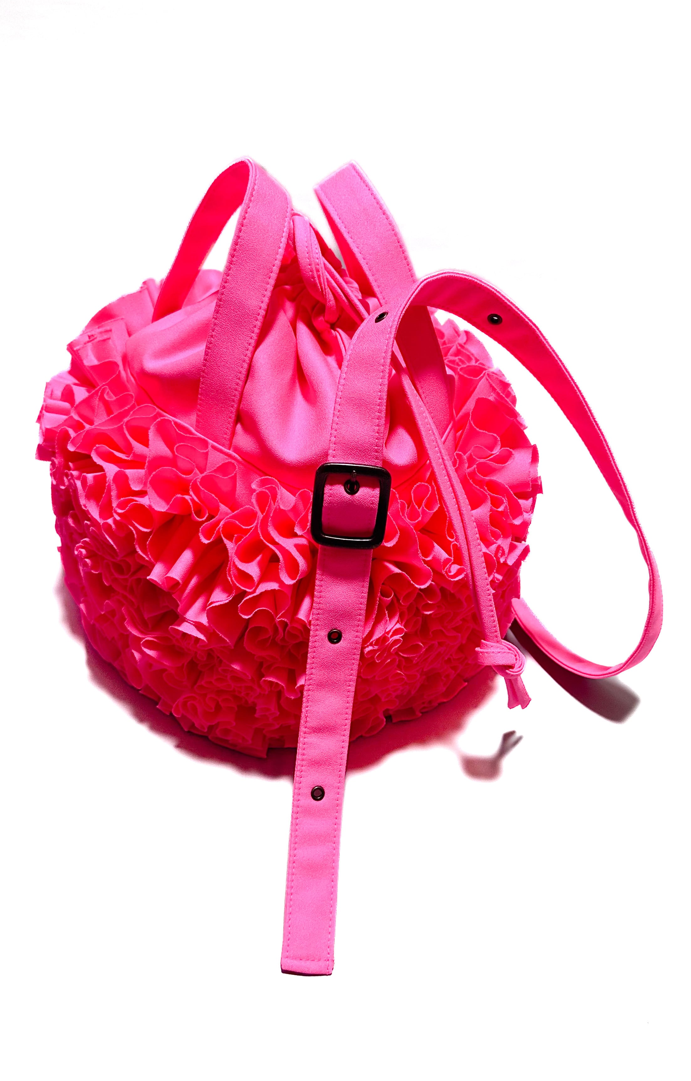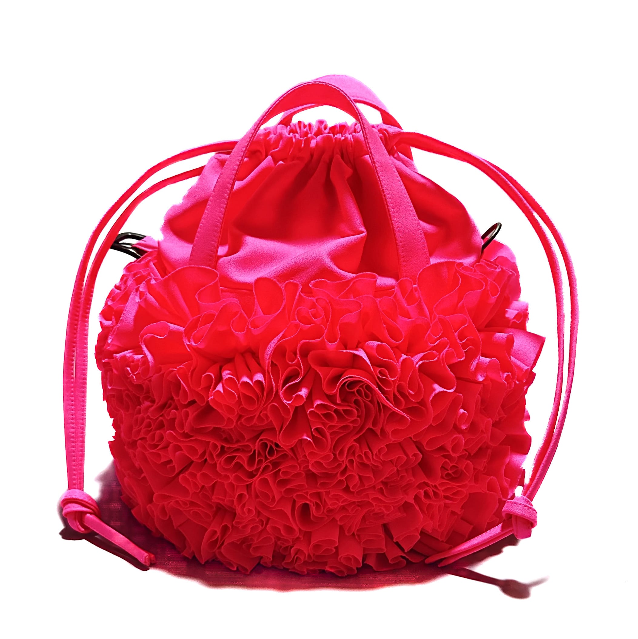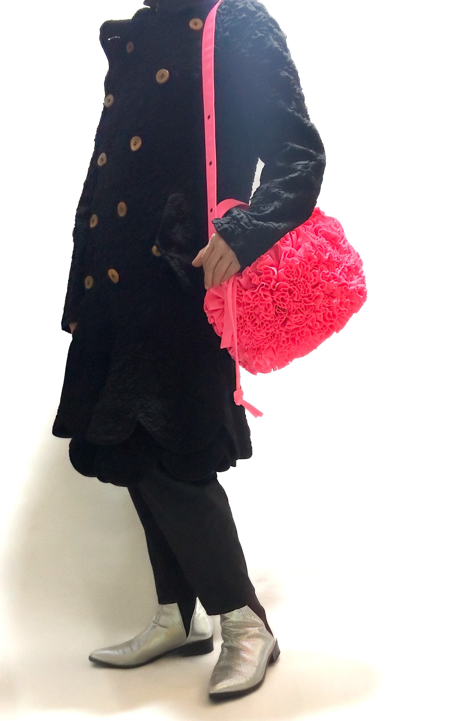 ブーケをイメージしフリルを一つ一つお花の形にしながら手作業でぐるりと縫い付けた特徴的なバケツ型の巾着バックです。
