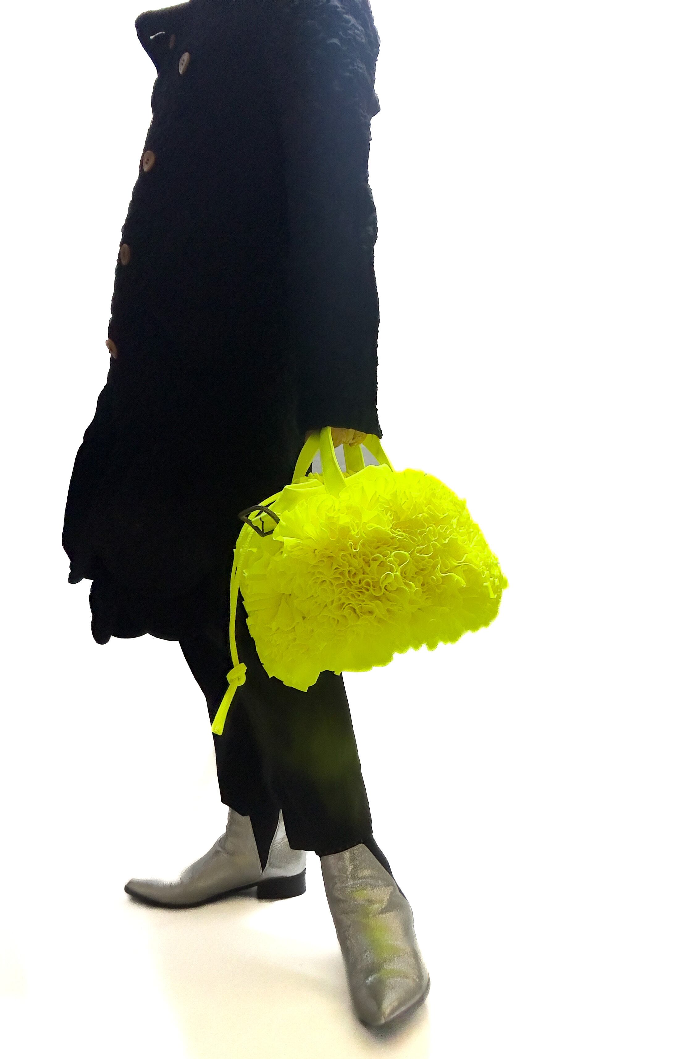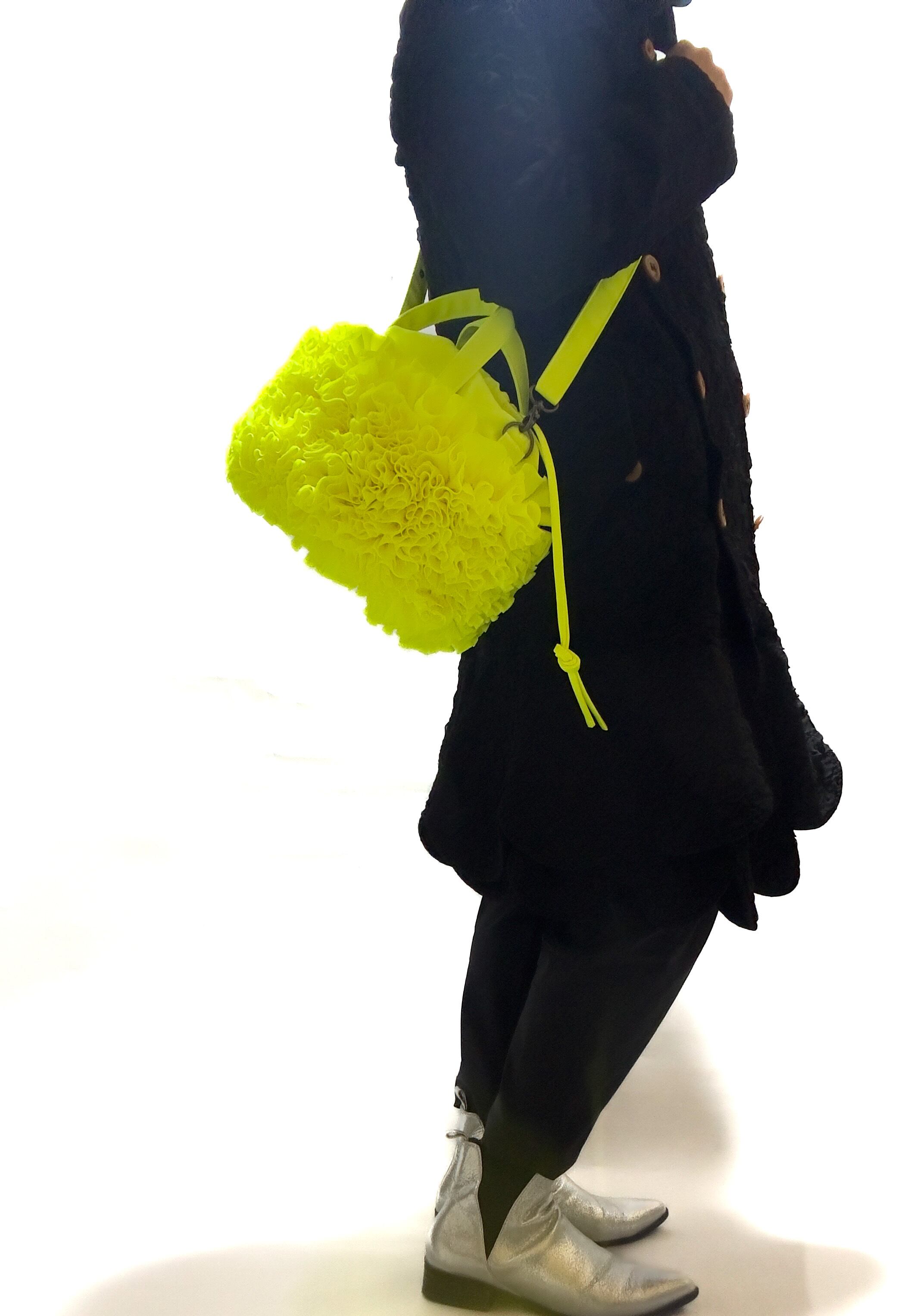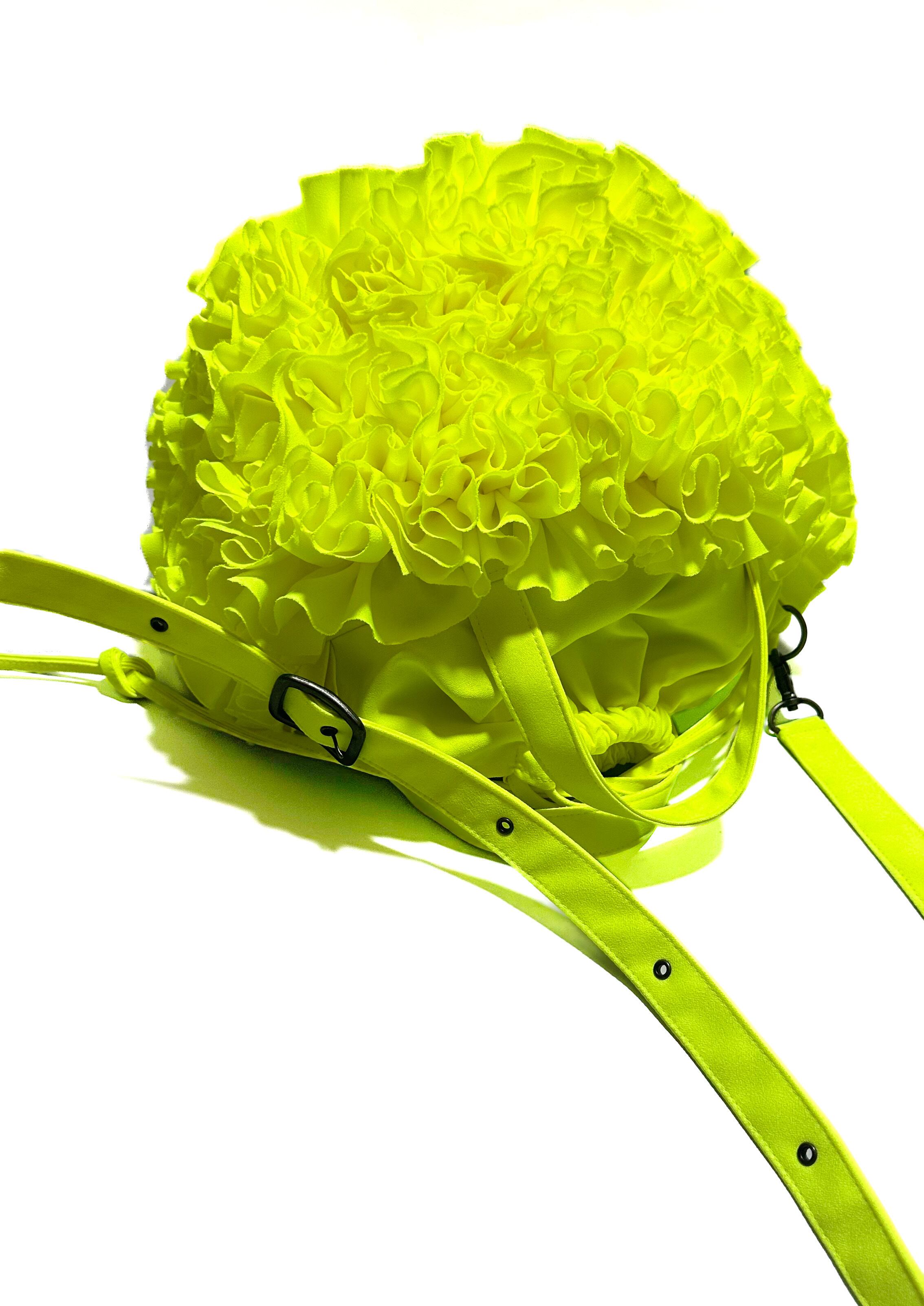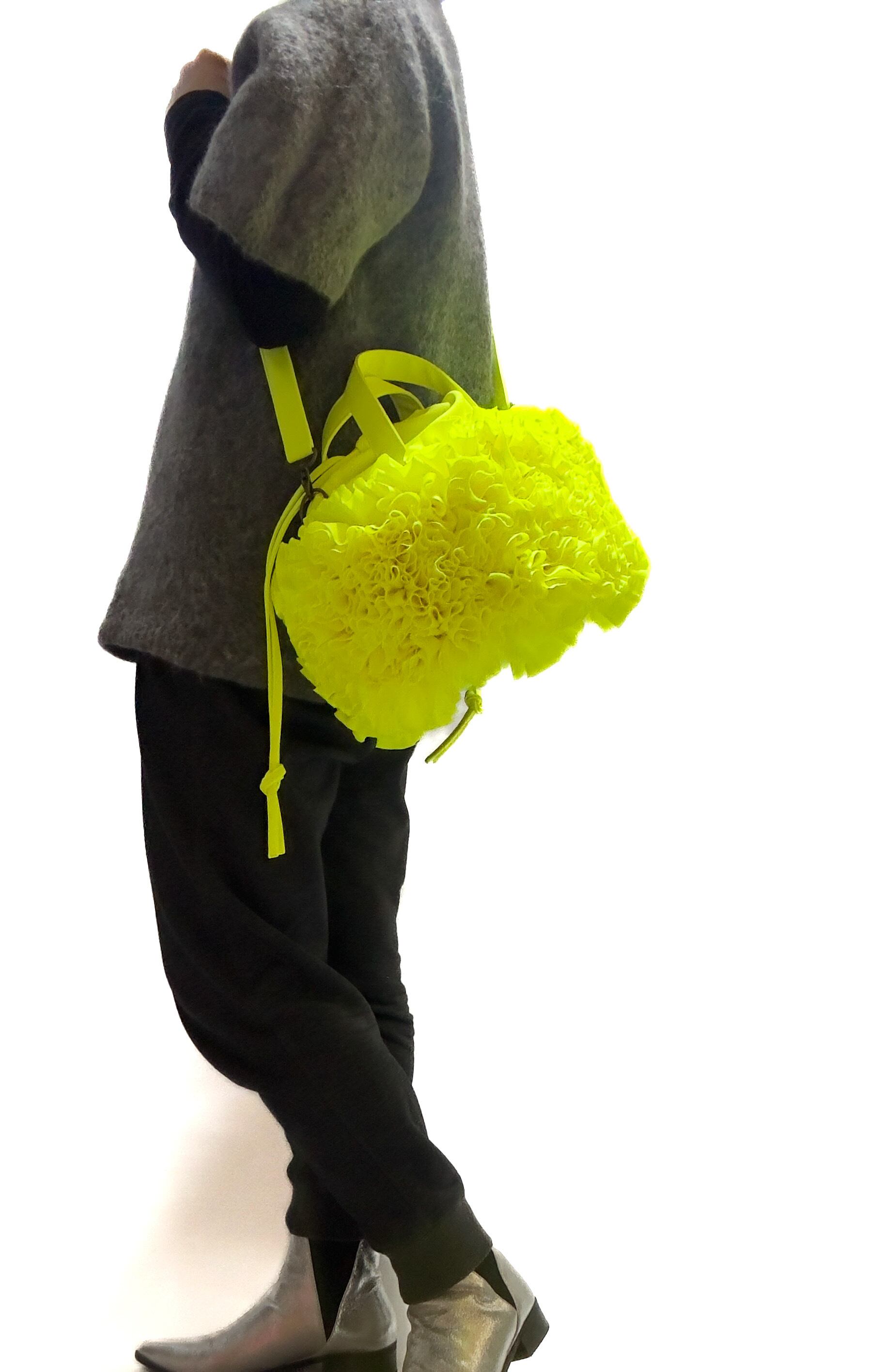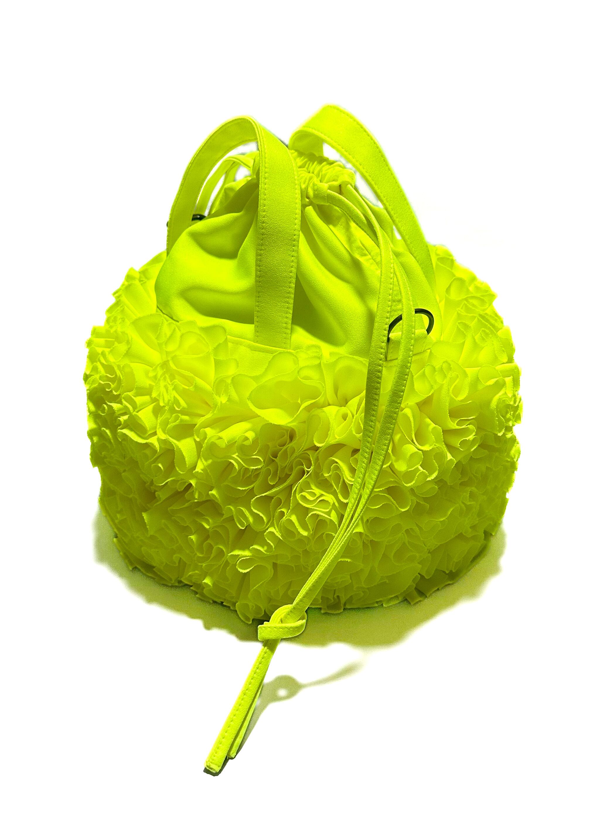 ブーケをイメージしフリルを一つ一つお花の形にしながら手作業でぐるりと縫い付けた特徴的なバケツ型の巾着バックです。