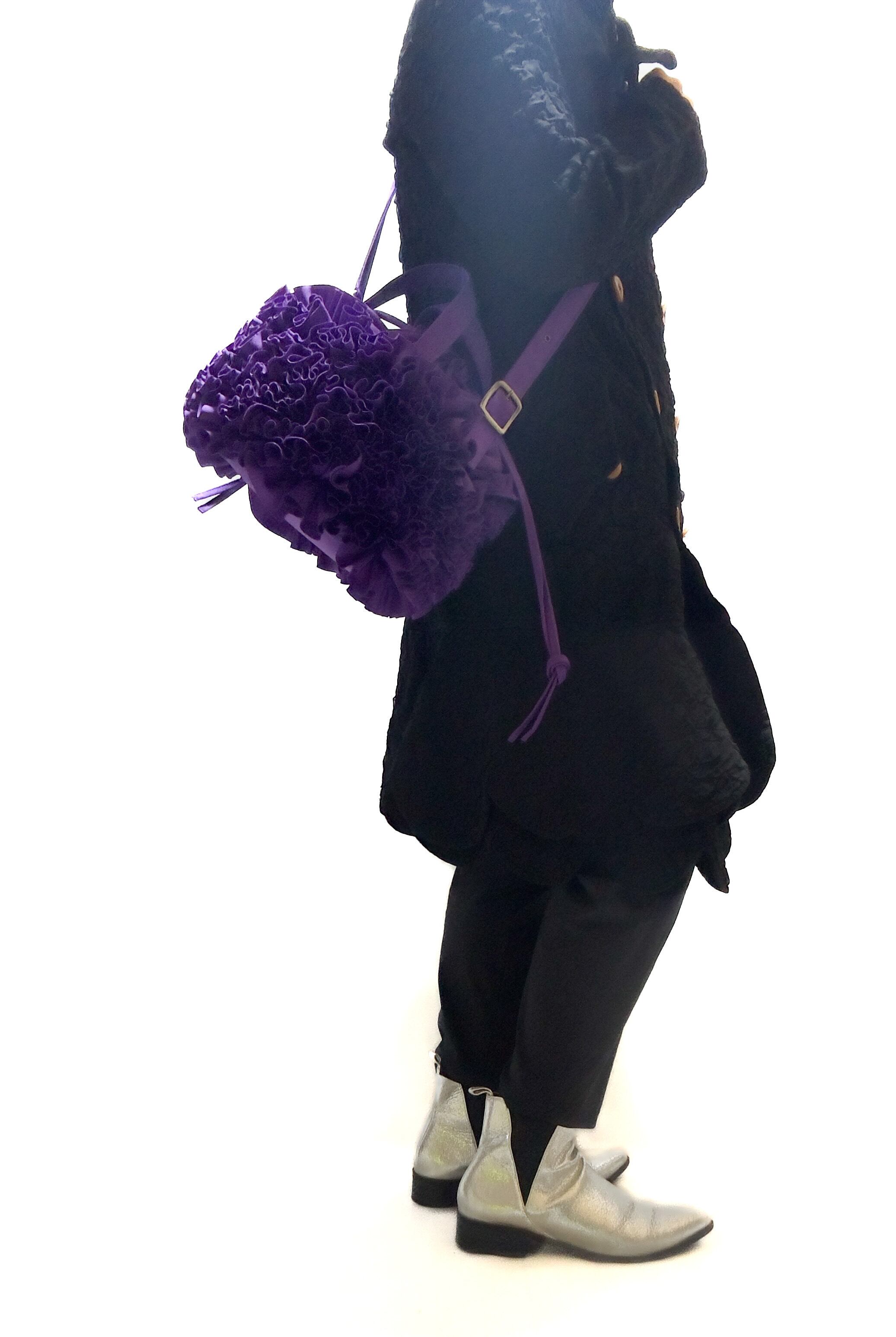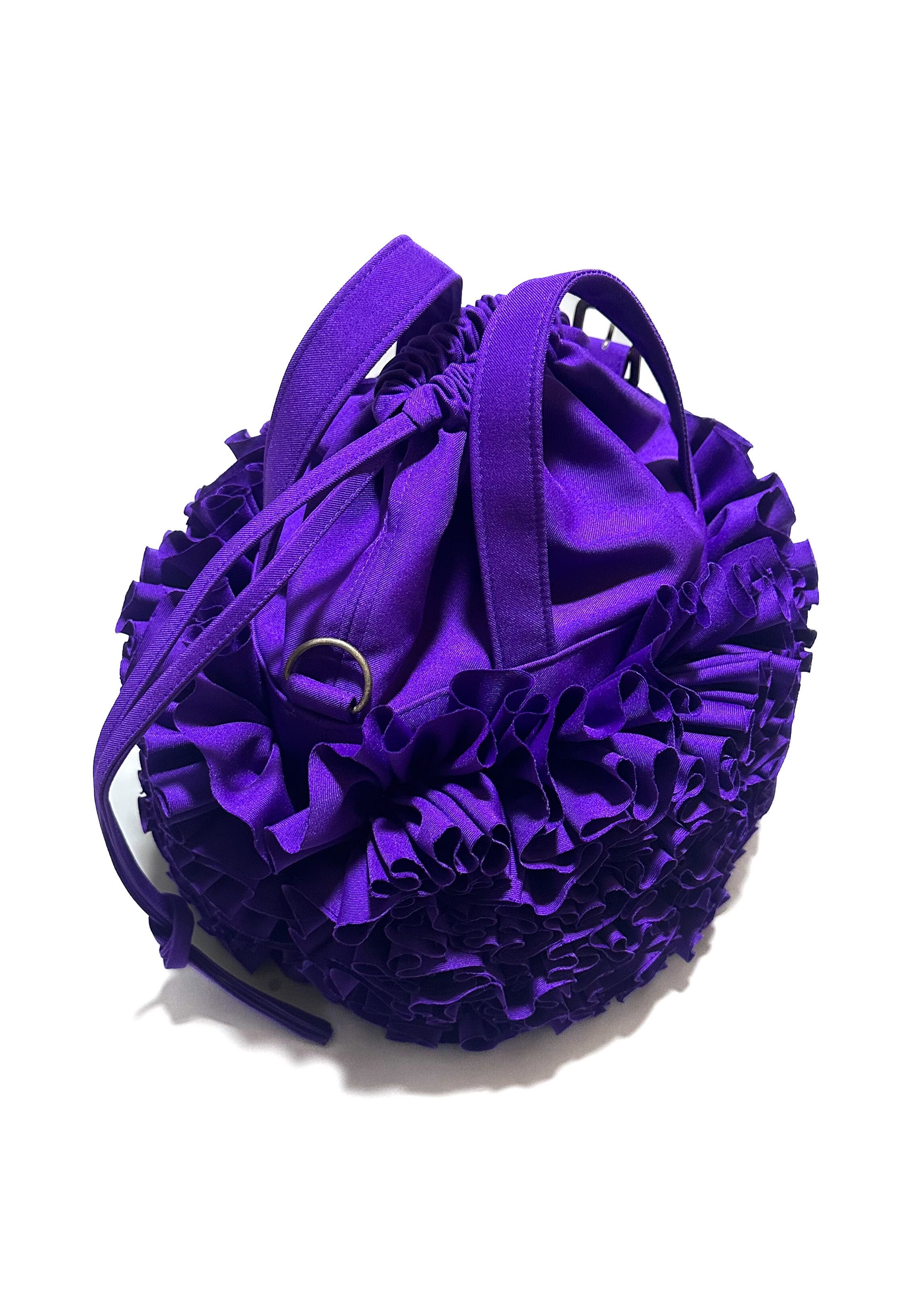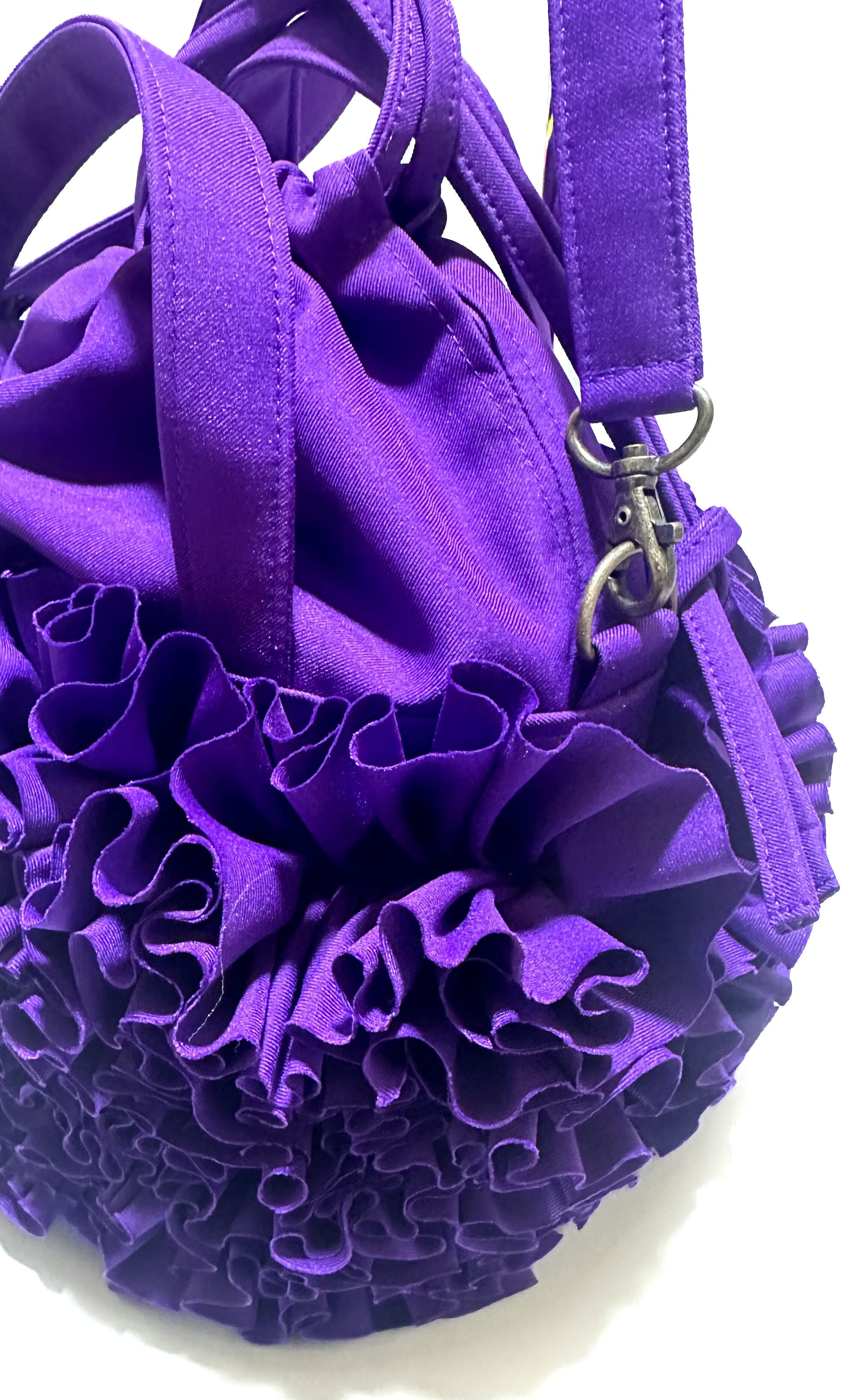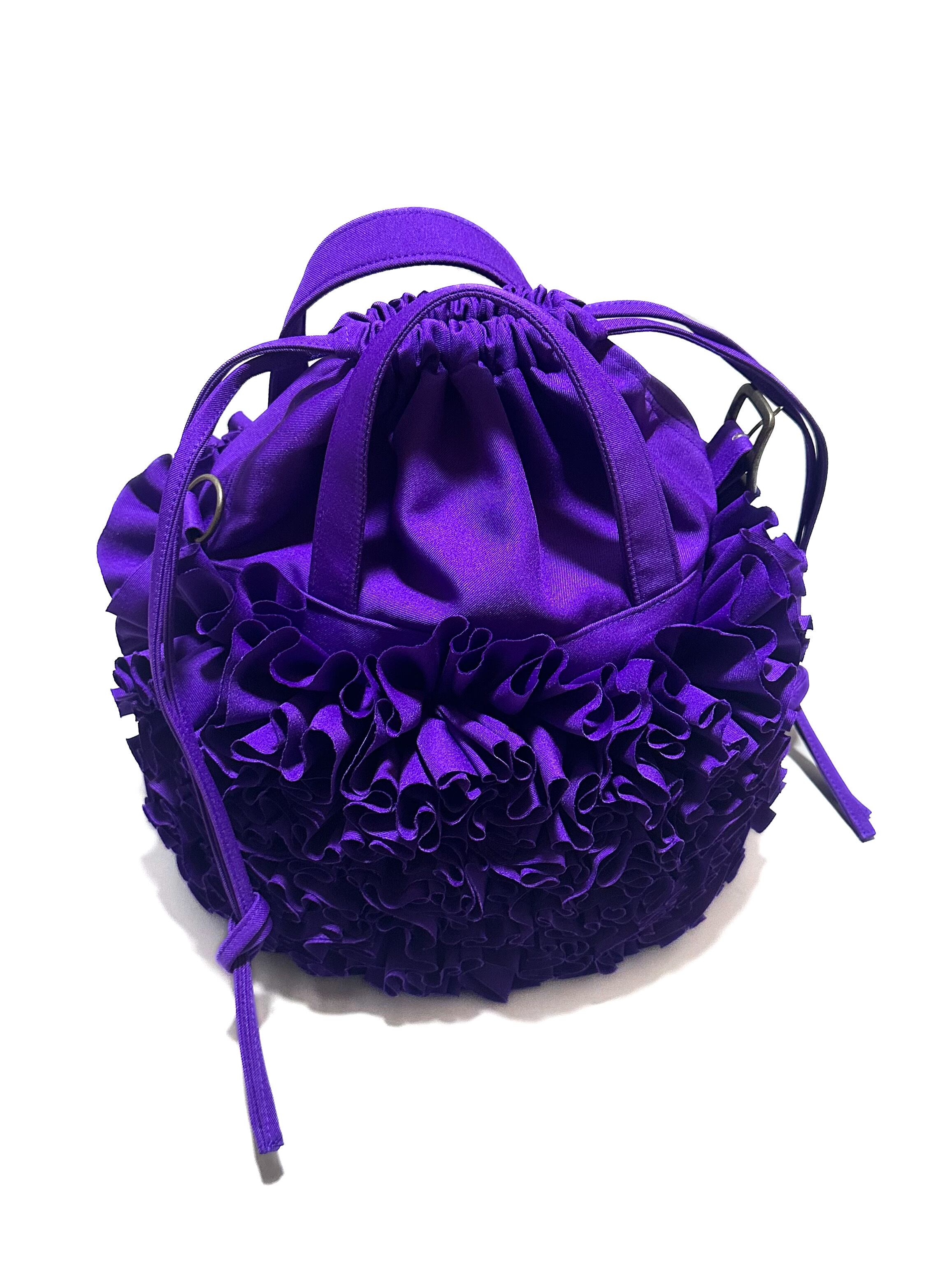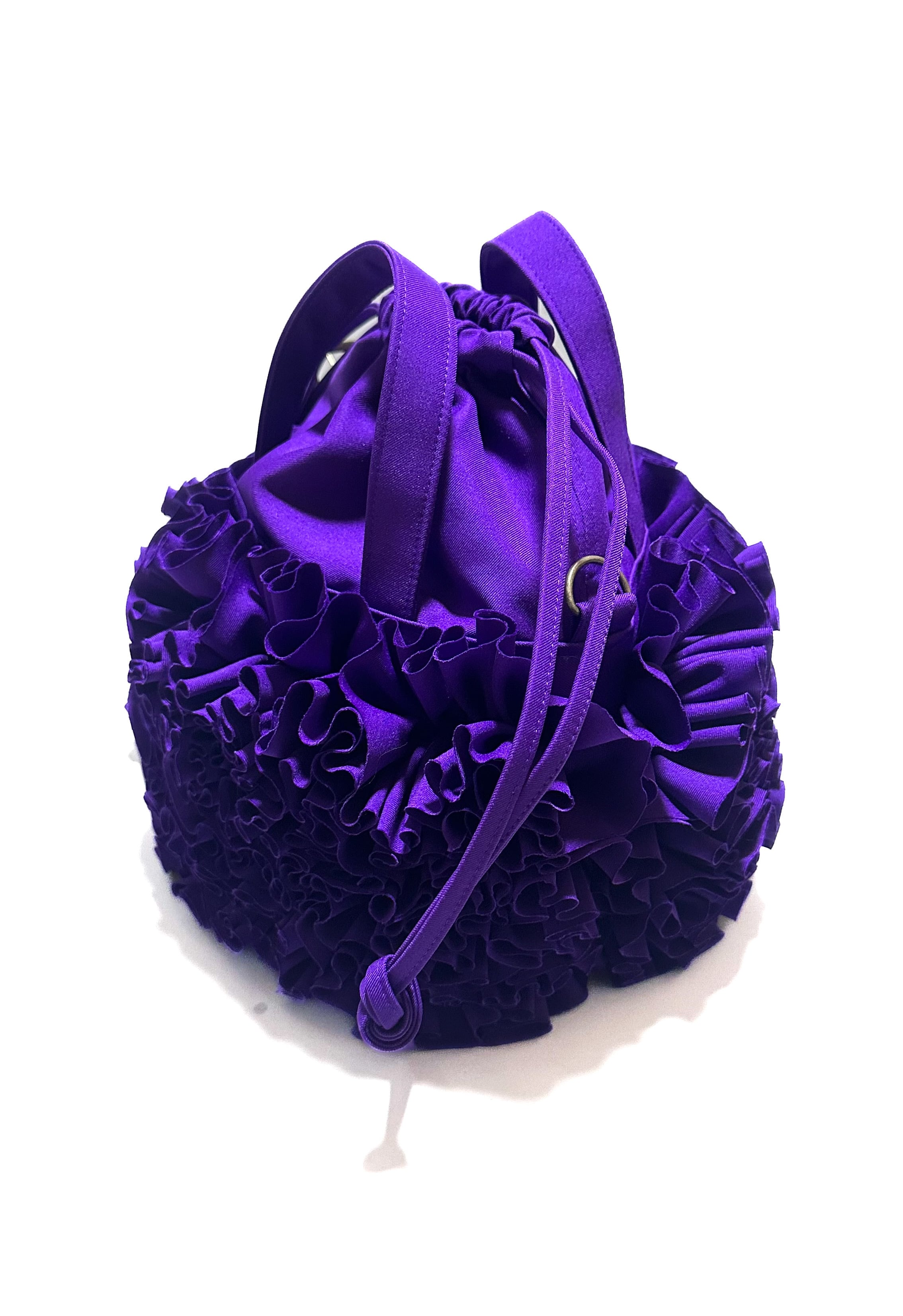 ブーケをイメージしフリルを一つ一つお花の形にしながら手作業でぐるりと縫い付けた特徴的なバケツ型の巾着バックです。