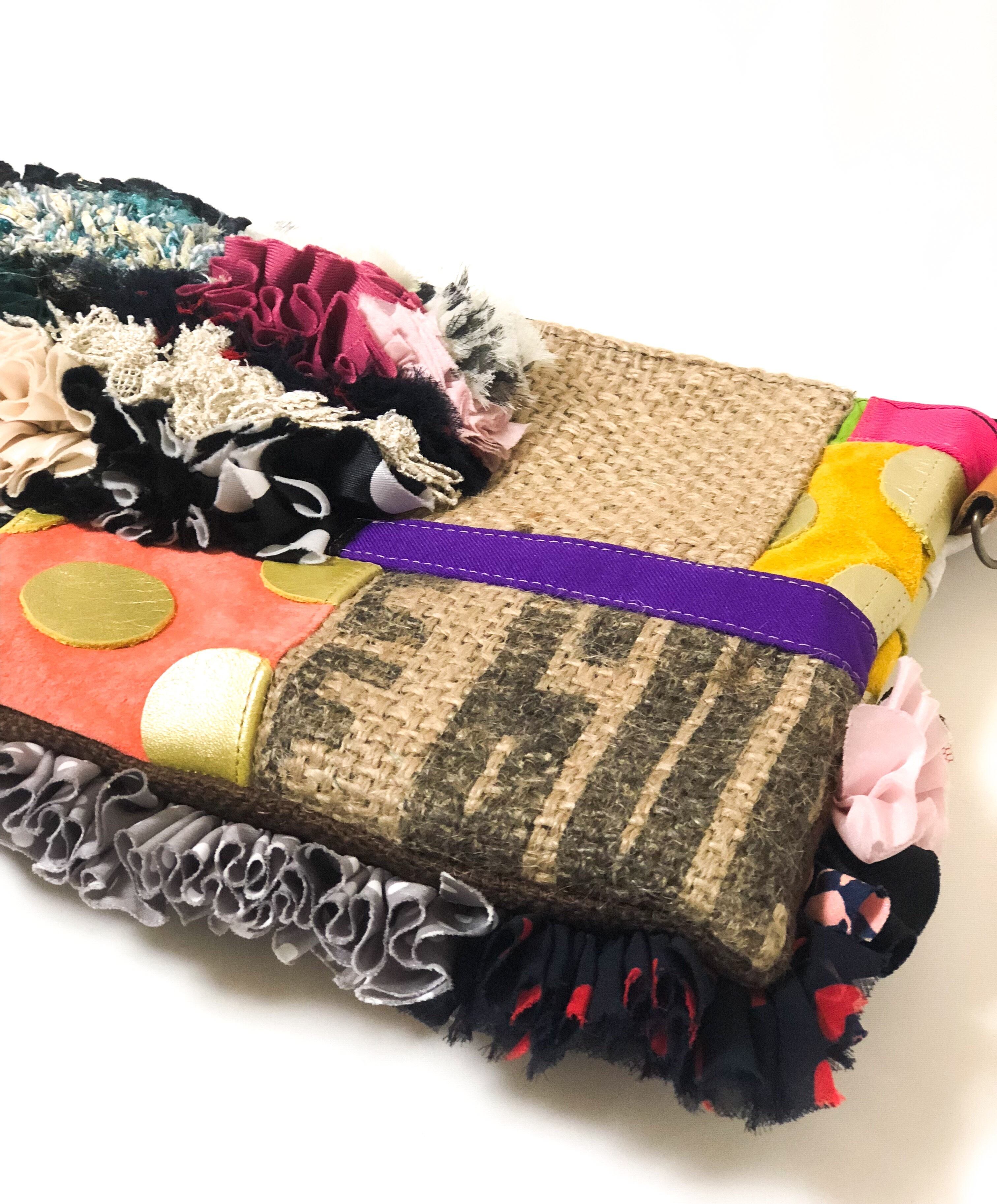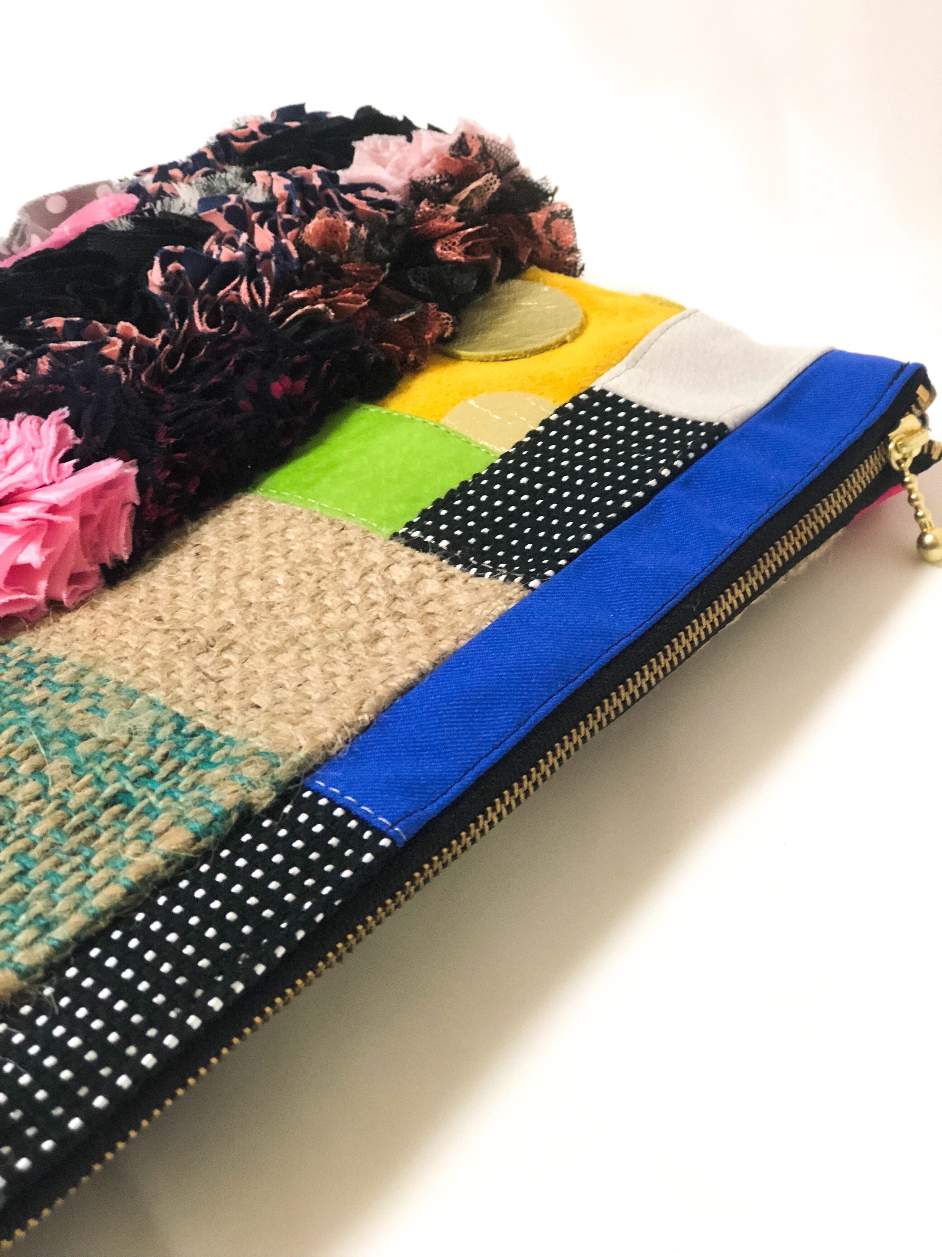 コーヒーの麻袋と様々な素材を贅沢にパッチワークにしたシンプルとは真逆のデコラティブなデザインのポーチ。取り出した時に気分が上がるアイテムです。