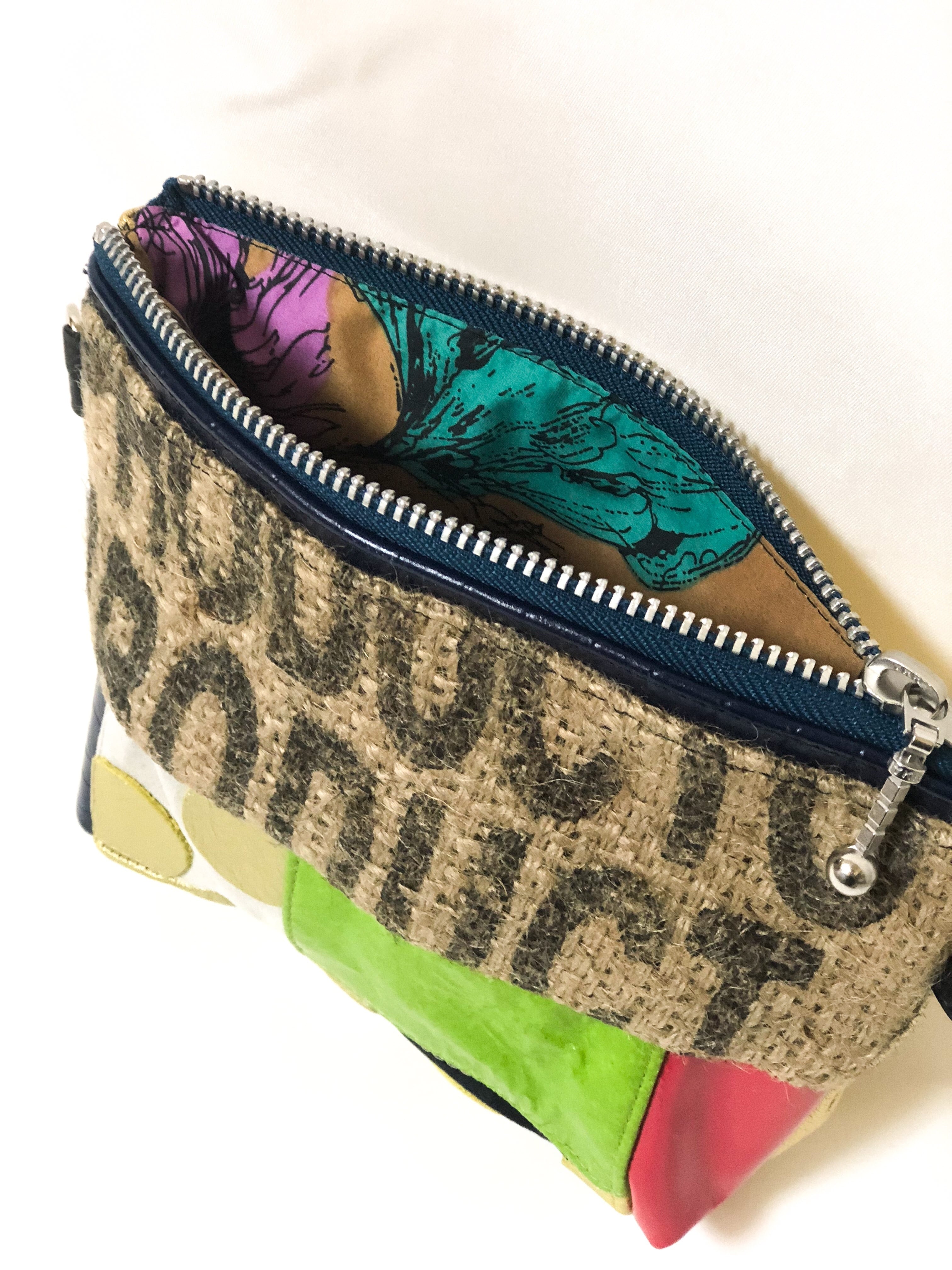 コーヒーの麻袋と様々な素材を贅沢にパッチワークにしたシンプルとは真逆のデコラティブなデザインのポーチ。取り出した時に気分が上がるアイテムです。