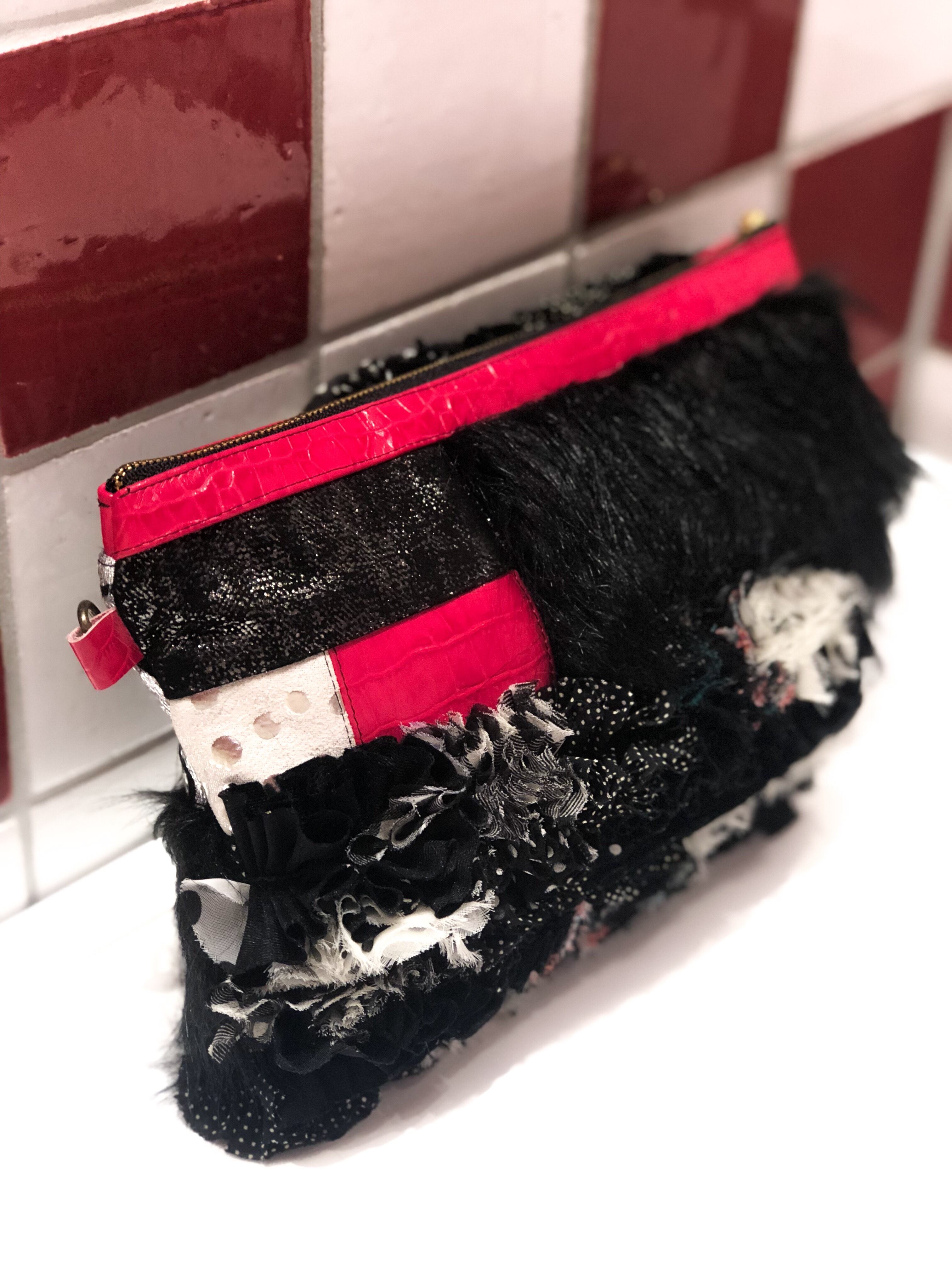 様々な素材を贅沢にパッチワークにしたシンプルとは真逆のデコラティブなデザインのポーチ。取り出した時に気分が上がるアイテムです。