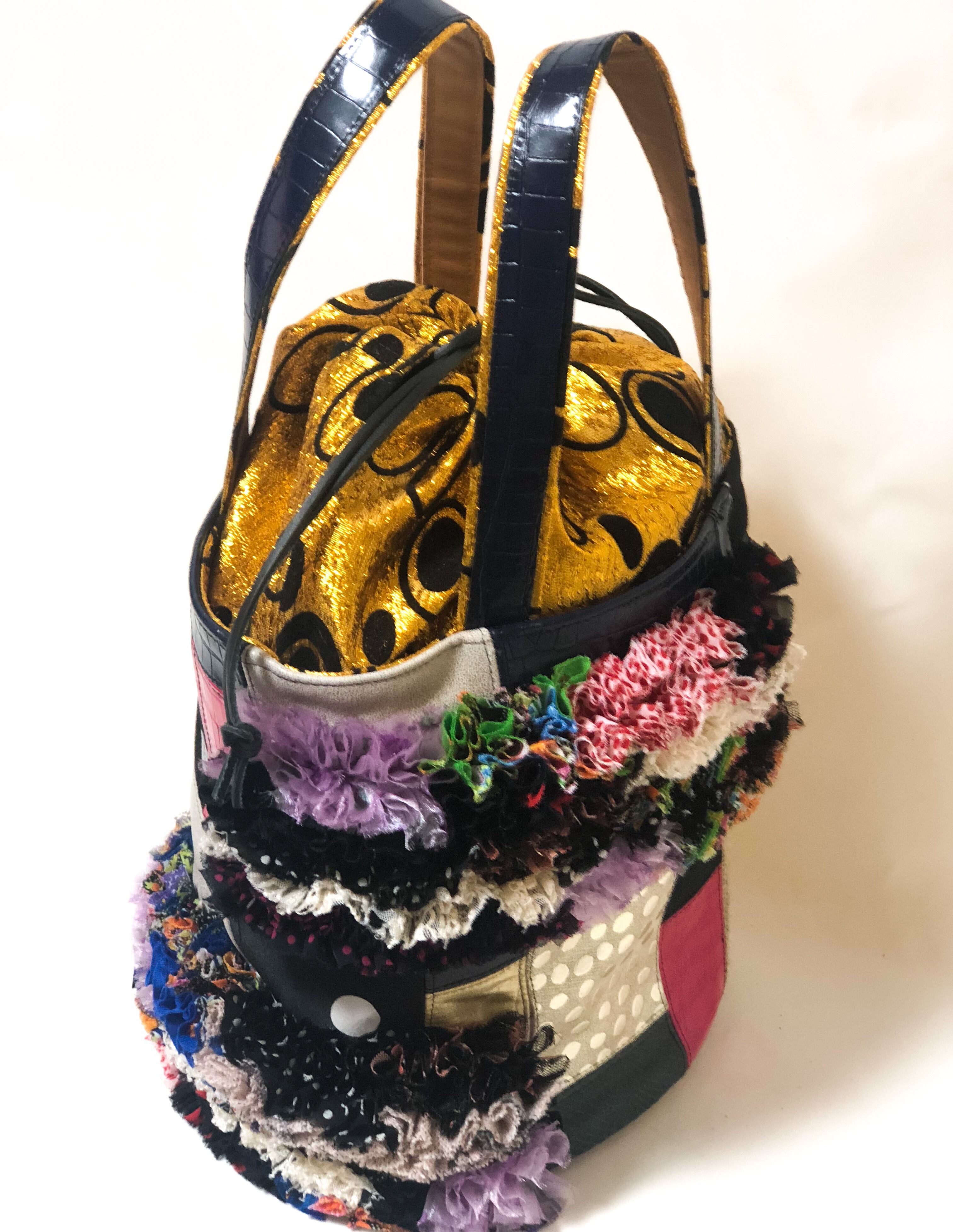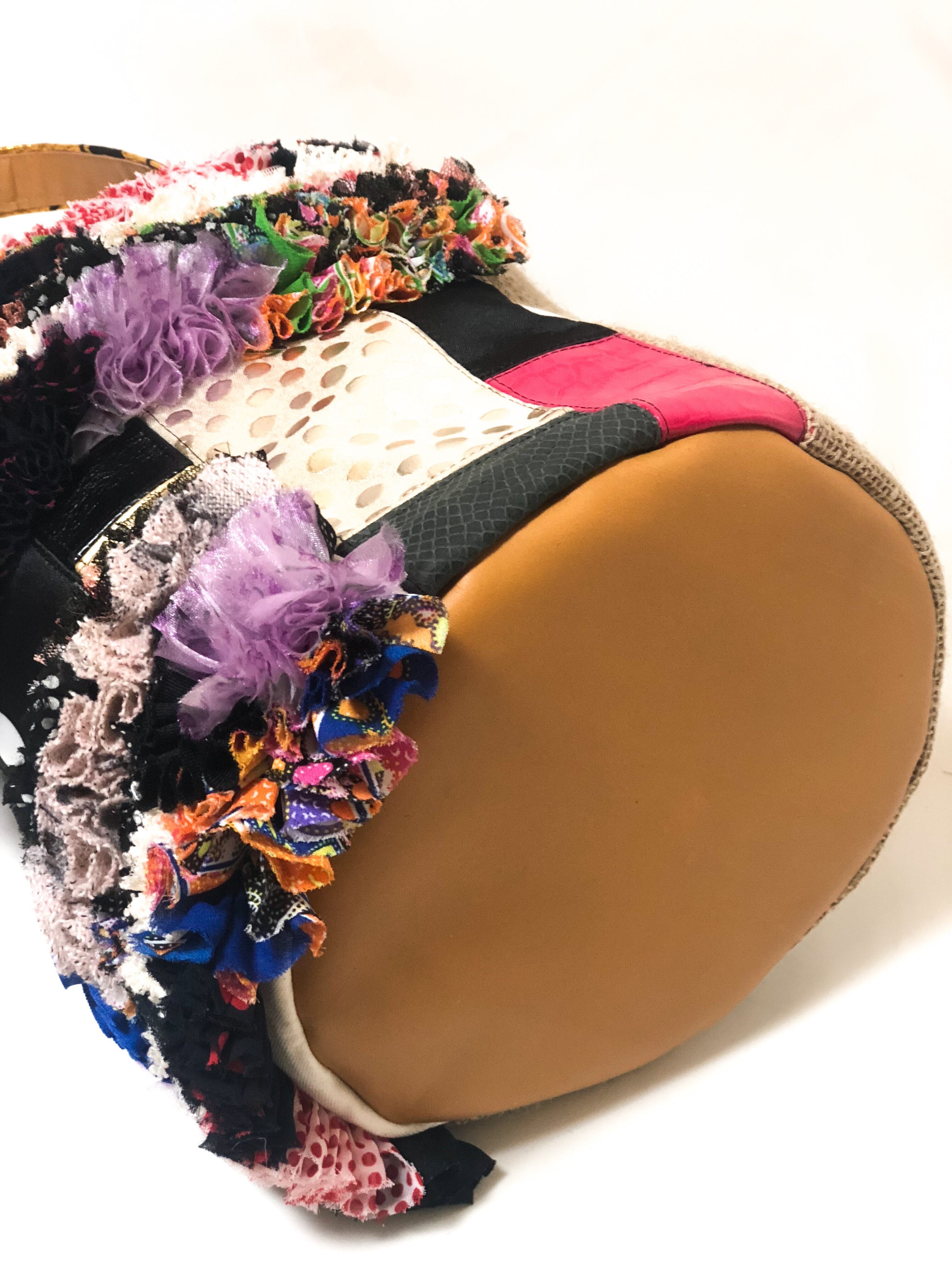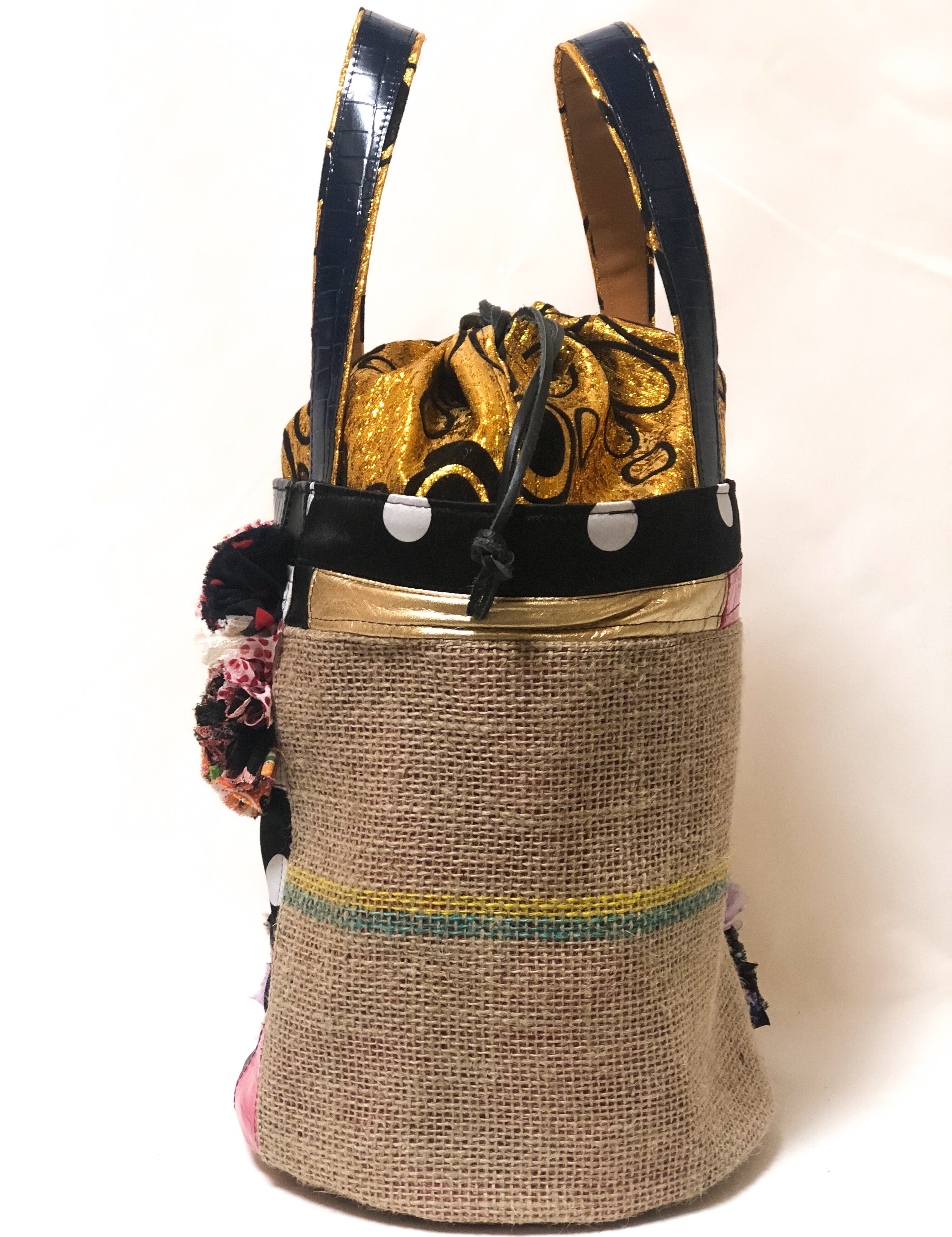 レザーやフリルなど様々な素材をパッチワークしコーヒーの麻袋とミックスしたバケツ型のバッグです。シンプルとは真逆のデコラティブなデザインに仕上げました。