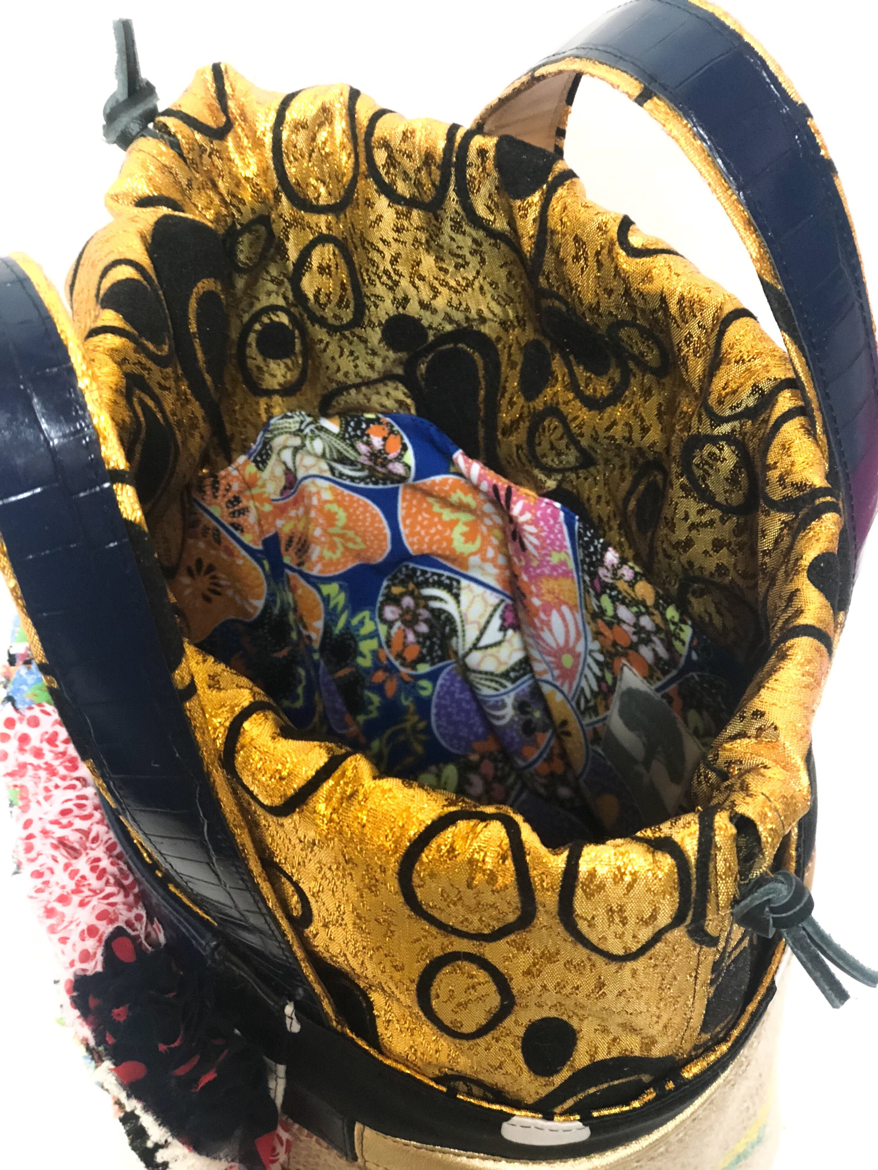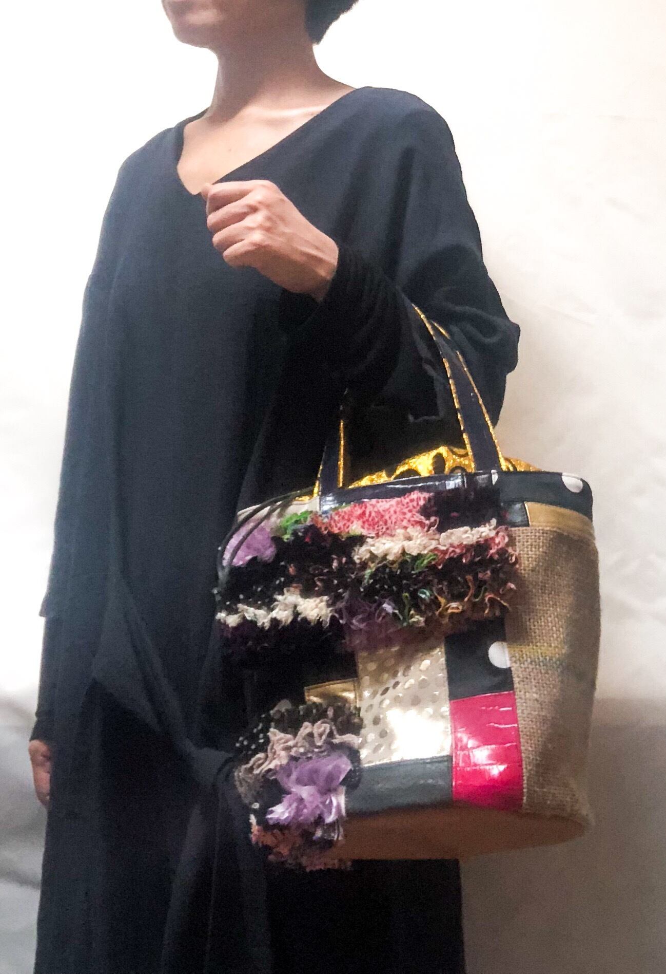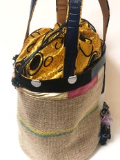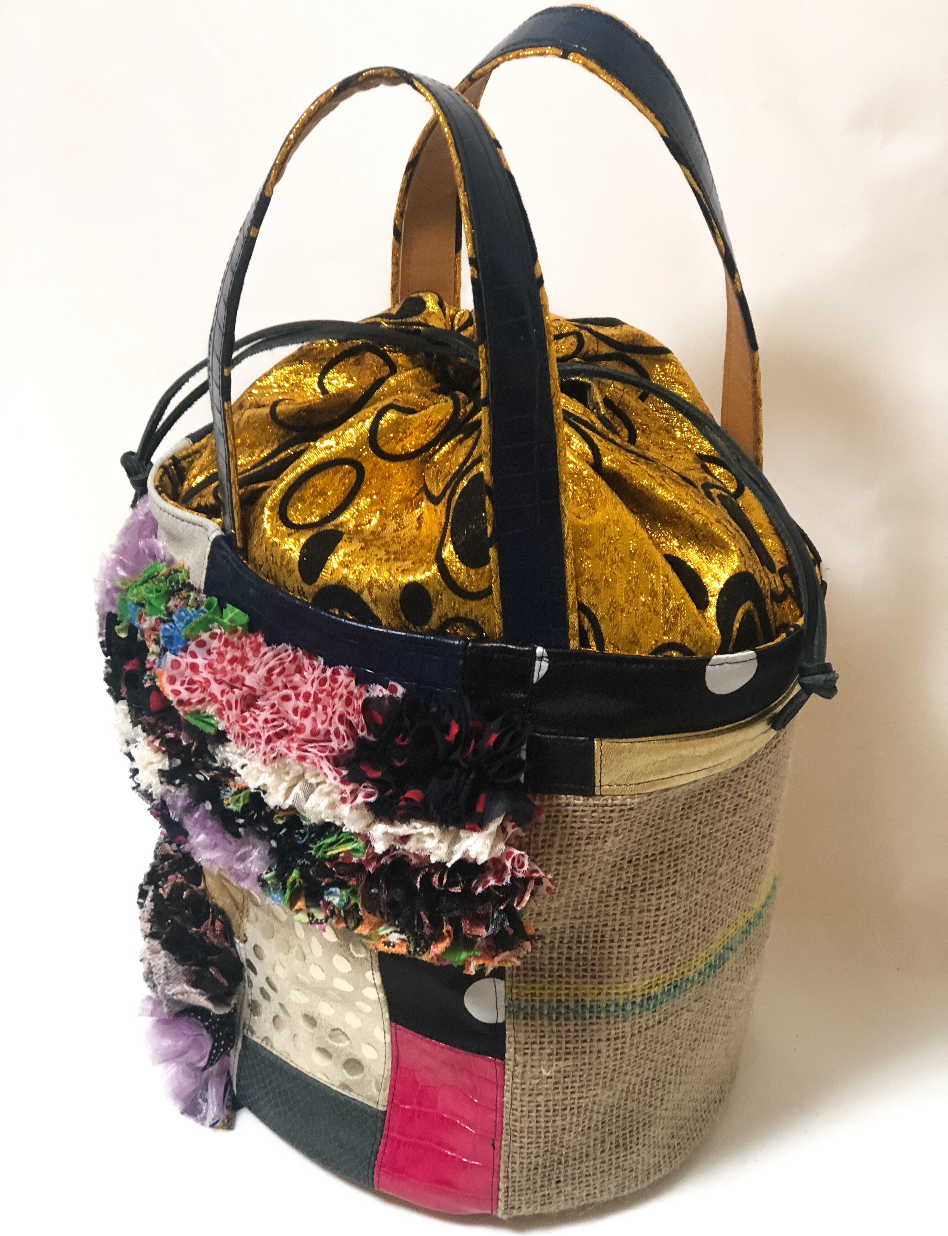 レザーやフリルなど様々な素材をパッチワークしコーヒーの麻袋とミックスしたバケツ型のバッグです。シンプルとは真逆のデコラティブなデザインに仕上げました。