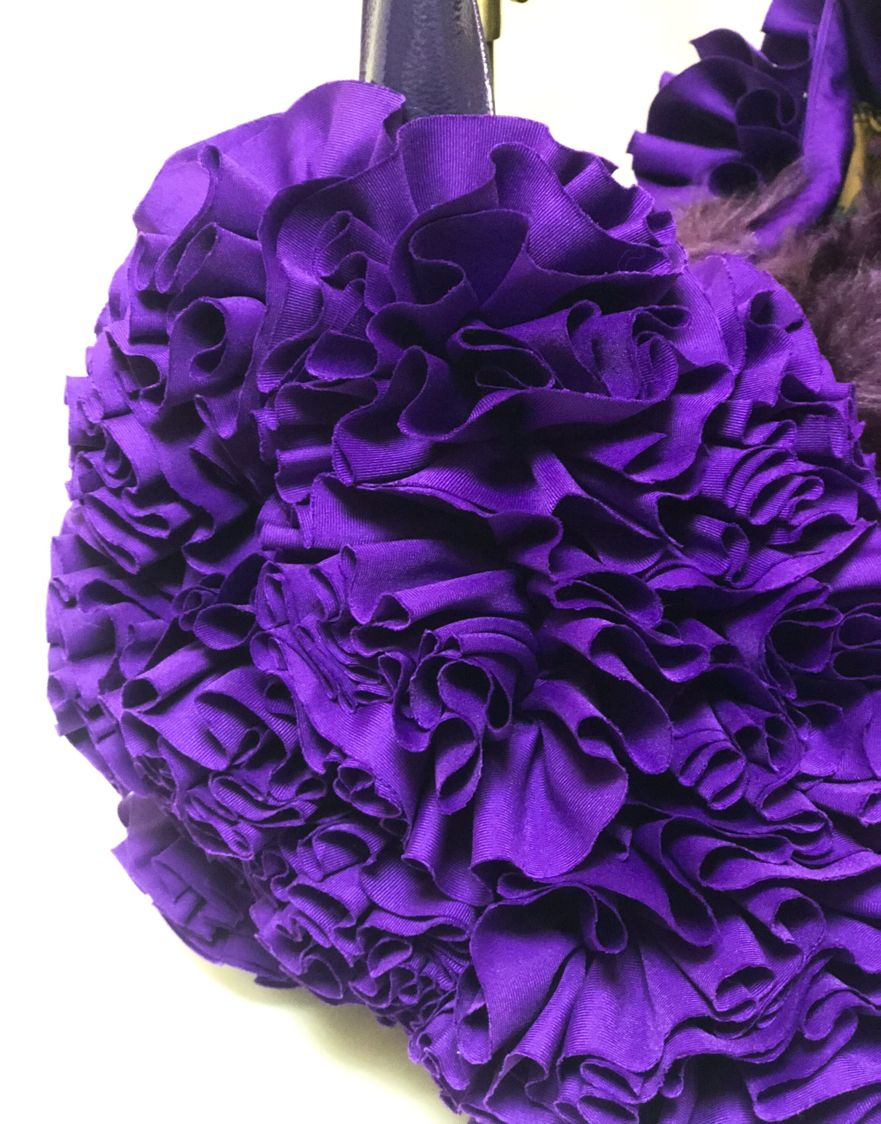 約5mの布地を使っているので少し重さはありますが、肩がけも可能で持っていただくと両脇から見えるボリューミーなお花が可愛いデザインです。