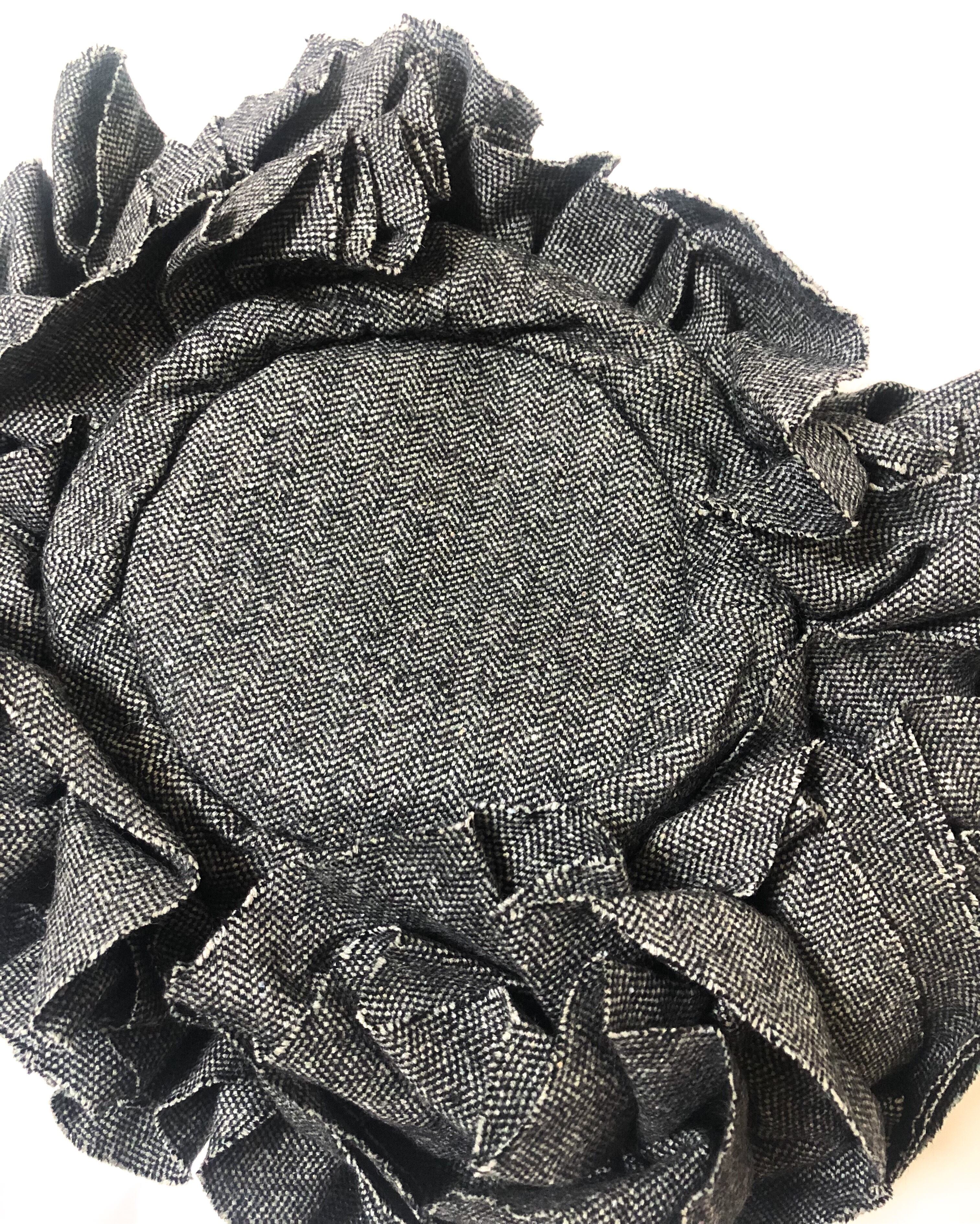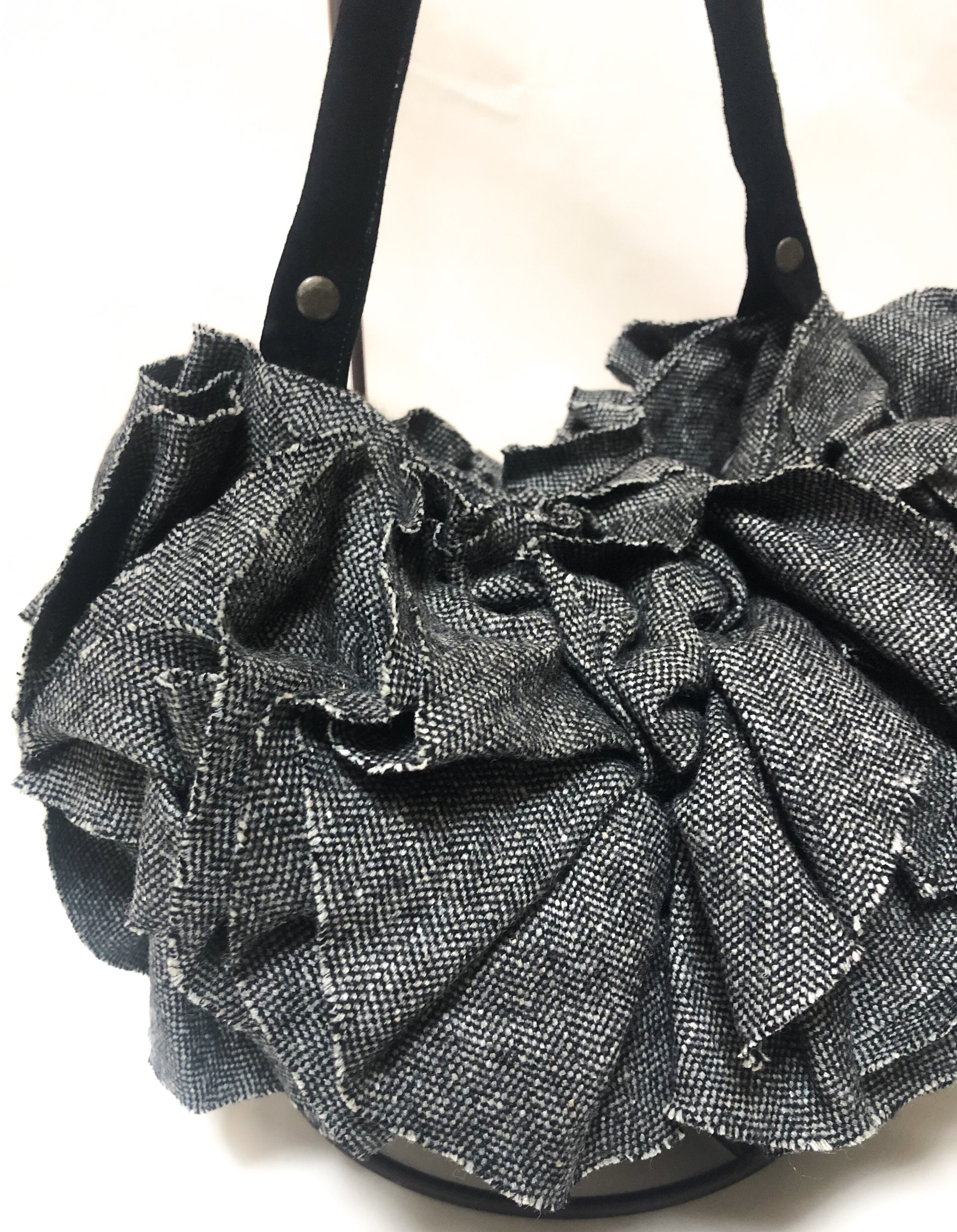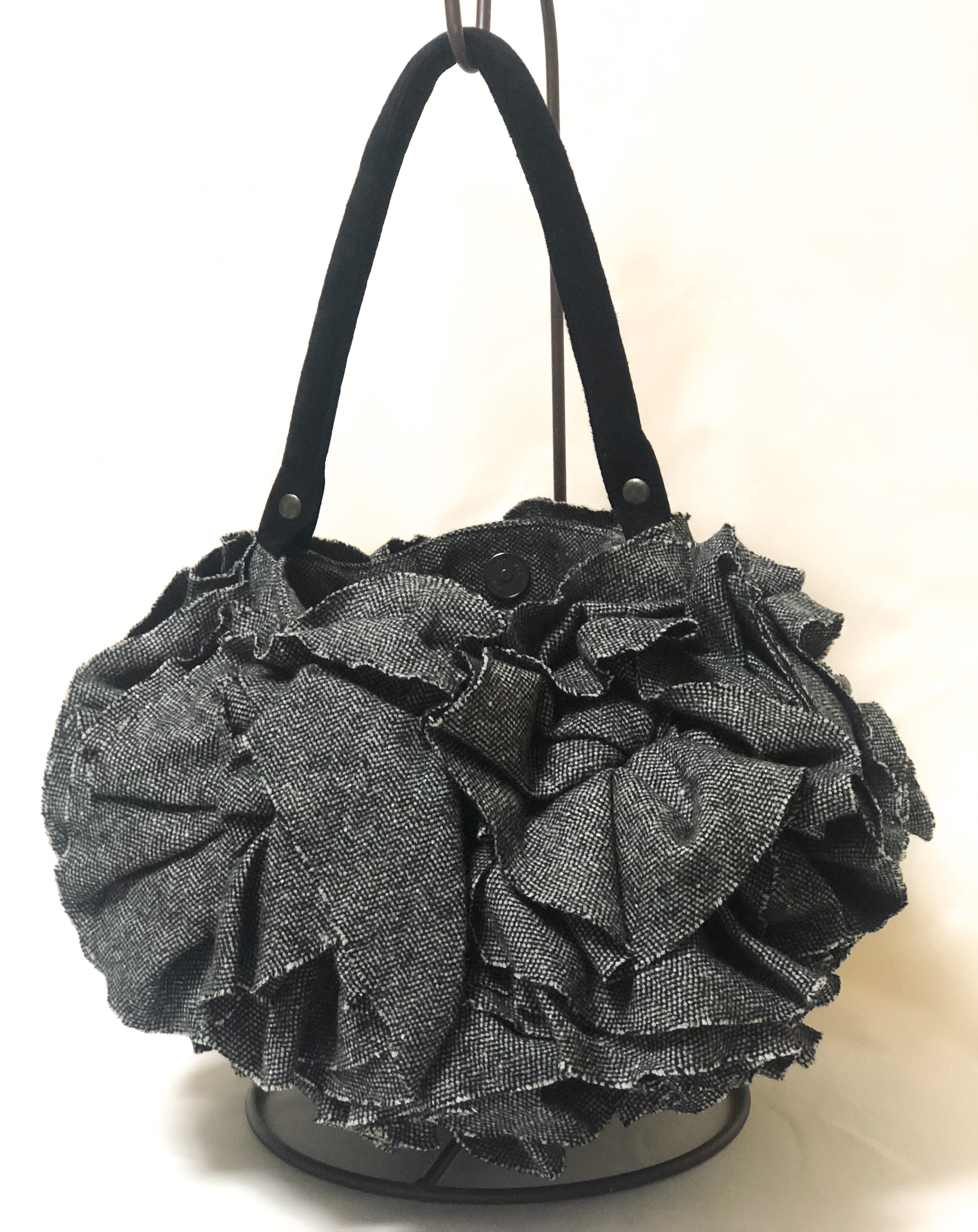 大きなウールツイードのお花がアクセントの丸型バッグです。