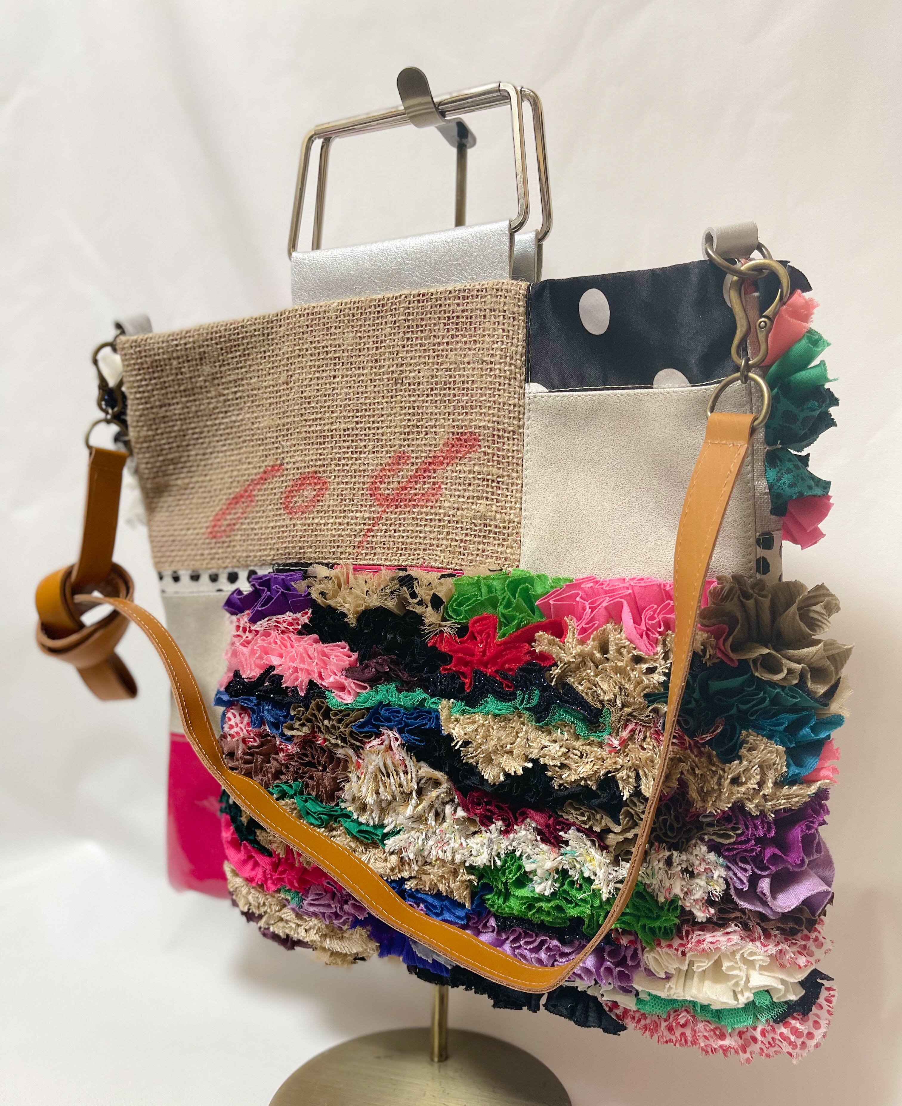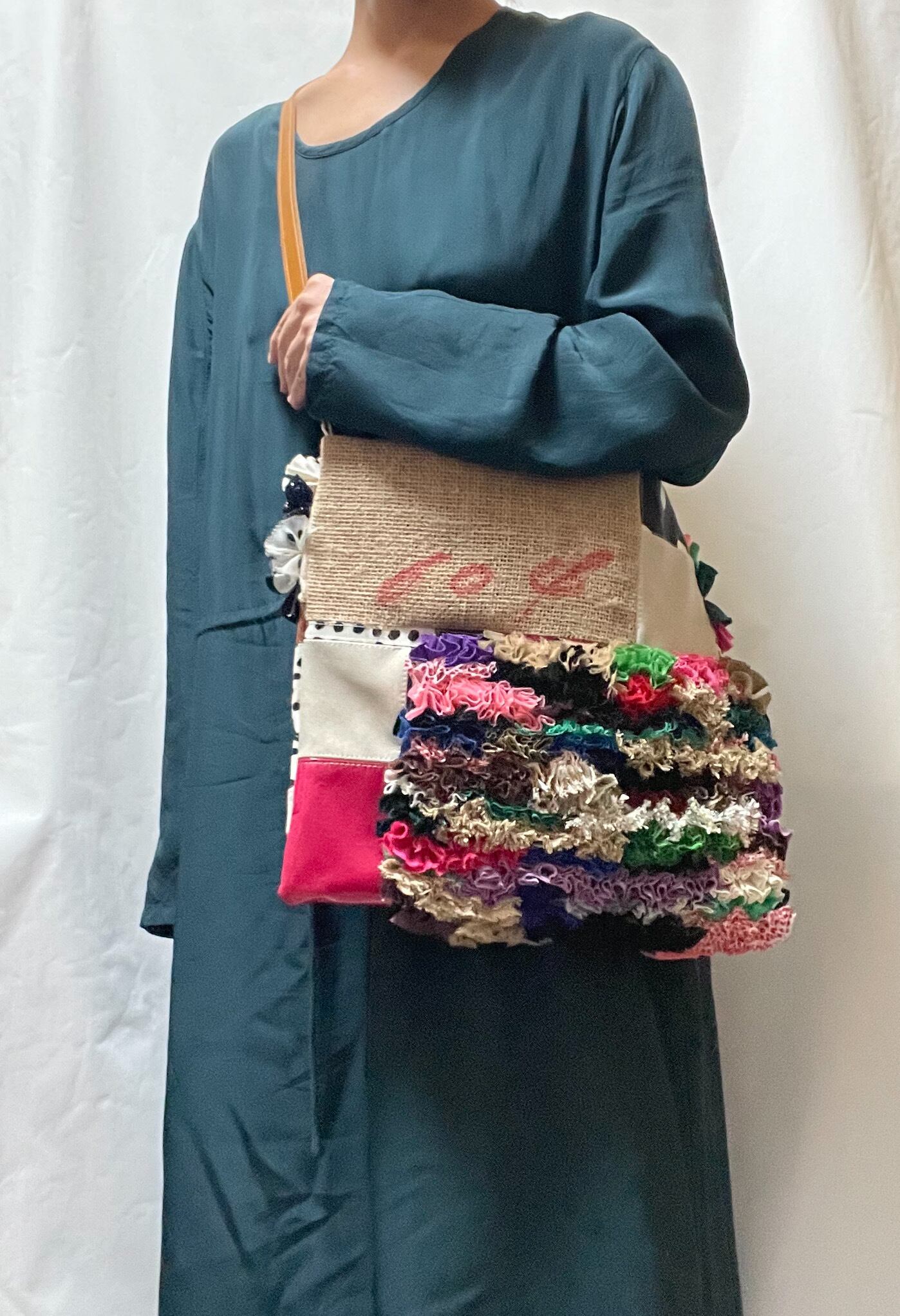 様々な布地をフリフリに施し、コーヒーの麻袋と端材のレザー等を組合せパッチワークにした仕様で、シンプルとは真逆のデコラティブでカラフルなデザインに仕上げました。