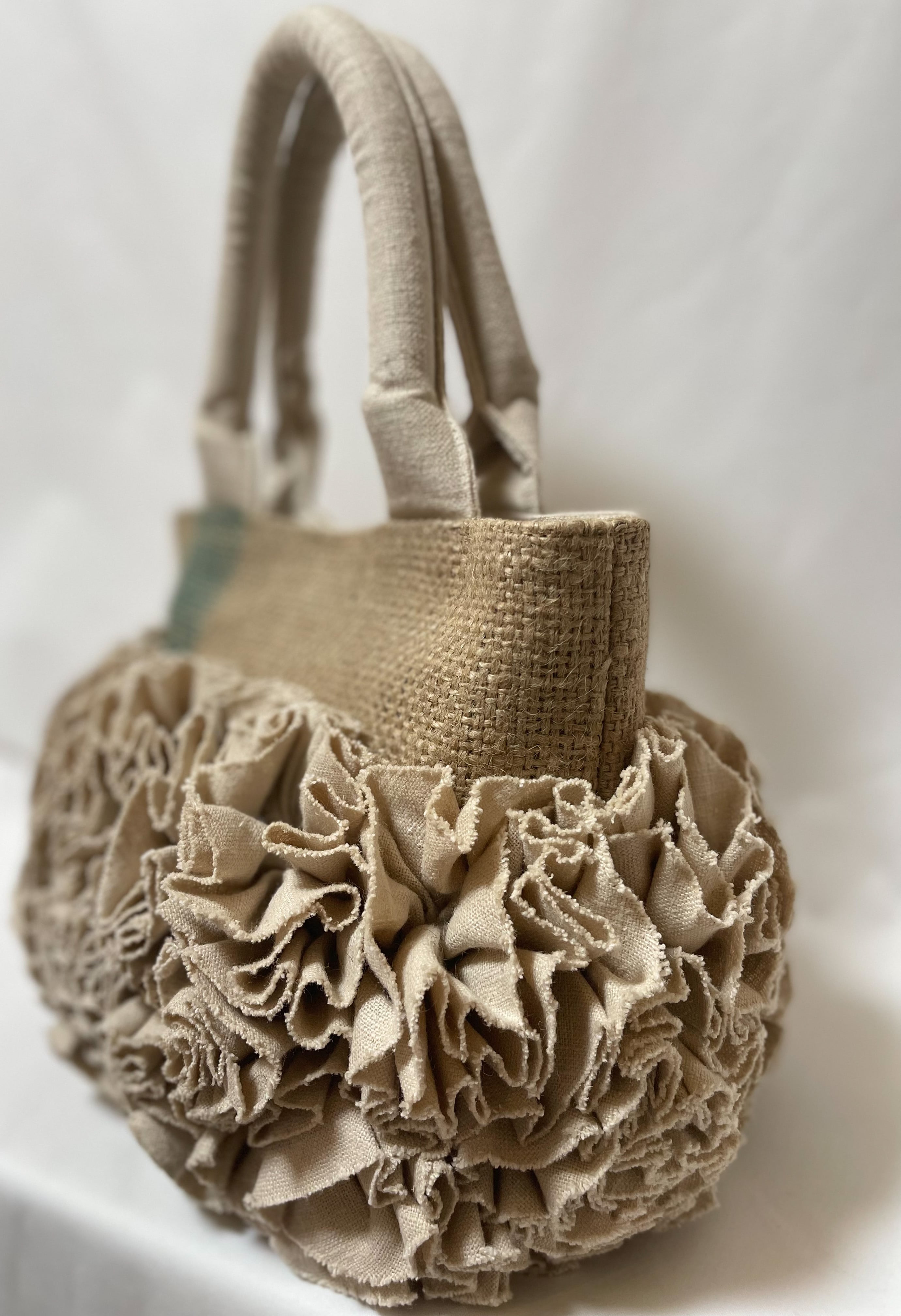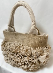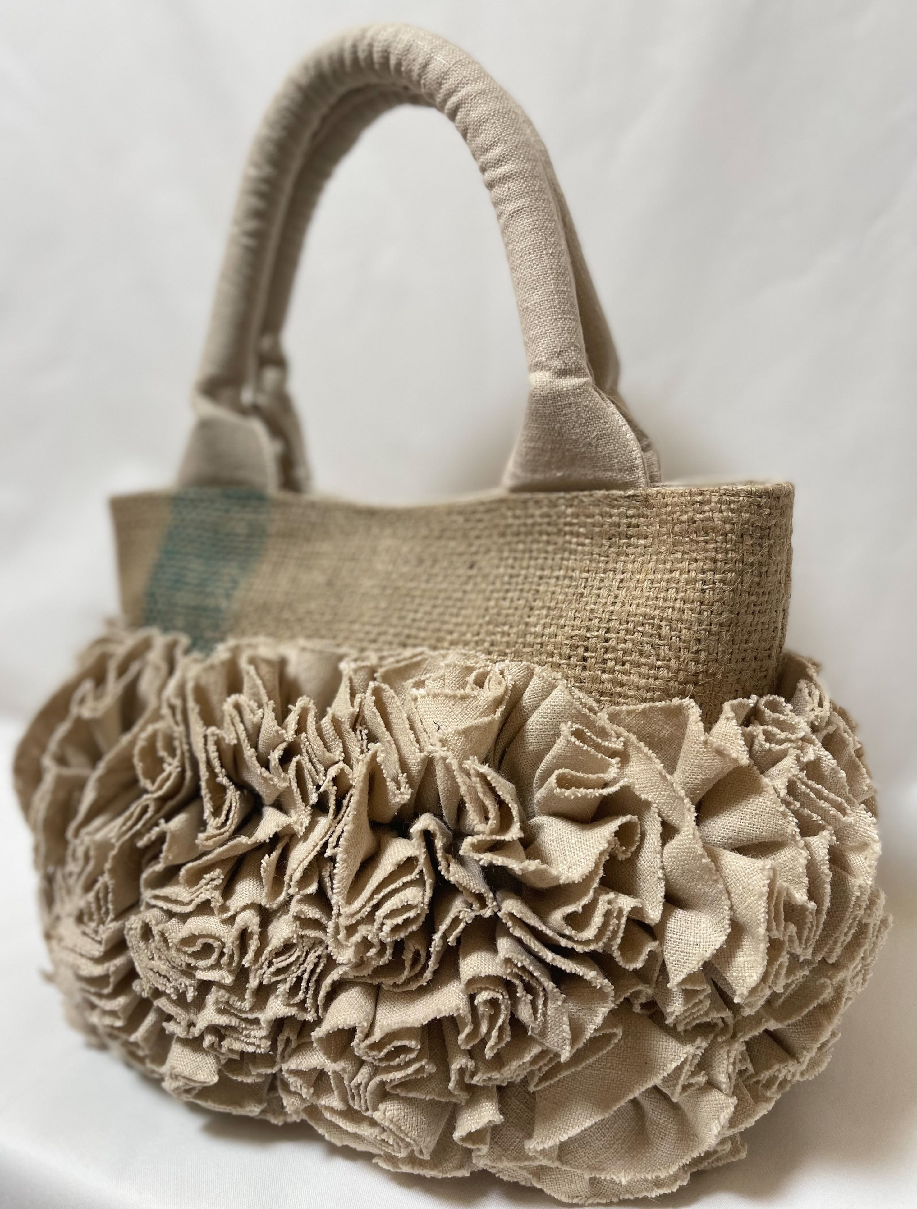 コーヒーの麻袋をリメイクしたボリューミーな麻のお花がポイントのバッグです。