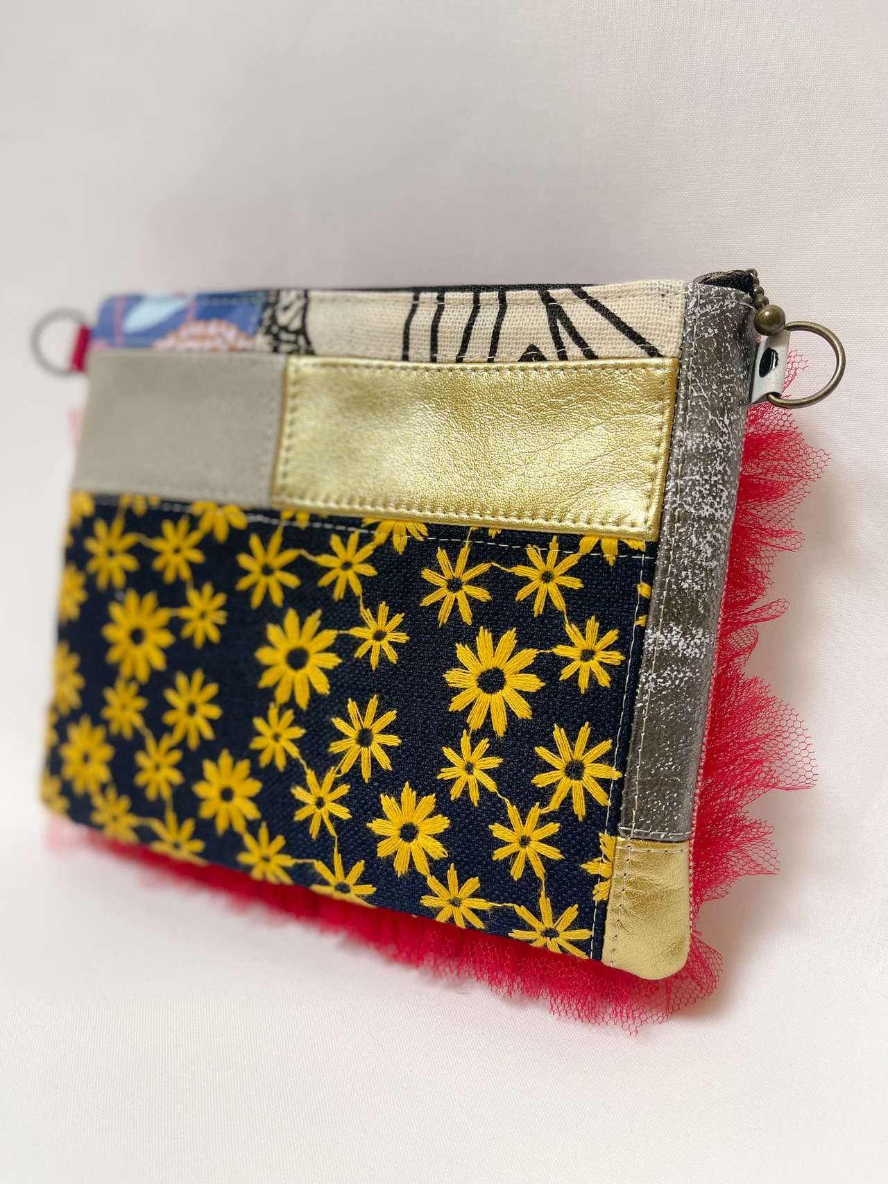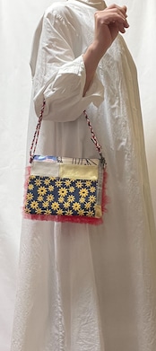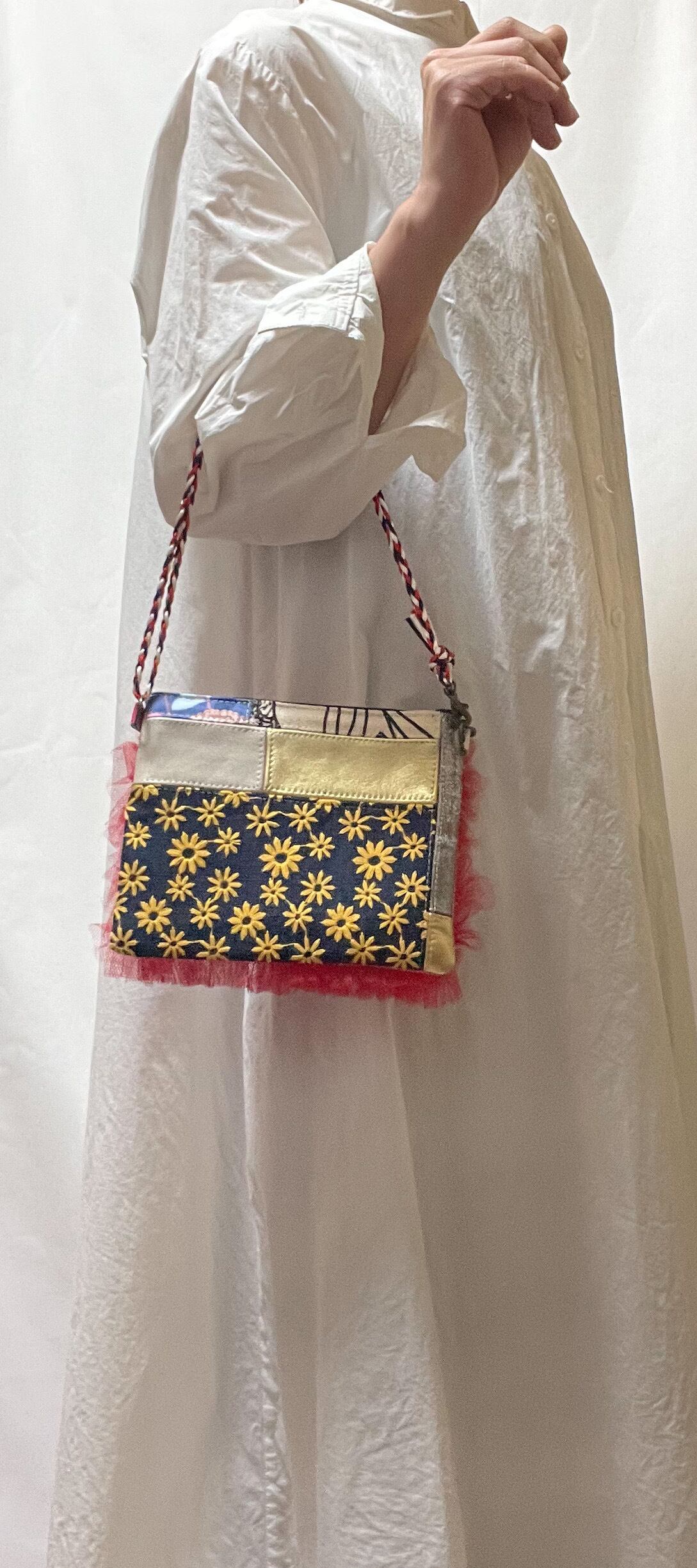 表面は硬めのチュールをフリフリにし裏面にはコーヒーの麻袋や様々な素材、端材のレザー等を贅沢にパッチワークにした、シンプルとは真逆のデコラティブなデザインのポーチ。取り出した時に気分が上がるアイテムです。