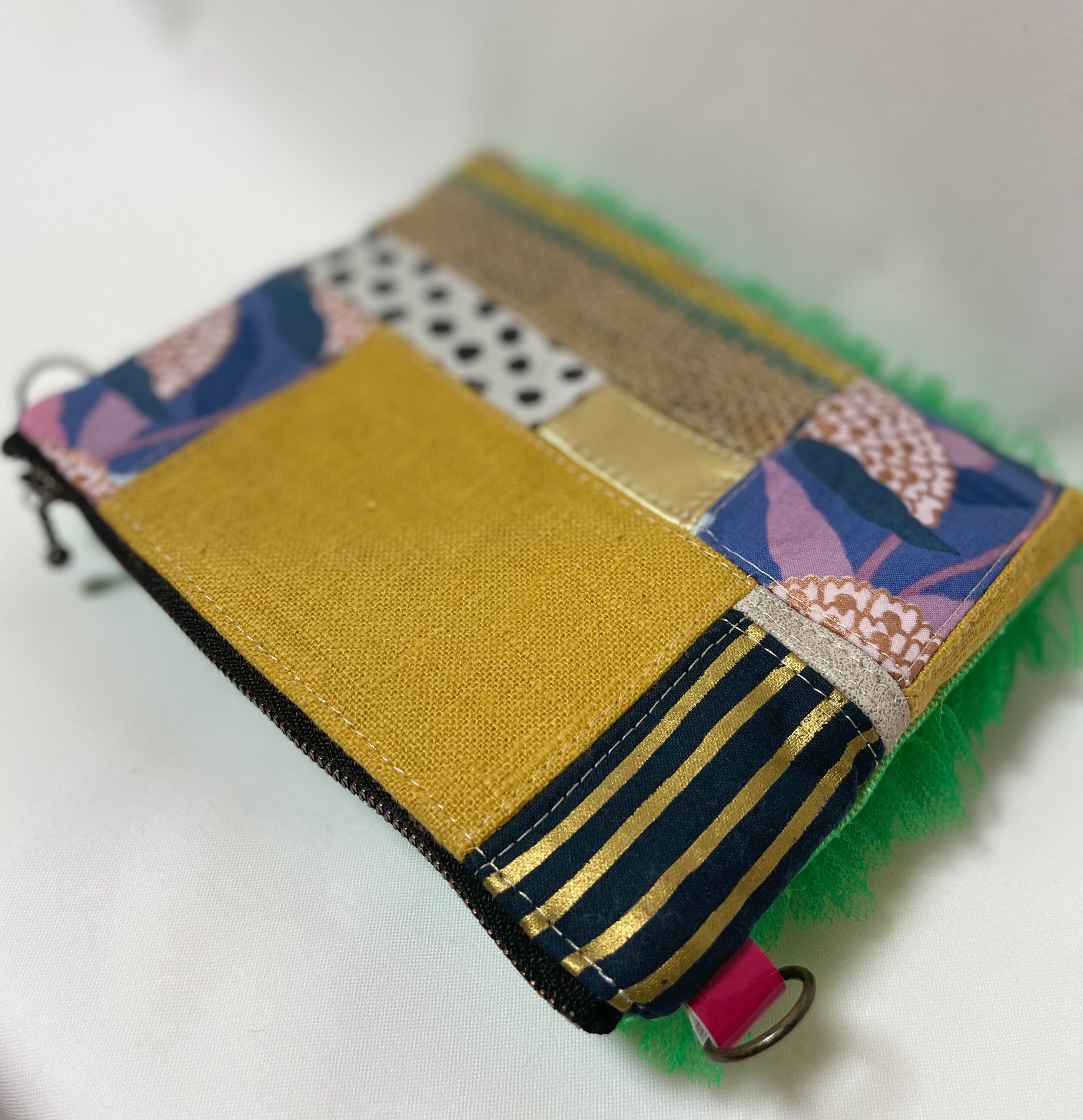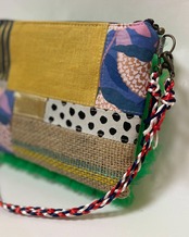 表面は硬めのチュールをフリフリにし裏面にはコーヒーの麻袋や様々な素材、端材のレザー等を贅沢にパッチワークにした、シンプルとは真逆のデコラティブなデザインのポーチ。取り出した時に気分が上がるアイテムです。