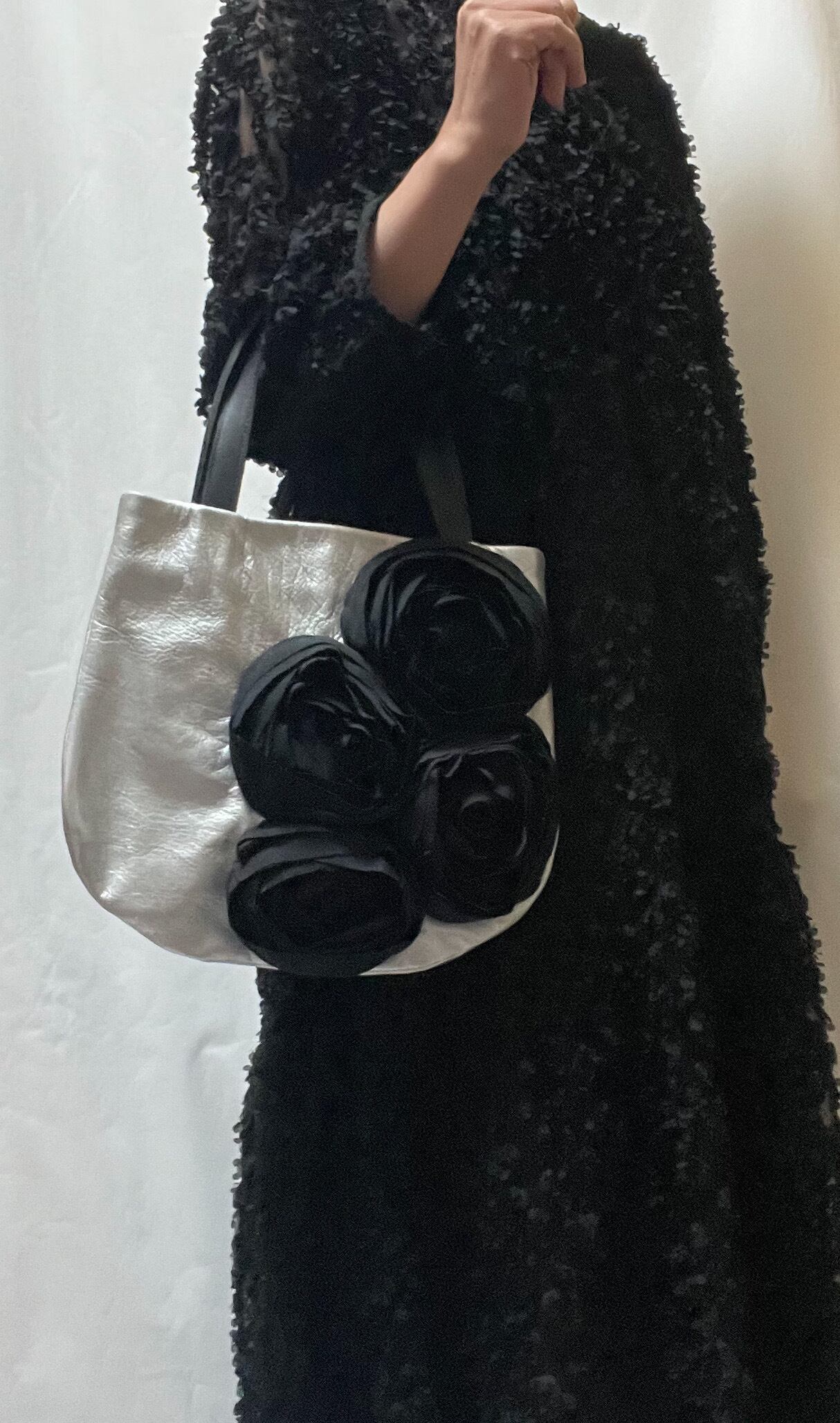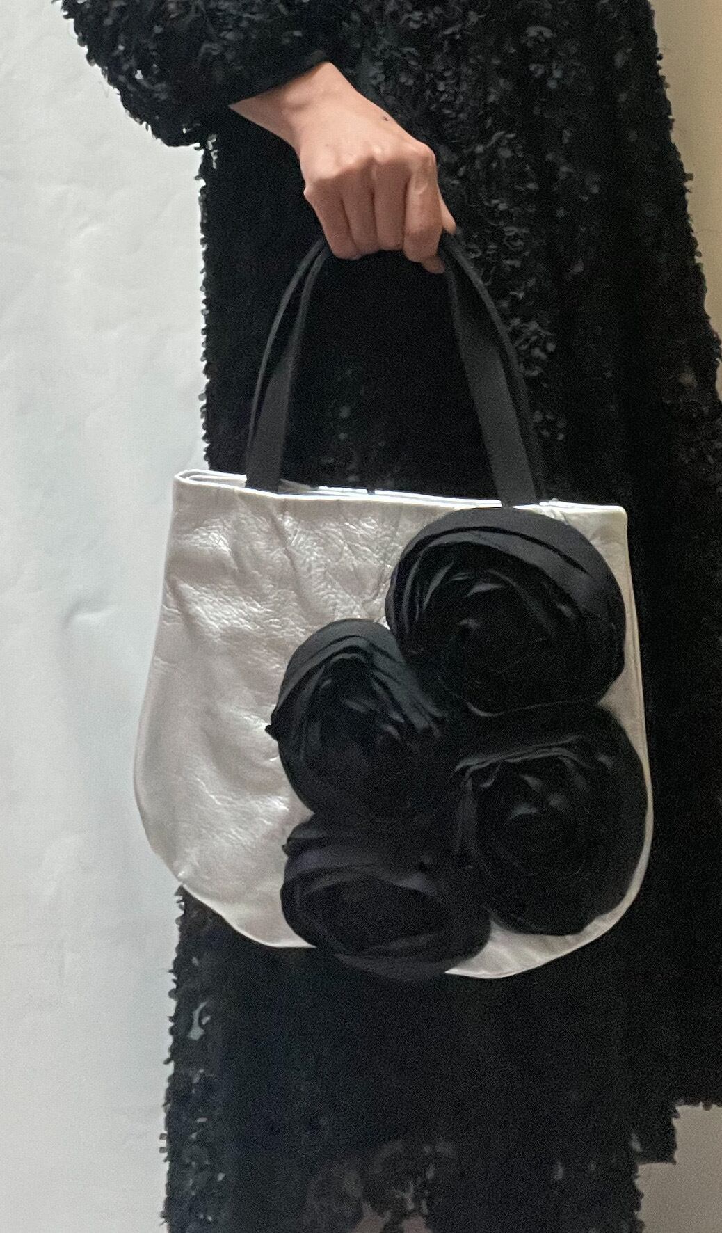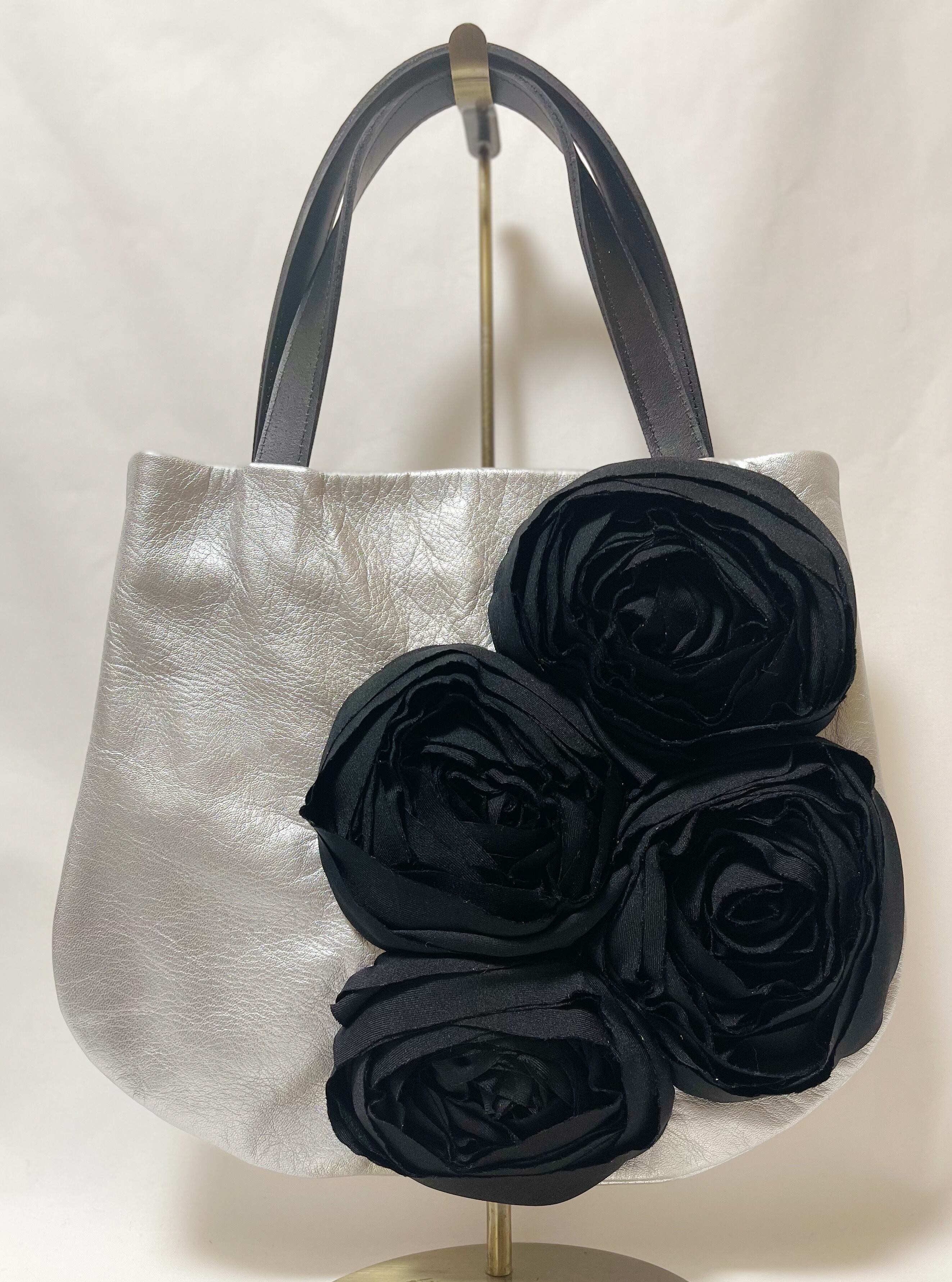ボリュームのあるブラックローズがアイコンのレザータイプのトートバッグにミニタイプが登場です。