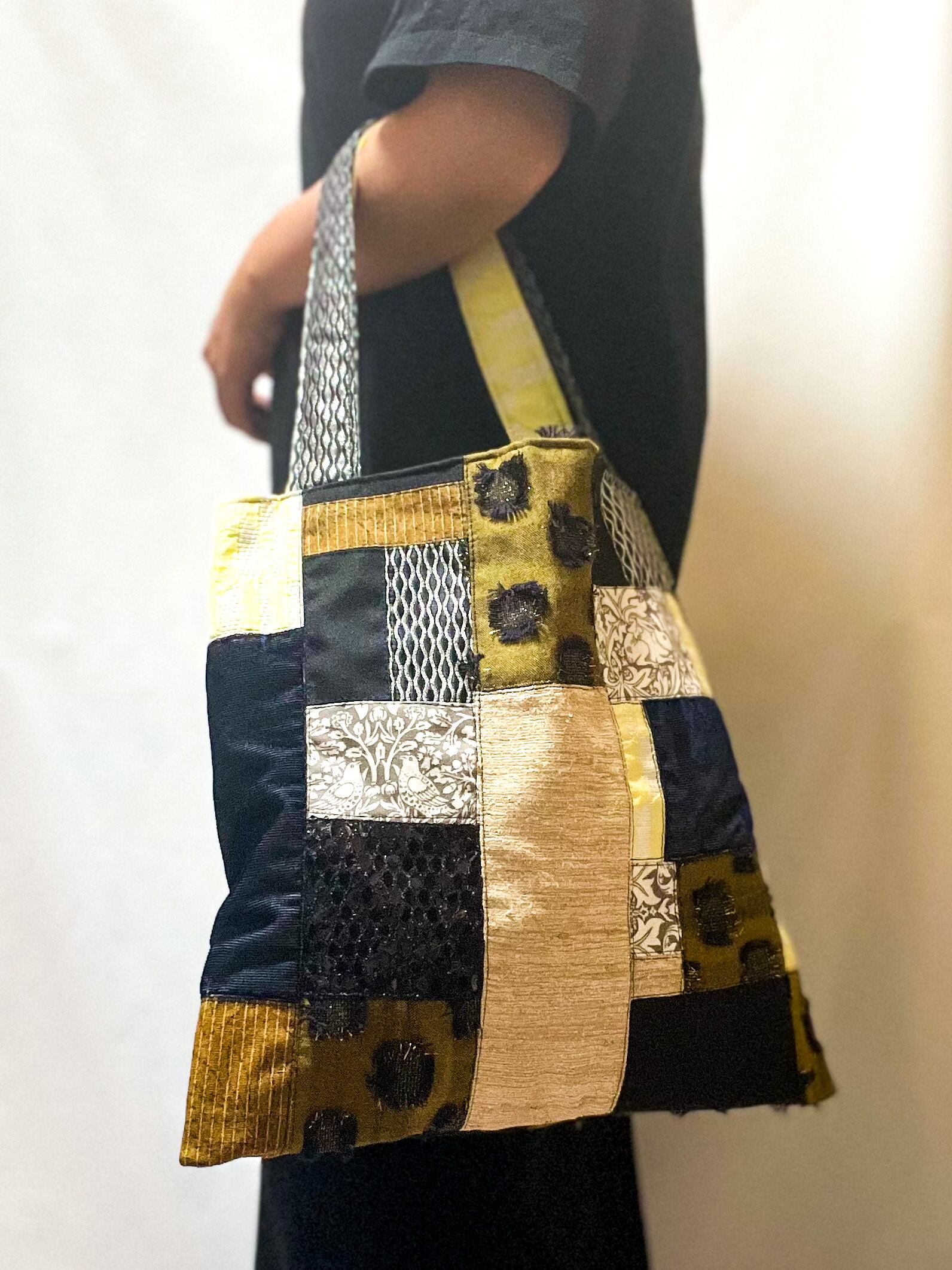 本来は廃棄されてしまう端材を新しい素材と組み合わせてパッチワークし、新しい型に仕上げた a Linden:tree オリジナルのサスティナブルな小さめマチなしタイプのエコトートバッグです。