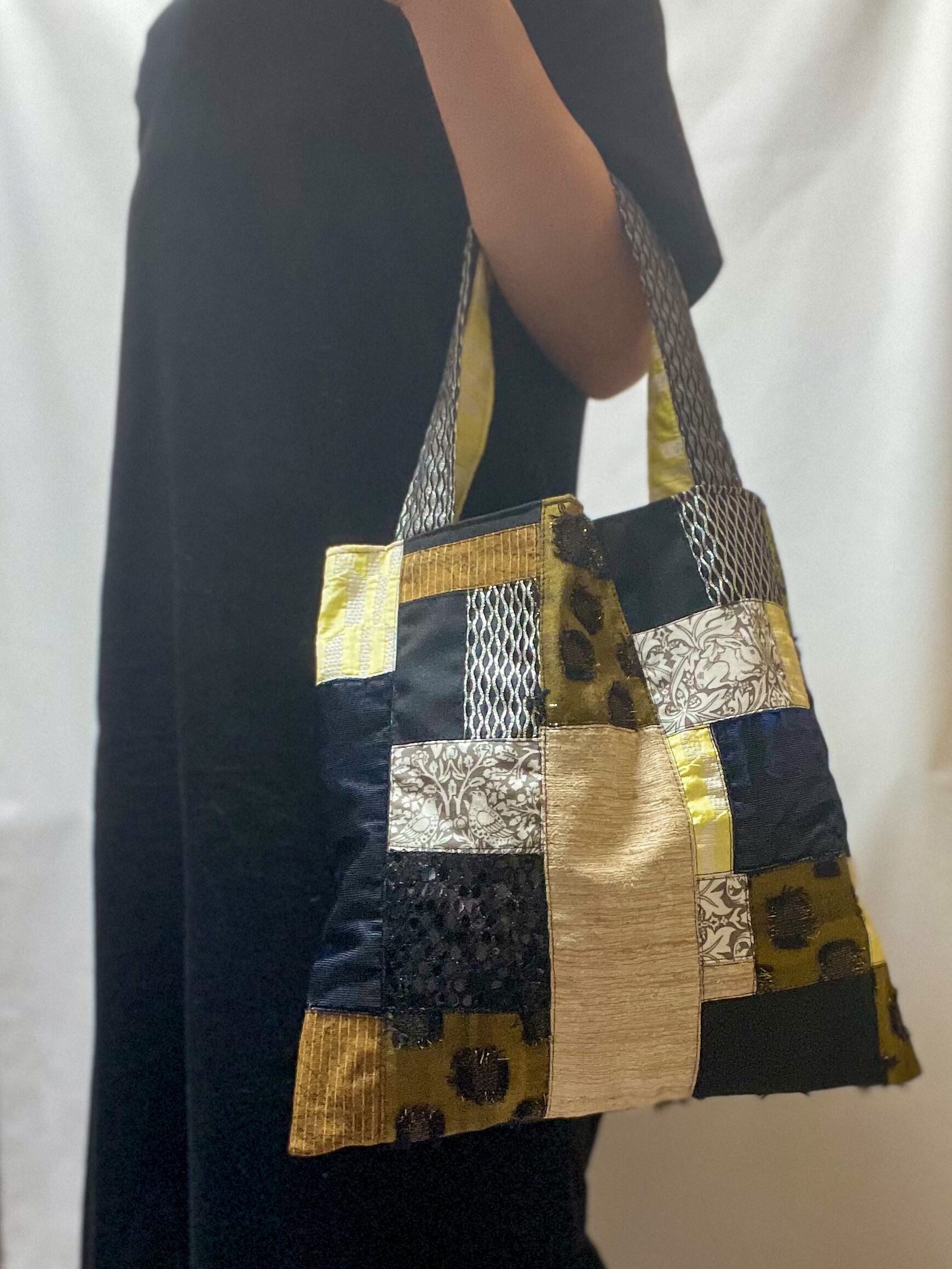 エコバッグSサイズ・ サスティナブルパッチワーク#ベージュ*ブラックver ①
