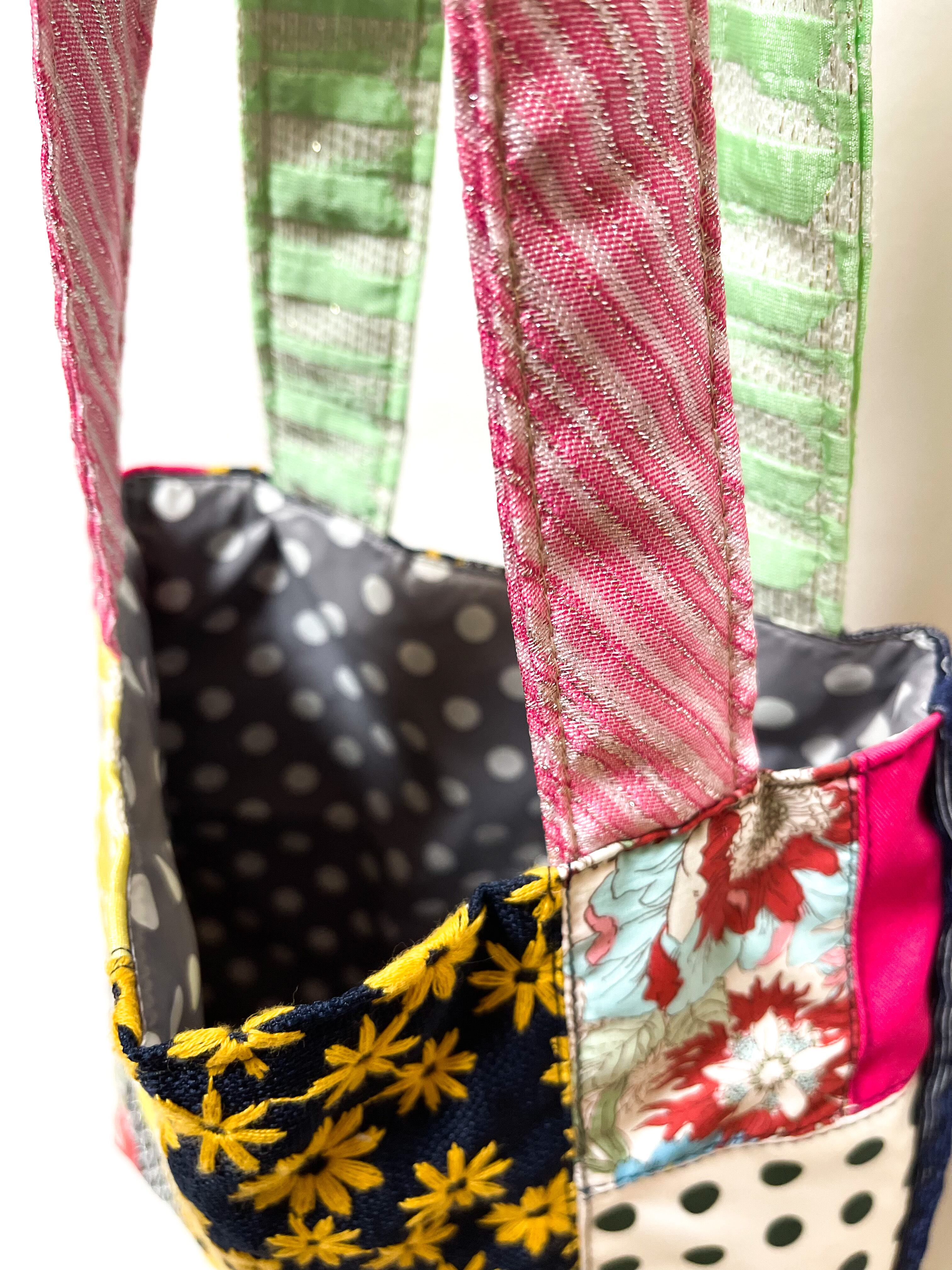 本来は廃棄されてしまう端材を新しい素材と組み合わせてパッチワークし、新しい型に仕上げた a Linden:tree オリジナルのサスティナブルな小さめマチなしタイプのエコトートバッグです。