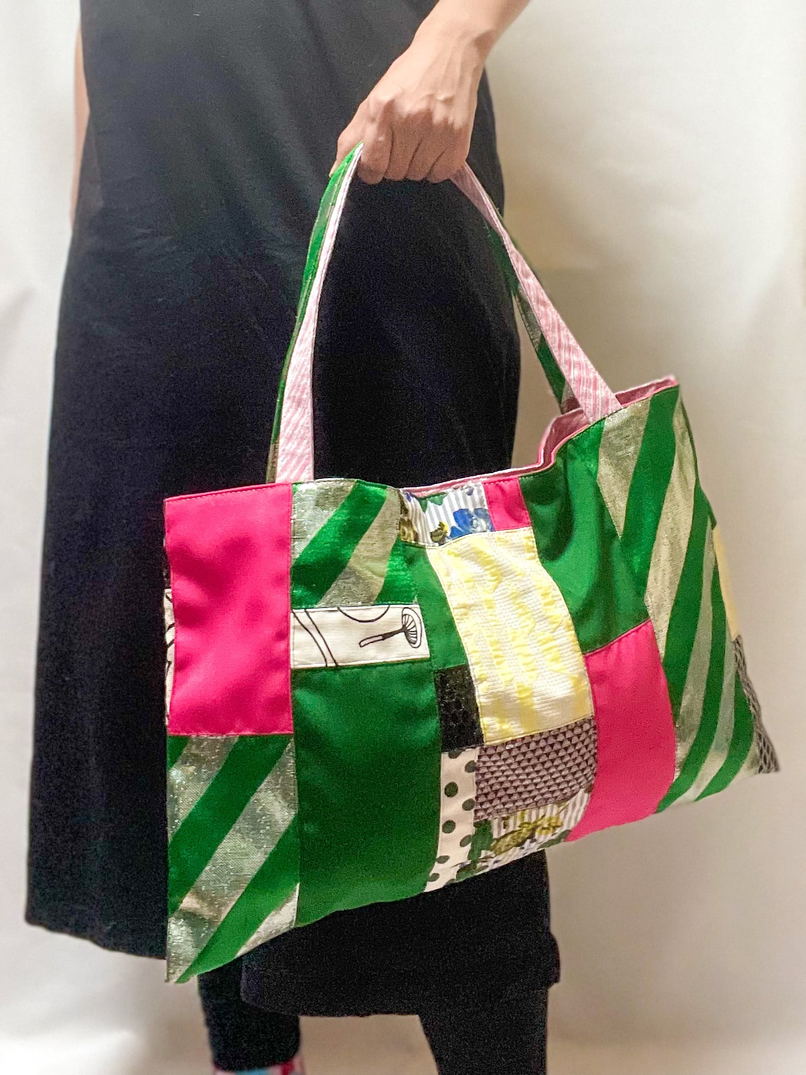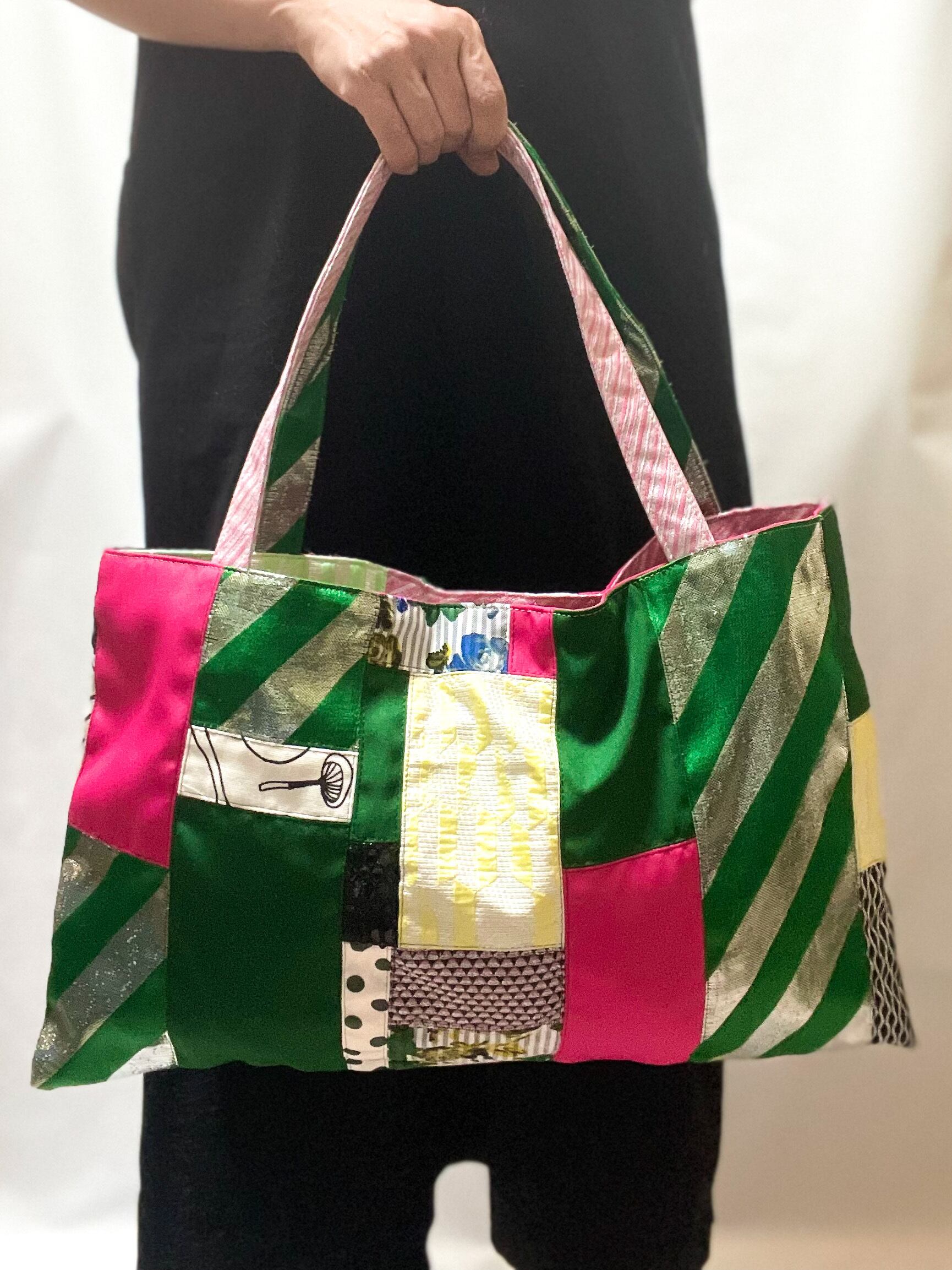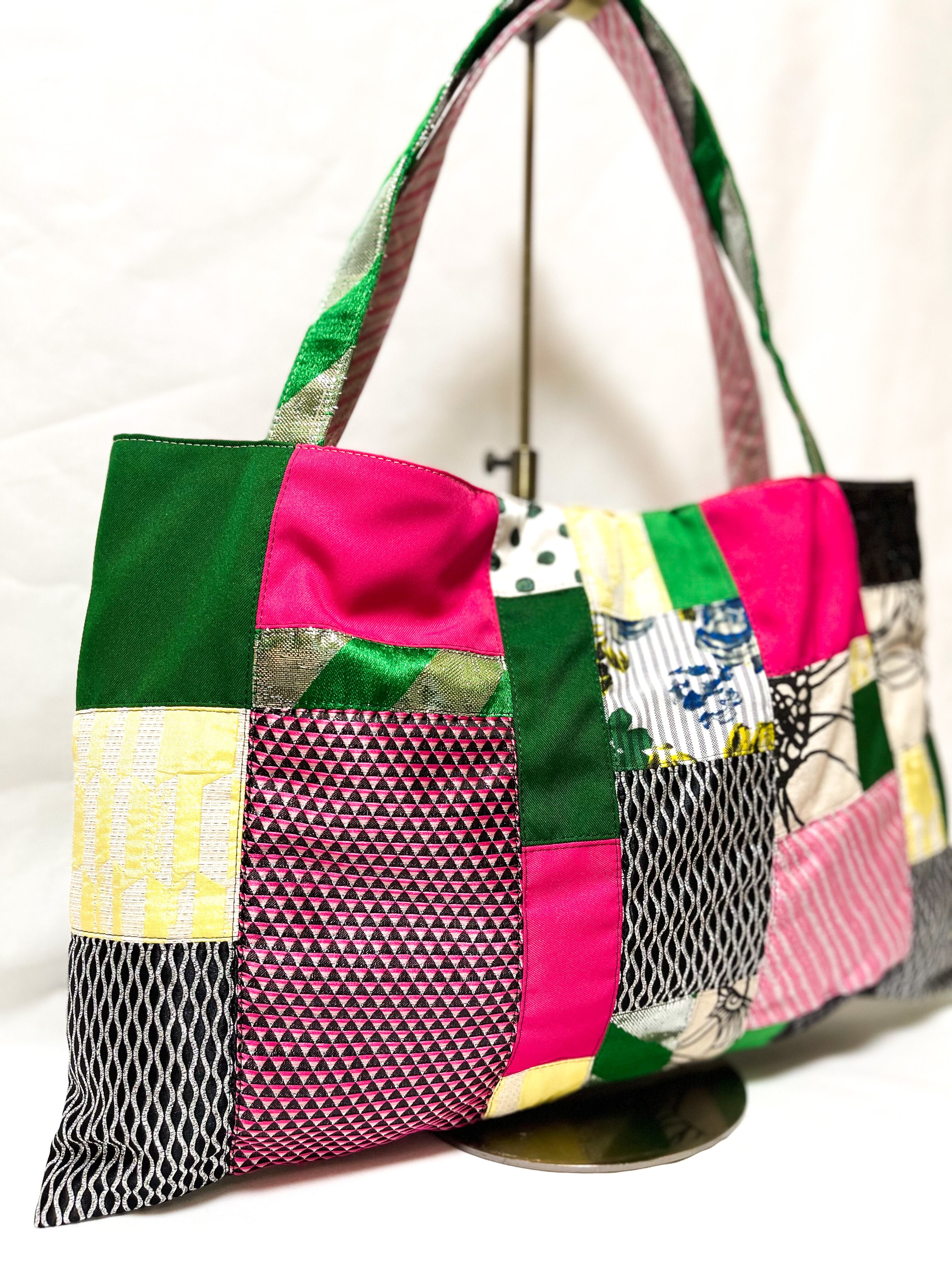 エコバッグMサイズ ・サスティナブルパッチワーク#グリーン*ピンクver ③