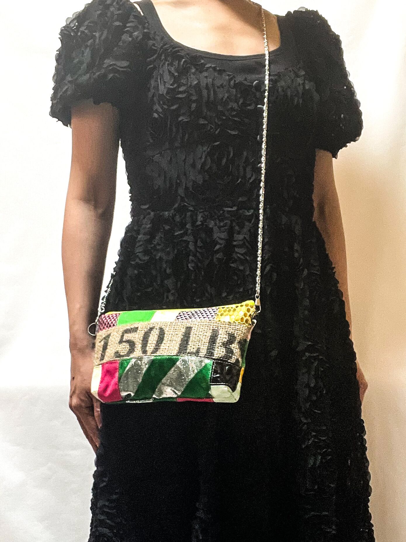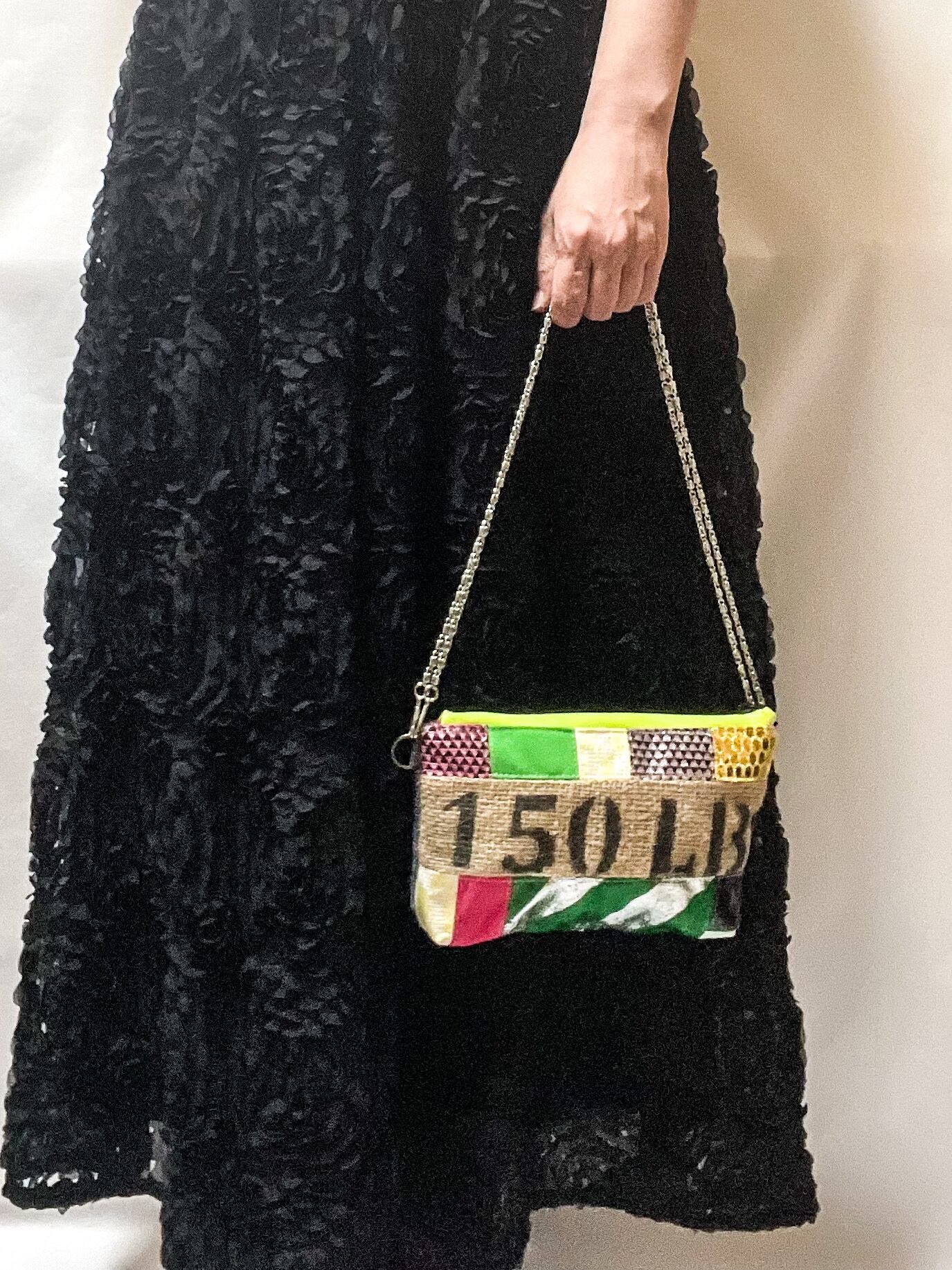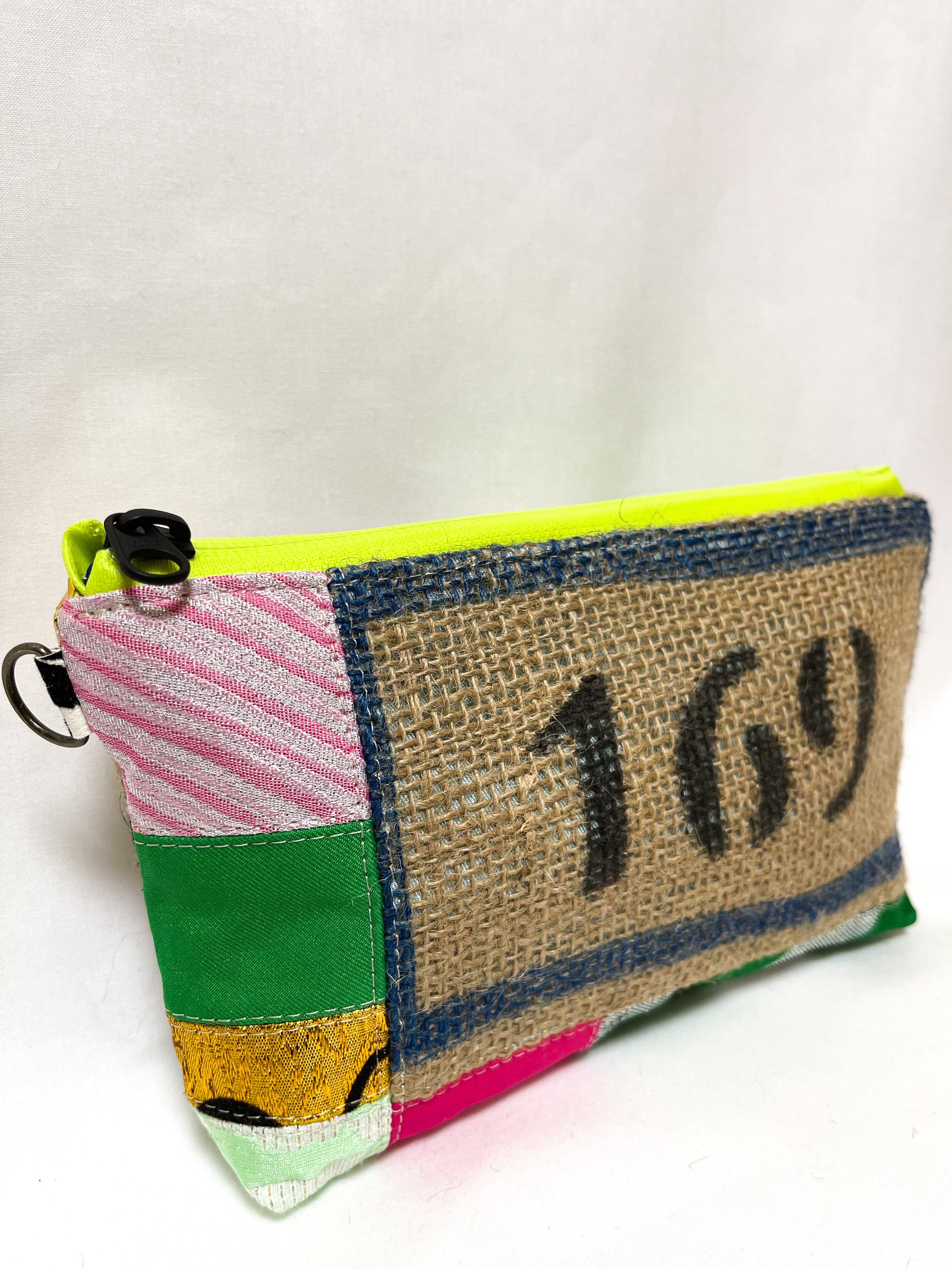 コーヒーの麻袋と本来は廃棄されてしまう端材や新しい素材などを組み合わせパッチワークし、新しい型に仕上げたました。