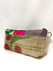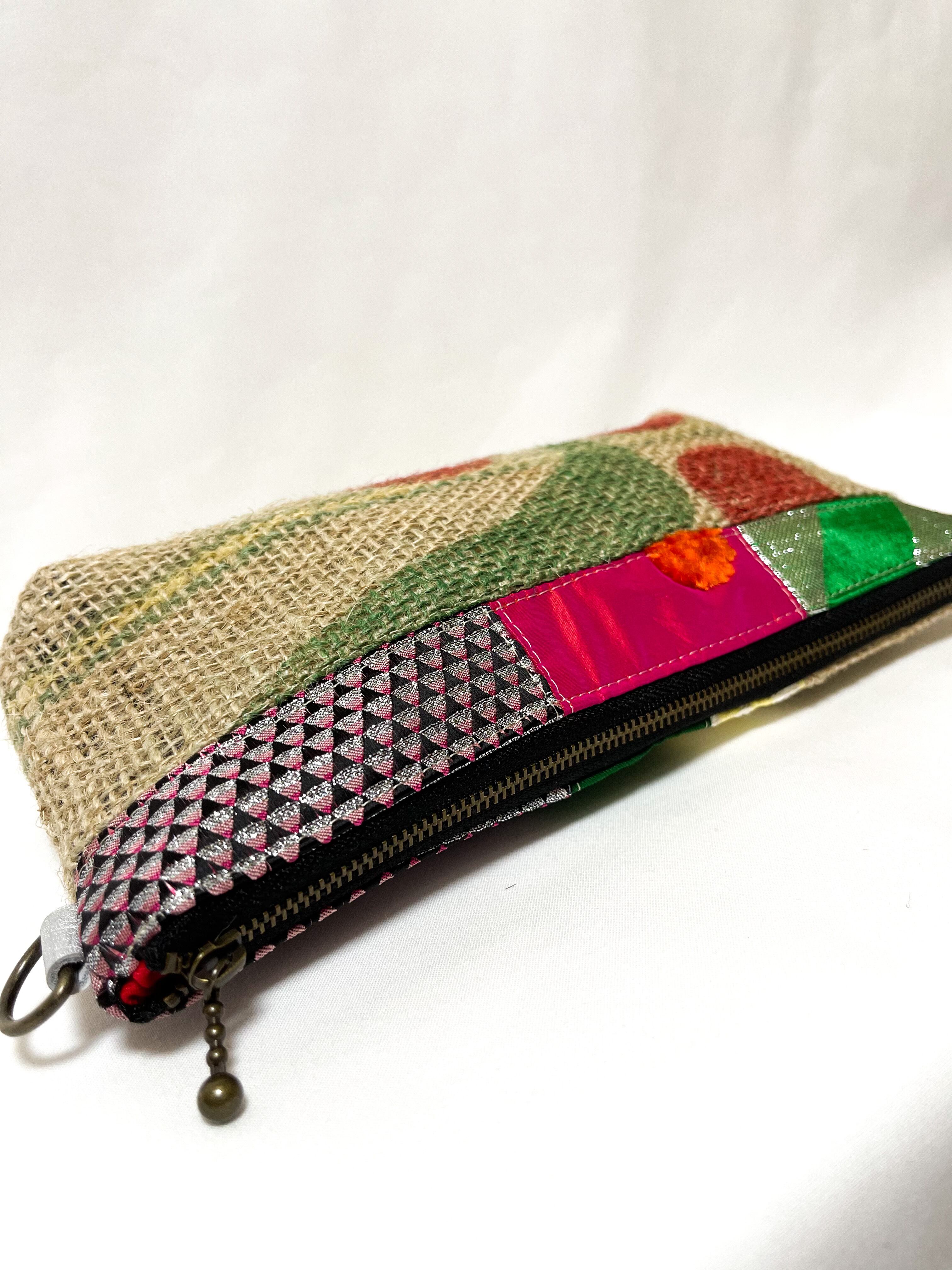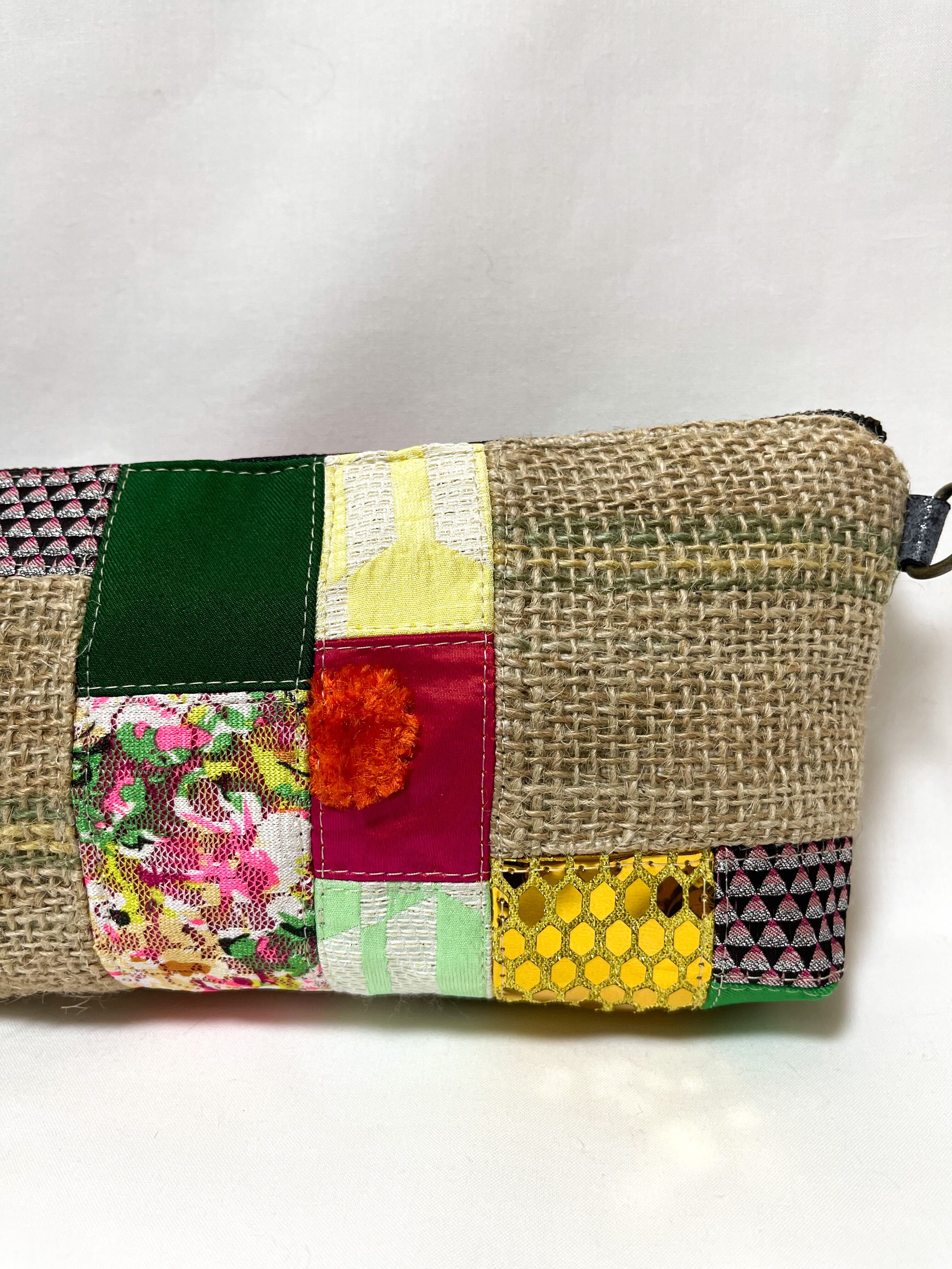 サスティナブルパッチワークポーチ横長Sサイズ ①#グリーンMix / チェーン付き