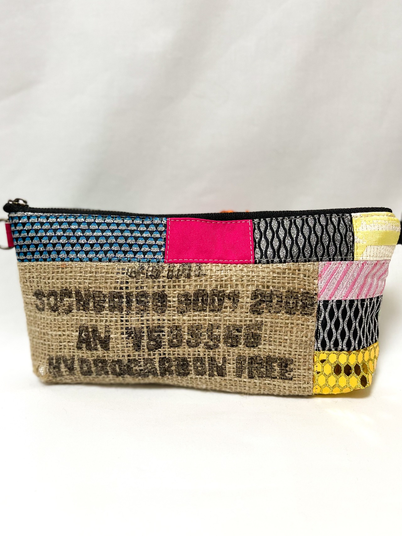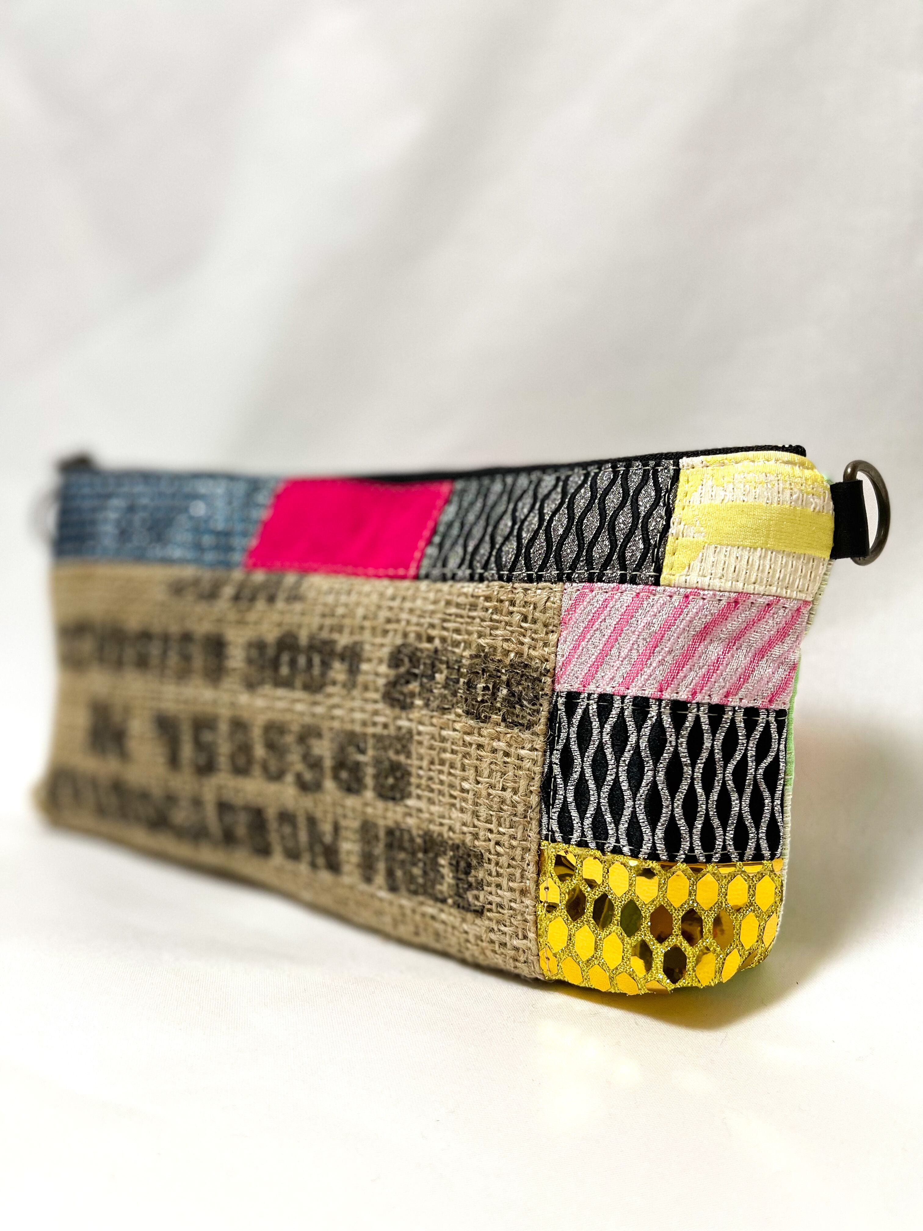 コーヒーの麻袋と本来は廃棄されてしまう端材や新しい素材などを組み合わせパッチワークし、新しい型に仕上げたました。