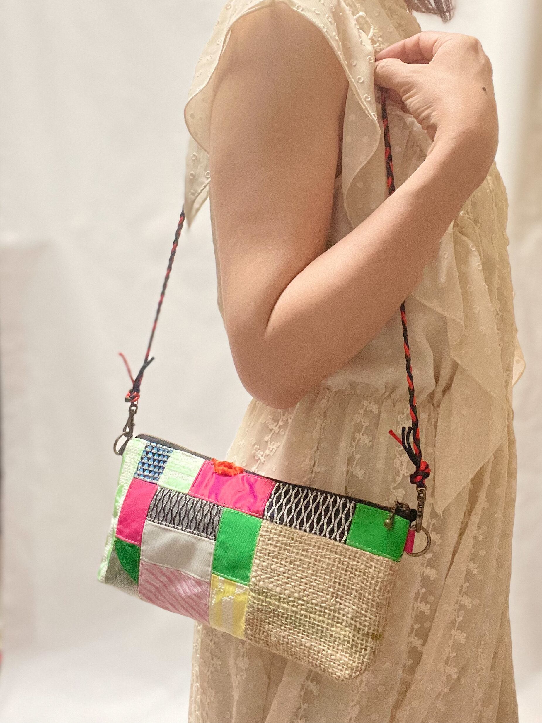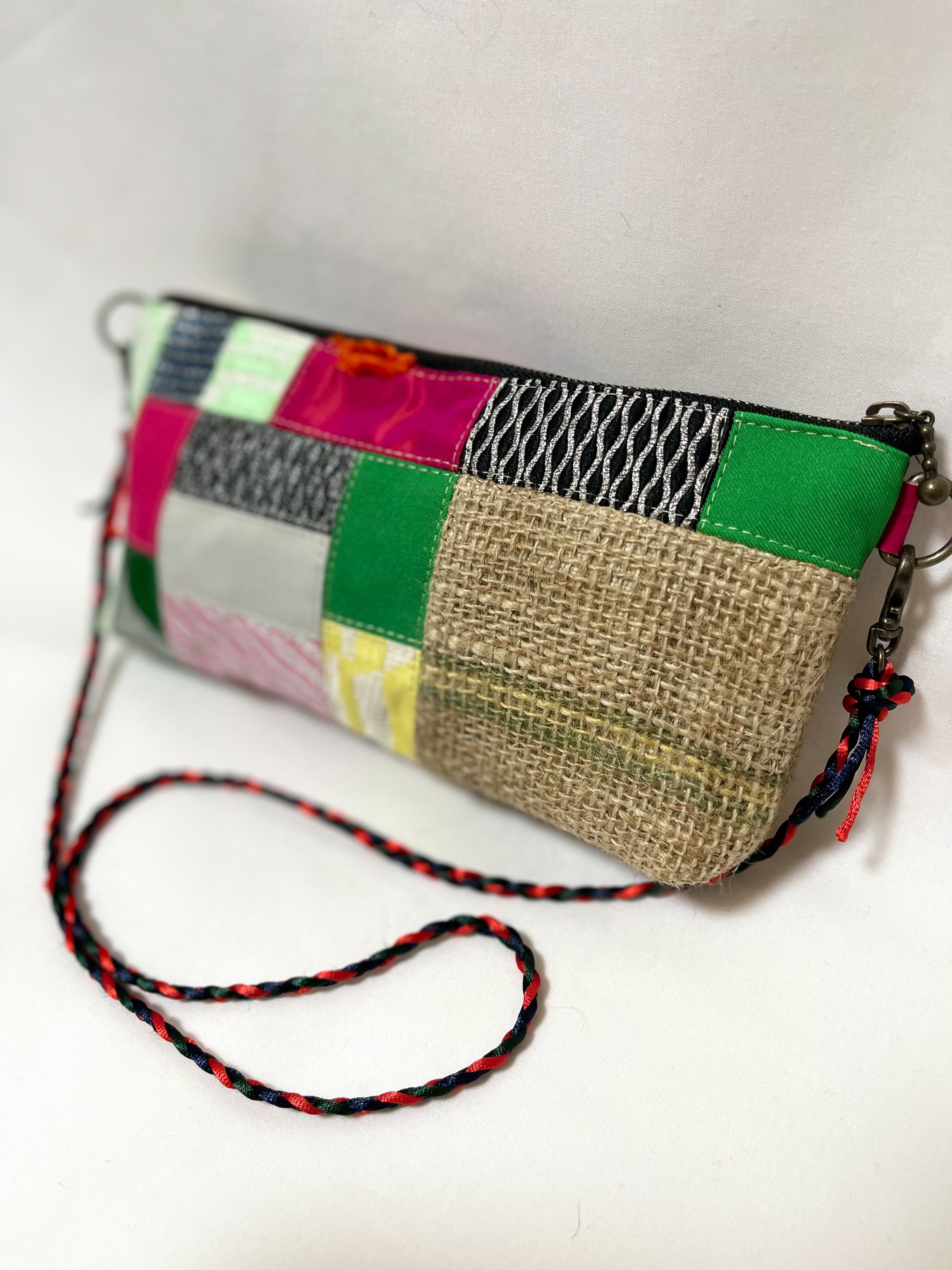 サスティナブルパッチワークポーチ横長Sサイズ ②#ブルーMix / チェーン付き